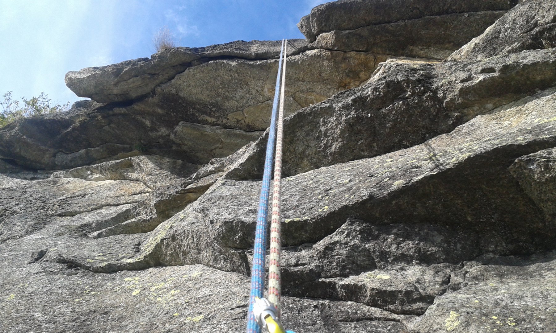 L1: 5c Diagonale verso sinistra, non difficile. Superare una prima via che sale(S’il vous plait l’addition) ed arrestarsi alla sosta pochi metri piu’ a sinistra dove parte un bel diedrino.