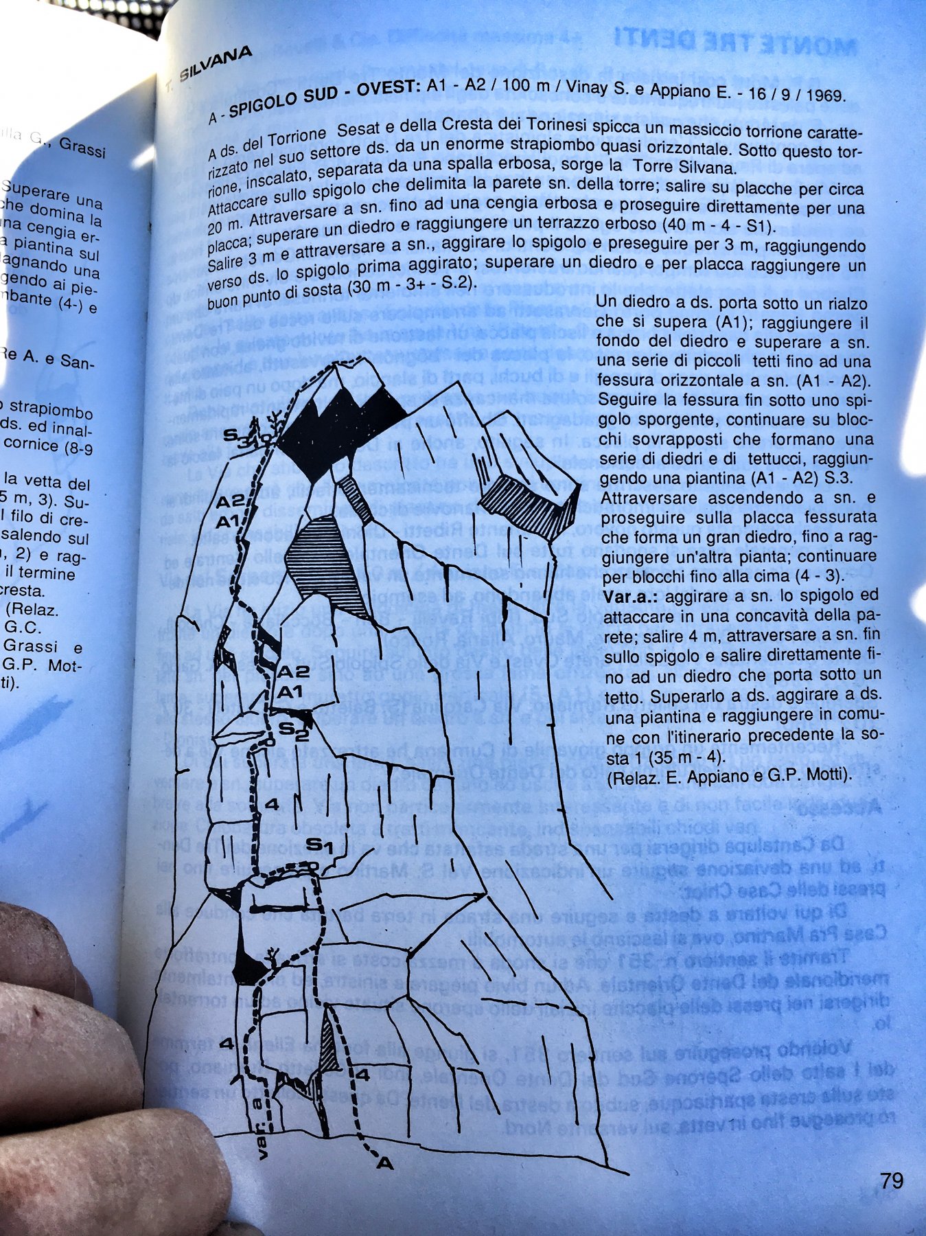 Erroneamente denominato “Torrione Ultimo “ si tratta invece della nota Torre Silvana salita la prima volta nel settembre 1969 da Enzo Appiano e Silvana Vinay a cui dedicarono il nome. Schizzo e descrizione della via sono riportati in ben 3 monografie ; dalla prima storica di Motti poi successivamente nelle altre edizioni di Costa, Gully, e Carbone.