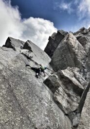 - L3: Un difficile passo in fessura fa accedere ad un diedro appoggiato poi placca a sx ; si continua superando due tettini , poi un diedro e si traversa a sx. per fessura sino a raggiungere la vecchia sosta originale, che si tralascia per salire ancora dritti qualche metro alla nuova sosta (2 spit e maillon).