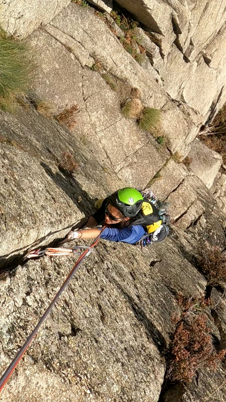 - L4: verso destra in facile traverso, poi strapiombo fisico (un passo duro, sopra ammanigliato ma tocca arrivarci, ma volendo si bara con un friend 0.3-0.4 BD), diedrino-fessura plaisir e poi la splendida fessura da incastro di mano-piede-dita-braccio che conduce alla salvezza, spit ma volendo si protegge o integra (da 0.5 a 2 BD). Fessura che aveva richiesto agli apritori un gran lavoro di pulizia, prima era solo terra, ora godimento. 28-30 metri, 6a-6a+, con passo di 6b+ (maforse6c) per lo strapiombo.