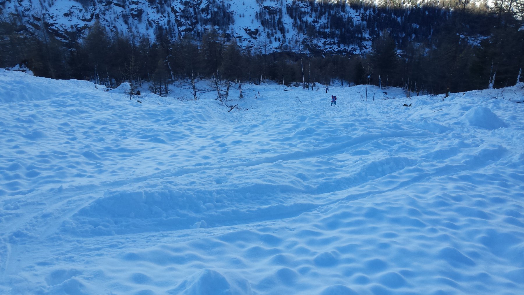 Si parte e si arriva con gli sci ai piedi. Il bosco è un po’ da cinghiali, ma per ora rimane discreto. In alto la neve è polverosa e molto profonda…bellissima da sciare. Per fortuna chi è salito nei giorni scorsi (forse per un rilievo) aveva già tracciato 2/3 di gita. Impressionante la valanga che si è staccata dal Piccolo Paradiso. La cosa eccezionale non è tanto la quantità di neve del suo accumulo, ma i km che ha percorso prima di fermarsi. La valanga è arrivata fin sotto le baite dell’alpeggio de Lavassey (2194 mt slm), scendendo/superando pendenze modeste e vari pianetti che, fino a ieri, avrei considerato assolutamente sicuri.