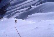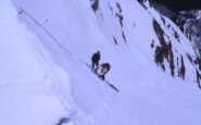 Entrati nel canale all’inizio stretto lo si risale 45° via via più ripido si allarga 50°. In alto torna a stringersi e a formare un imbuto solitamente chiuso da una cornice. La difficoltà sta nell’uscita a seconda della quantità di neve e della cornice da 60° a /70°. Per scendere dal Passo del Cancellino sentiero 121 per Segavecchia.