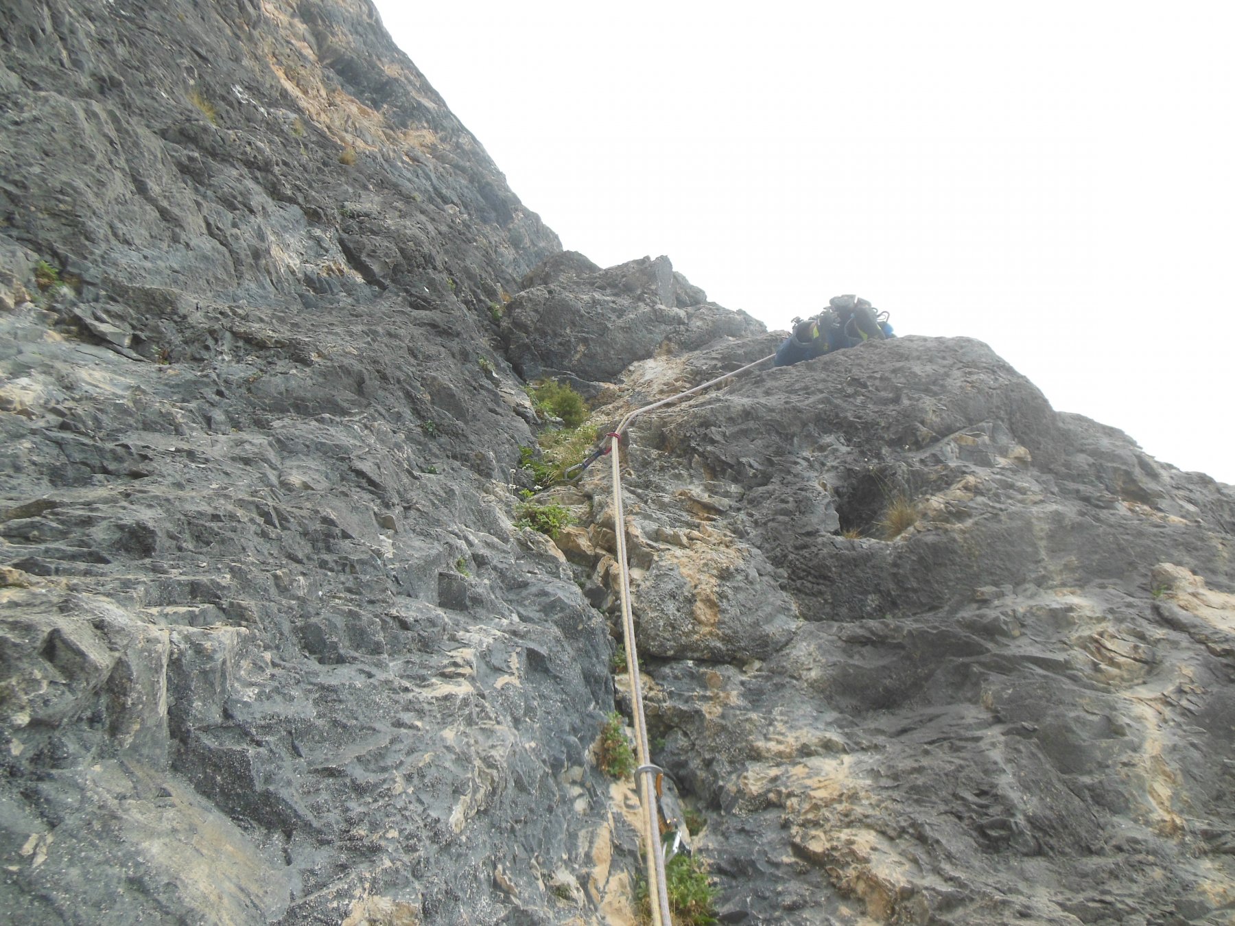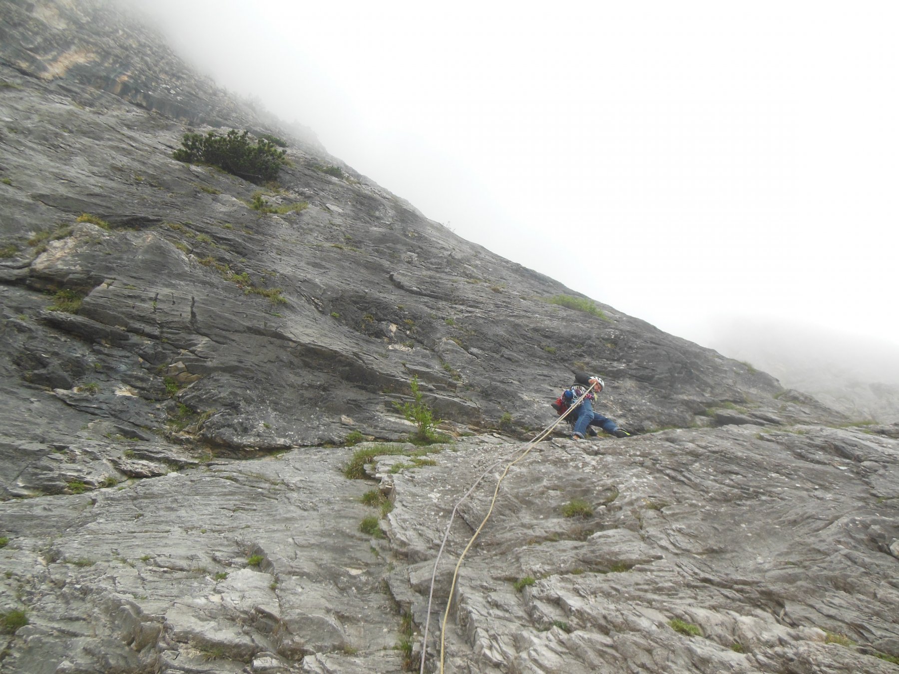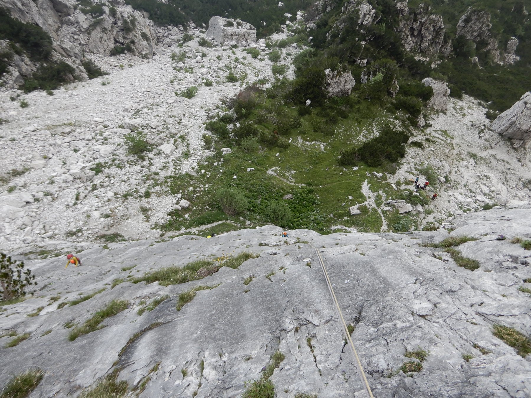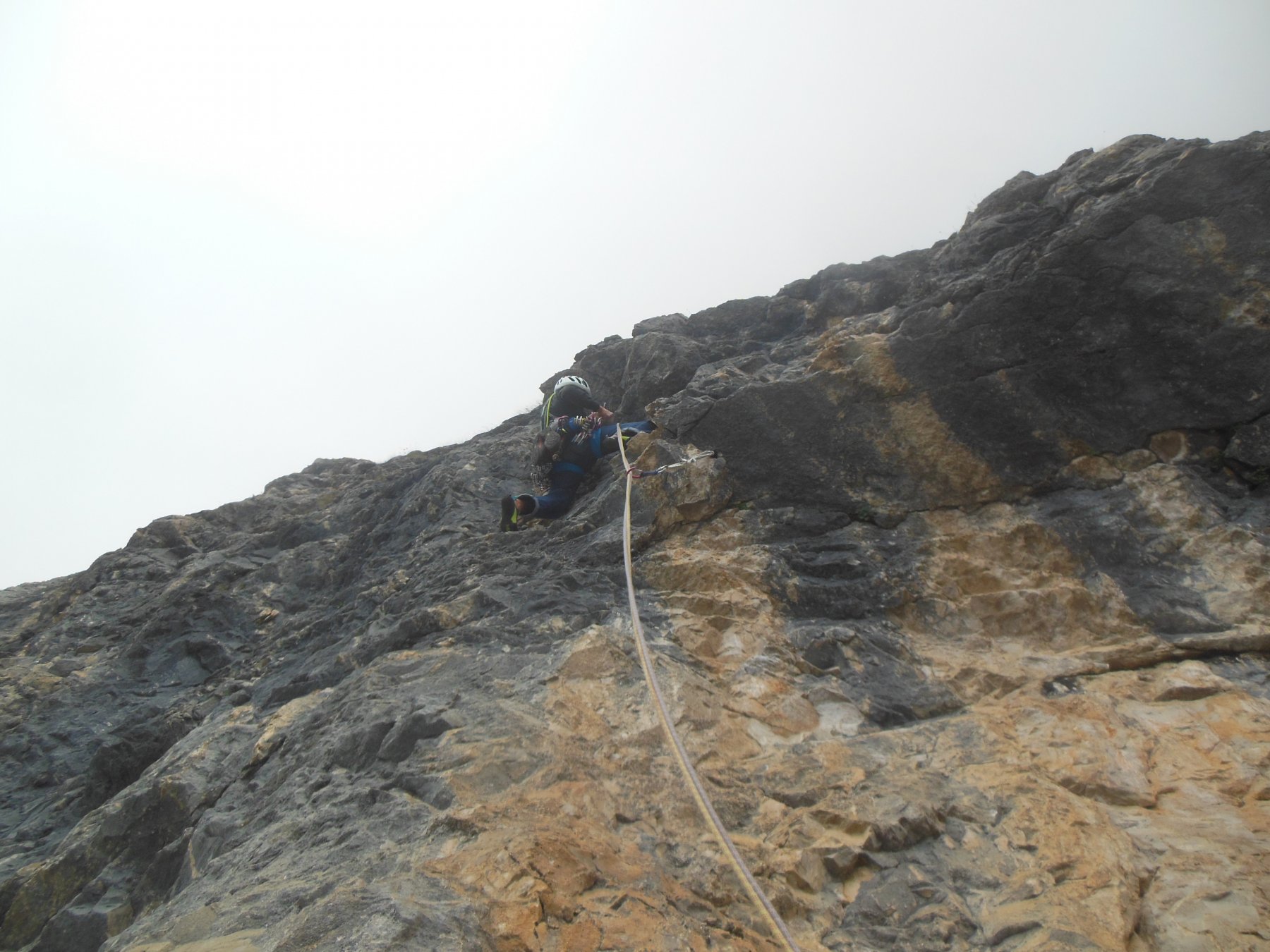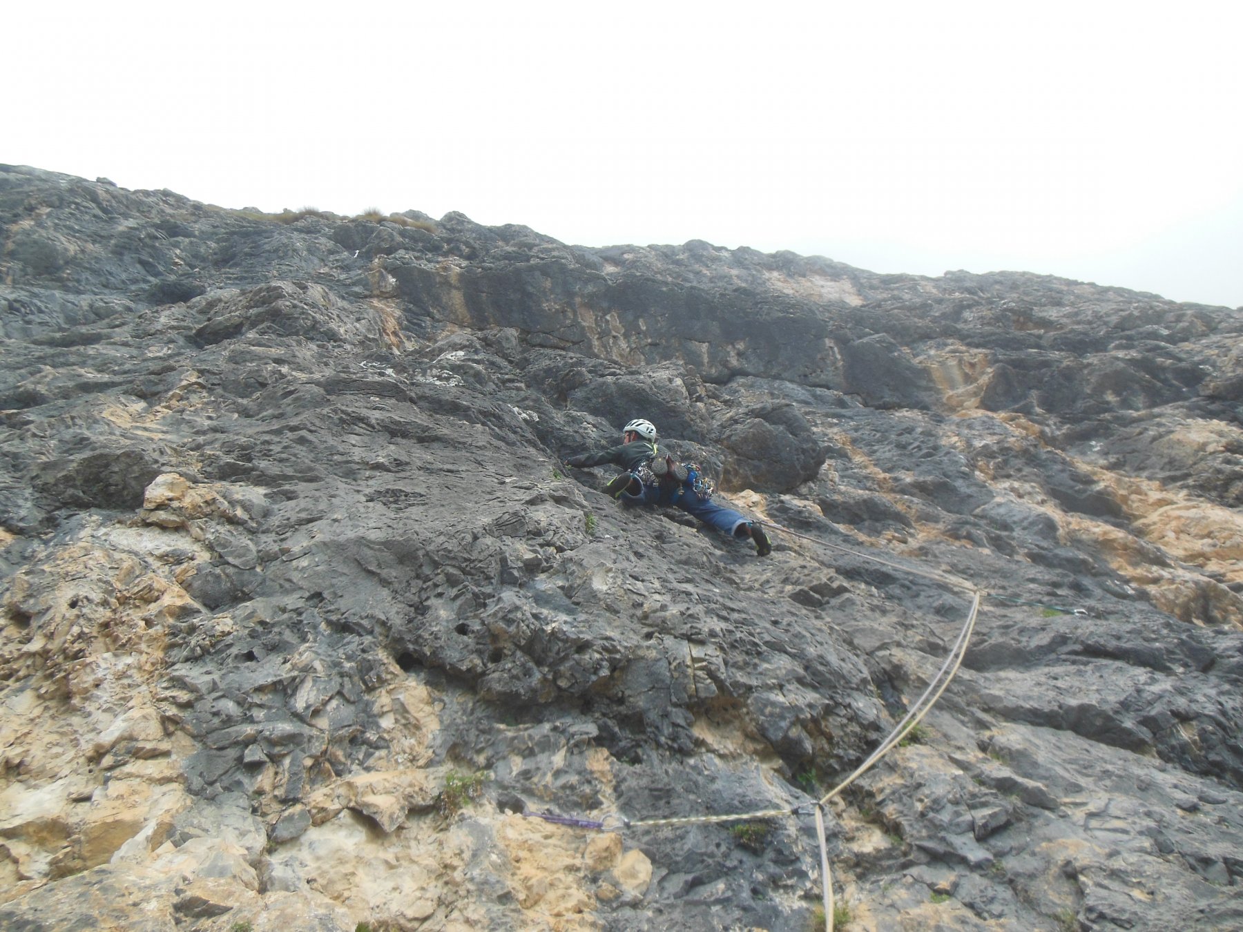 La prima parte della via non è assolutamente facile da trovare, bisogna stare a dx della linea di fix e chiodi della via Settimina, cercando con diversi dx e sx di trovare la linea più facile: puntare comunque ad un grande mugo vicino ad una cengia erbosa, sosta su due clessidre e cordone. Da qui mantenersi su un pilastro a sx della via Settimina e puntare poi ad un pilastro con una lunga ascesa verso dx, grande clessidra di sosta. Da qui stare a sx del pilastro su placca verticale (chiodo) e poi rientrare a dx (possibilità di sosta su 1 fix +1 golfare) e proseguire fino alla cengia mediana, sosta su 2 fix oppure più a sx su 1 chiodo originale di via. Da qui reperire una fessura erbosa, attacco della seconda parte della via: ora è più difficile sbagliare.