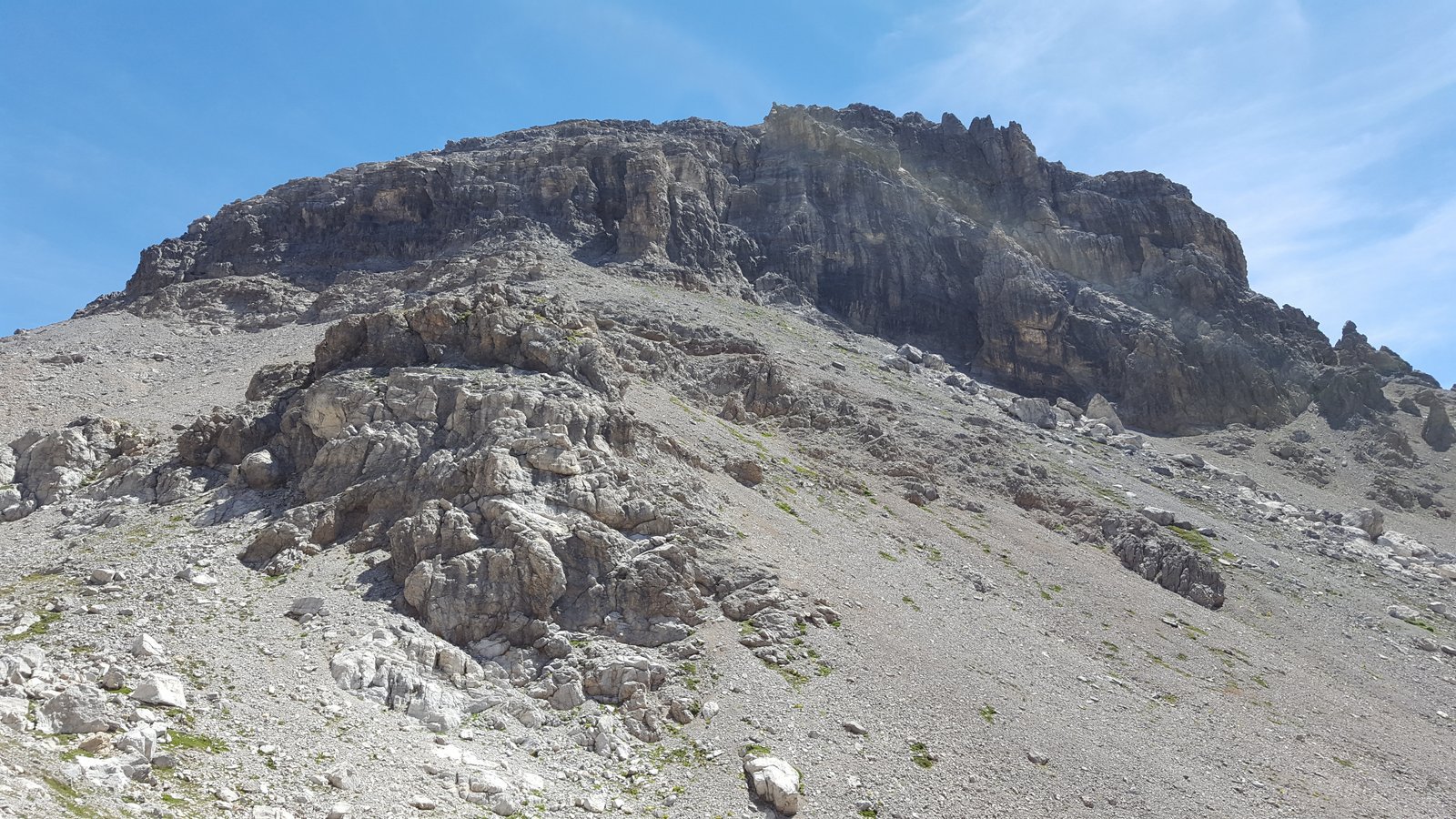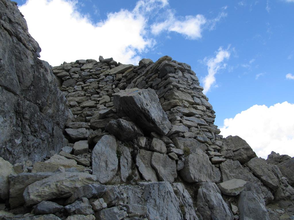 Usciti dalla galleria riprende il sentiero, tra roccette e detriti (attenzione al fondo un po’ scivoloso) e superati alcuni tratti con muretti e trincee si perviene all’ampia cima con la croce, sono presenti molte opere belliche, tra cui un’altra galleria che collega i versanti nord-sud della montagna.
