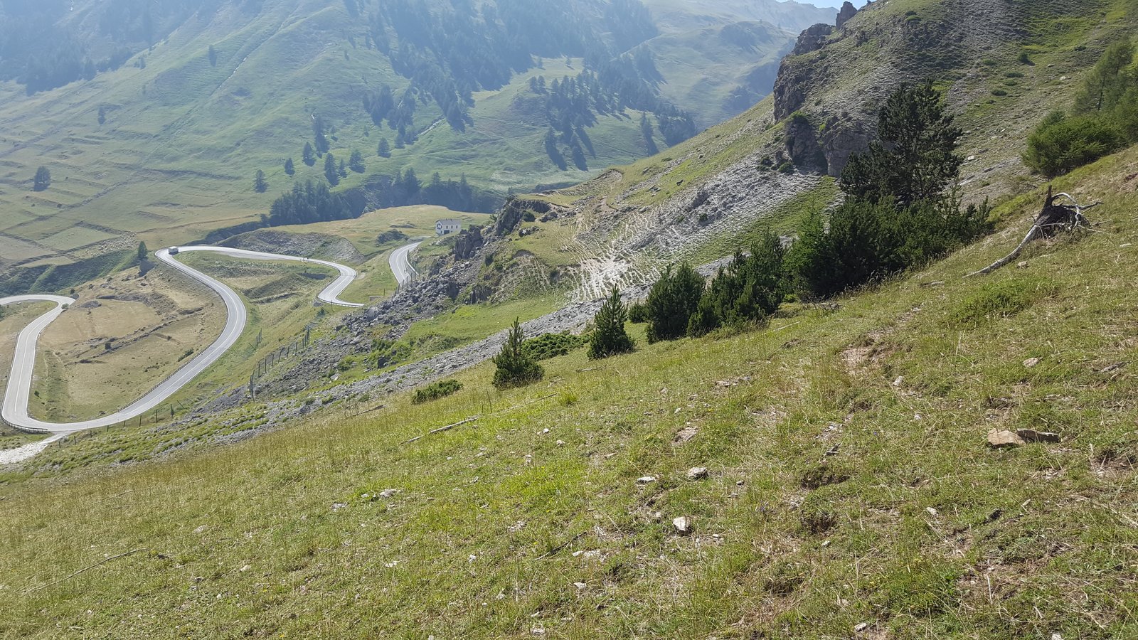 Sulla sx ci si trova un ripidissimo pendio di erba e terra in cui sono sistemati dei paravalanghe, si prosegue dritto e si attraversa alla meglio un canalone di sfasciume fine, la traccia continua sul lato opposto inoltrandosi poi nel bosco di conifere e divenendo via via più visibile e omettato.