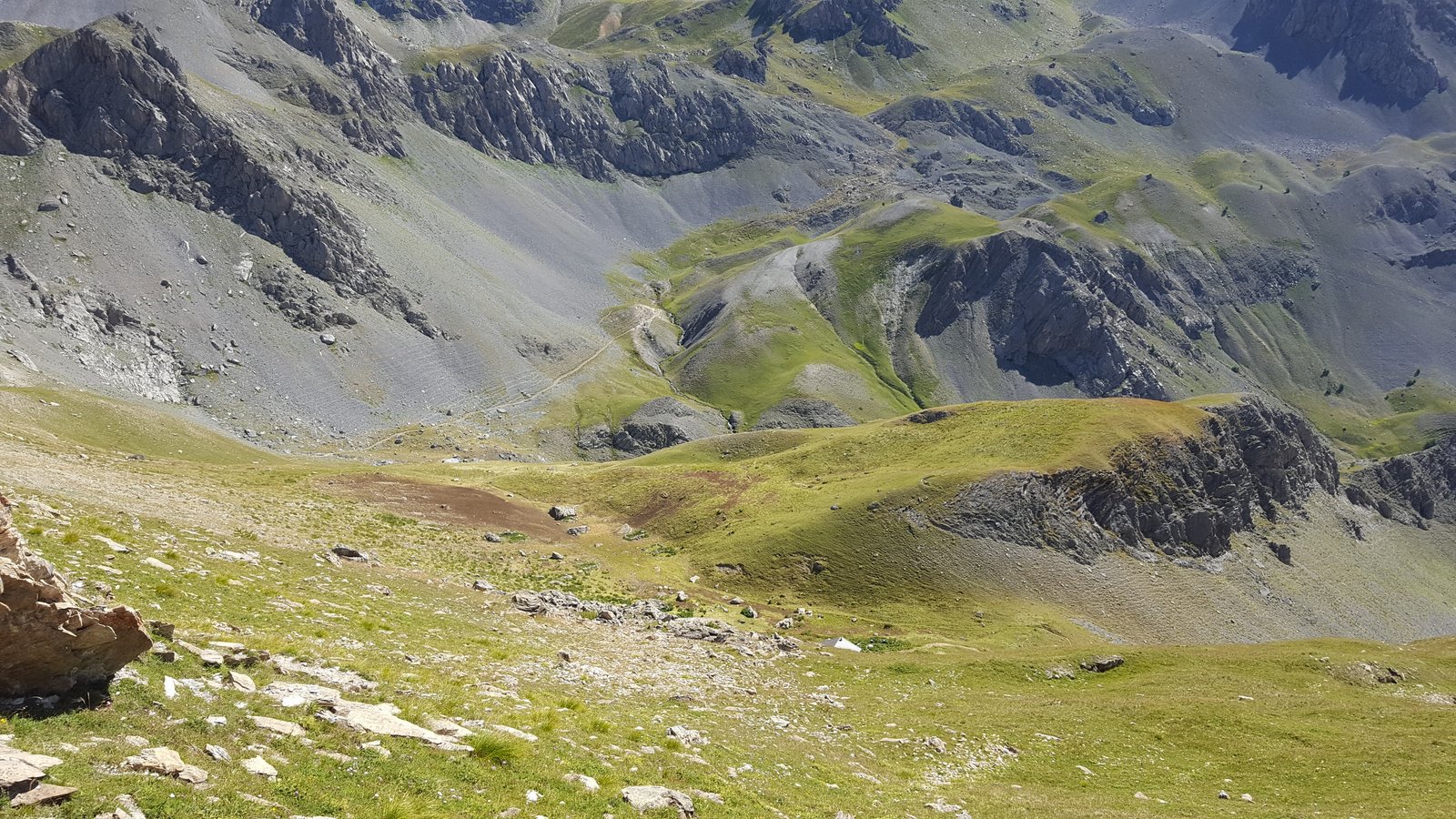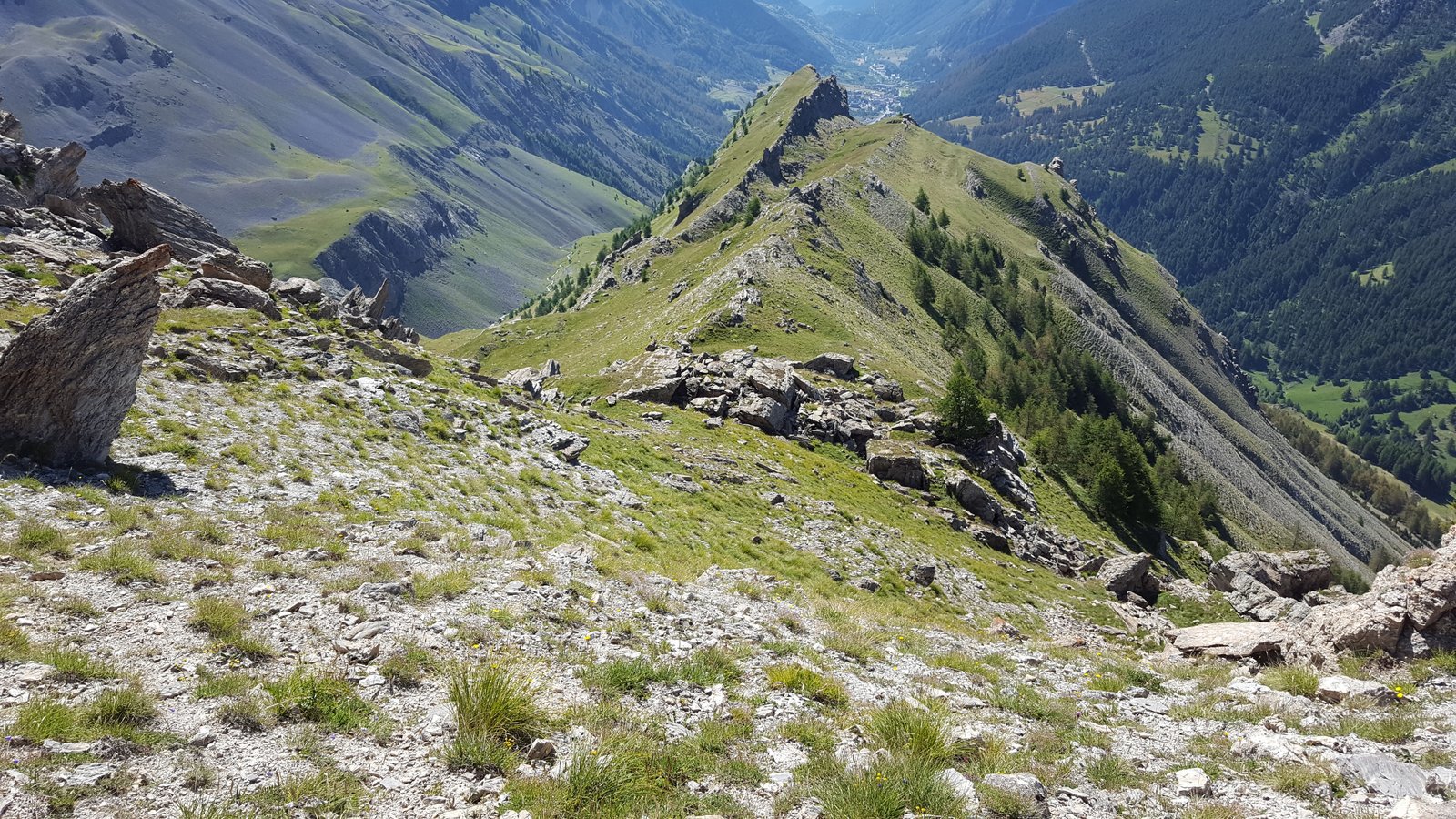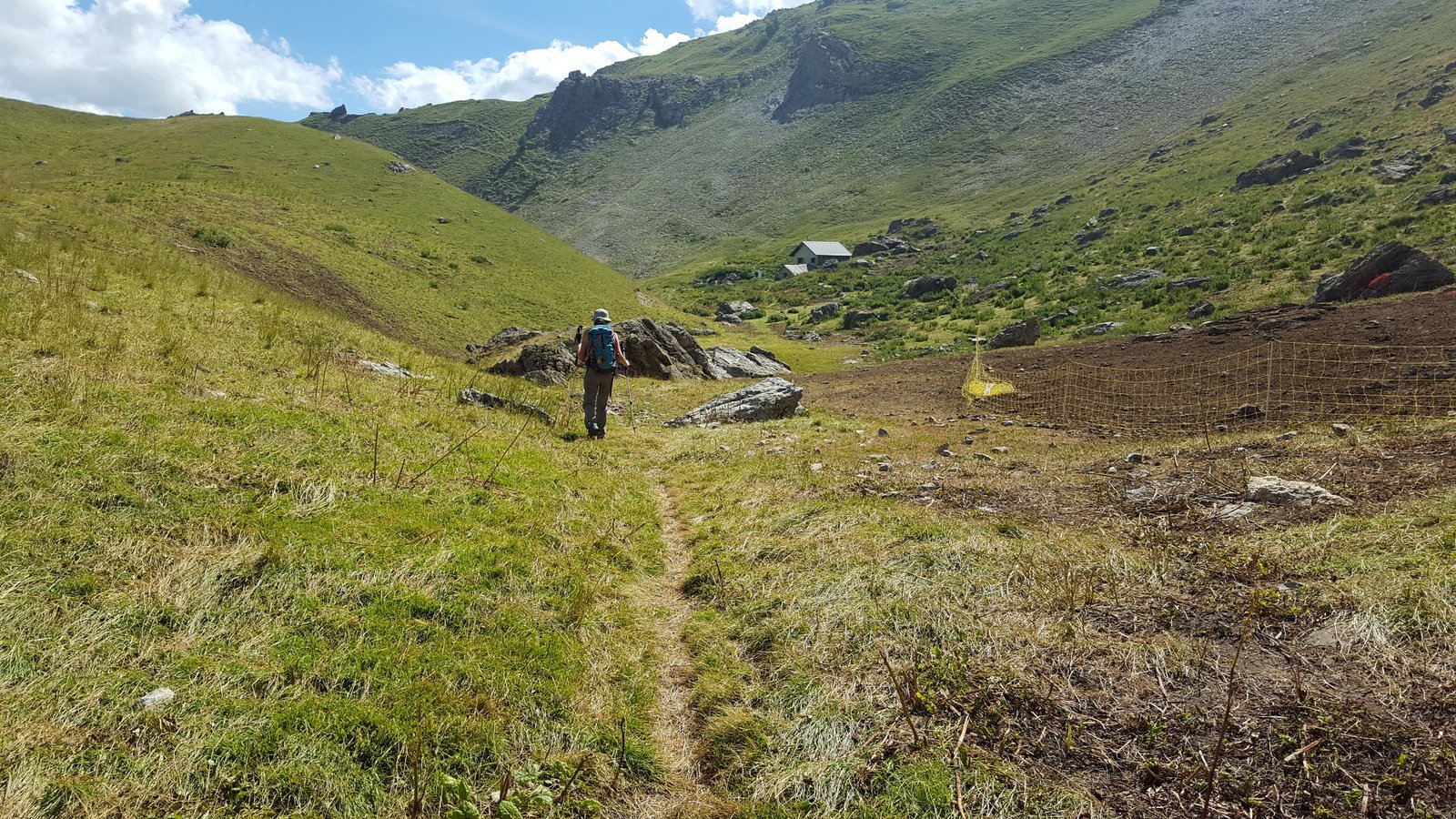 Qui la dorsale erbosa proveniente dal Bric della Sabbiera si biforca e la traccia si perde nell’erba: occorre attraversare la bifida dorsale per ritrovare il sentierino che scende in direzione di una malga e della larga mulattiera (P41) che sale da Argentera.