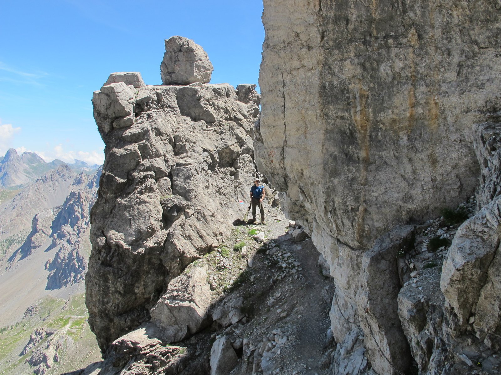 La discesa può avvenire per il percorso di salita, ma molto più consigliabile (in assenza di neve e con terreno asciutto) è percorrere verso est il Sentiero Cavallero, che dopo una prima agevole discesa sul crinale detritico, inizia un percorso suggestivo che si snoda tra torrioni, guglie e pinnacoli di grande varietà di colori. Si trova qualche passaggio su cenge rocciose sempre ampie ma con delle catene utilizzabili come corrimano. Solo un breve passo di disarrampicata (non esposto) richiede un po’ di cautela. Terminata la prima parte della cresta il terreno diventa detritico e scorrevole, scende più ripidamente su un pendio rossastro, quindi si perviene ad una sella ricca di guglie giallastre, che precedono un lungo traverso a mezza costa sul versante sud, ora ben sotto il filo della cresta sotto la Rocca Peroni.