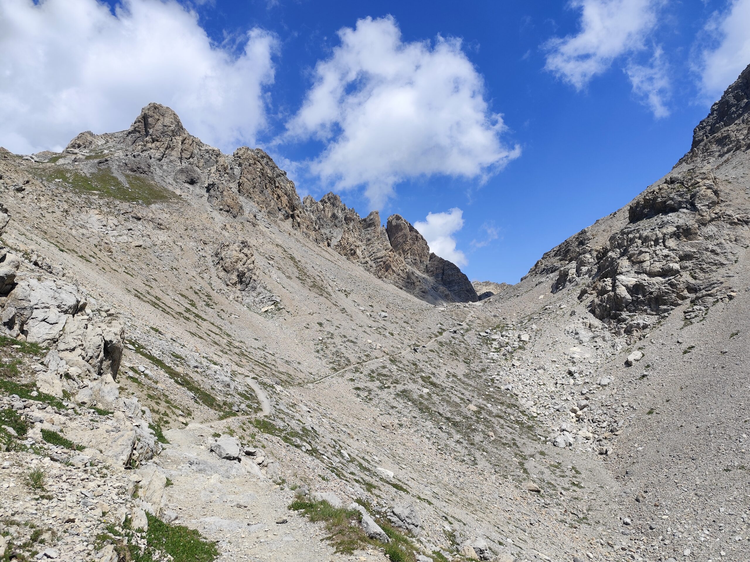 Raggiunto un dosso erboso, si entra in una stretta valletta che in poca pendenza conduce al Passo Scaletta 2614 m, dove si trovano le tacche rosso/blu del Sentiero Cavallero