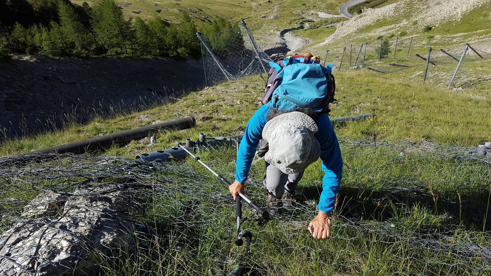 A causa del poco tempo a disposizione, decidiamo di salire dall’ex casa cantoniera sulla SS21 (q. 1850) anziché dal centro di Argentera. Il dsl è solo apparentemente inferiore in quanto dal Passo Pra di Bals (q. 2258) si perdono circa un centinaio di metri che vanno ovviamente risaliti al ritorno. Il sentiero P41 da Argentera è, inoltre, molto più marcato e in buone condizioni rispetto a quello che parte dall’ex casa cantoniera. Risultato: all’andata perdiamo clamorosamente il sentiero e ci inerpichiamo per circa 500 m di dsl sulla ripidissima china dove sono sistemati i paravalanghe, (scoprendo che si può anche arrampicare sulle reti metalliche semi-coricate!) del tutto ignari che la traccia del sentiero è appena poco più in là. Poi, dopo un piccolo pianoro, un altro pendio di erba e piccola pietraia ancor più ripido fino ad arrivare alla base della cresta rocciosa che origina dal Bric della Sabbiera. Da quel punto (q. 2300 circa) vediamo in basso la mulattiera che sale da Argentera e alla ns. destra (anche questo più giù) il Passo Pra di Bals. Discesa a raggiungere il P41 poi tutto come da relazione, ricollegandoci al sentiero che sale dal Colle Roburent al Passo Scaletta tramite una evidente traccia con ometti che si stacca dal sentiero per i laghi di Roburent poco prima del grande lago Superiore. Il passaggio nel piccolo tunnel non necessitava quasi nemmeno della frontale, data la fortissima luce proveniente dall’esterno. Sentiero Roberto Cavallero pulito e in ordine: lo abbiamo percorso oltre la vetta fin quasi sotto il Passo Peroni, dove si incontra il bivio con un sentiero parallelo al Roberto Cavallero che riporta al Passo Scaletta. Abbiamo seguito quest’ultimo per un tratto in discesa, per poi abbassarci su dolci declivi erbosi sino al lago mediano, dove abbiamo riguadagnato il sentiero P41. Giunti alla malga, a me è toccato il facile compito di scoprire com’è il sentiero per Argentera, mentre Alf è risalito al Passo di Pra Bals alla ricerca del sentiero perduto all’andata: la traccia che sale dalla malga è visibile, poi si perde un po’ nell’erba ma la si ritrova, dopo aver attraversato la bifida dorsale, al grande ometto su masso che indica il passo. Di lì in poi si fa più evidente e si trovano ometti, per poi perdersi di nuovo un po’ all’attraversamento del canalone ma ormai in vista della casa cantoniera. In ogni caso ho aggiunto una variante all’itinerario, nel caso qualcuno voglia ripercorrerla.