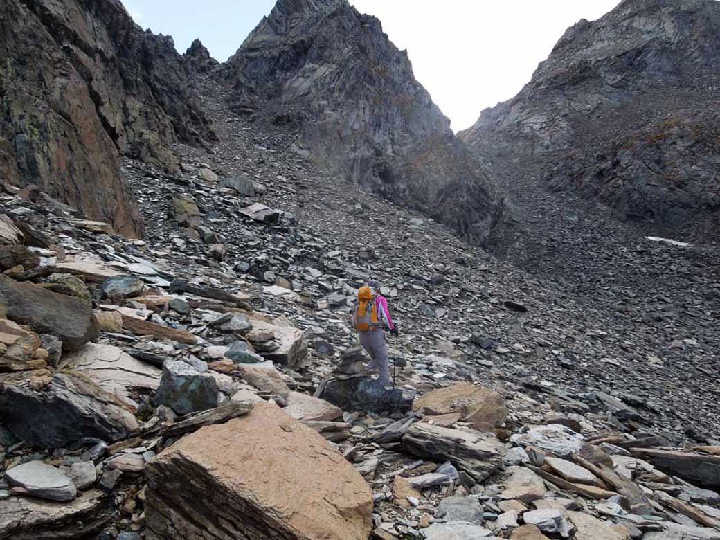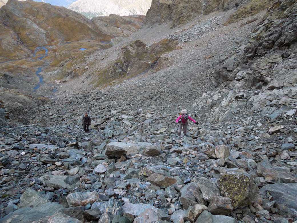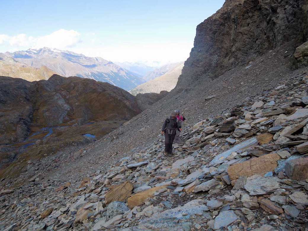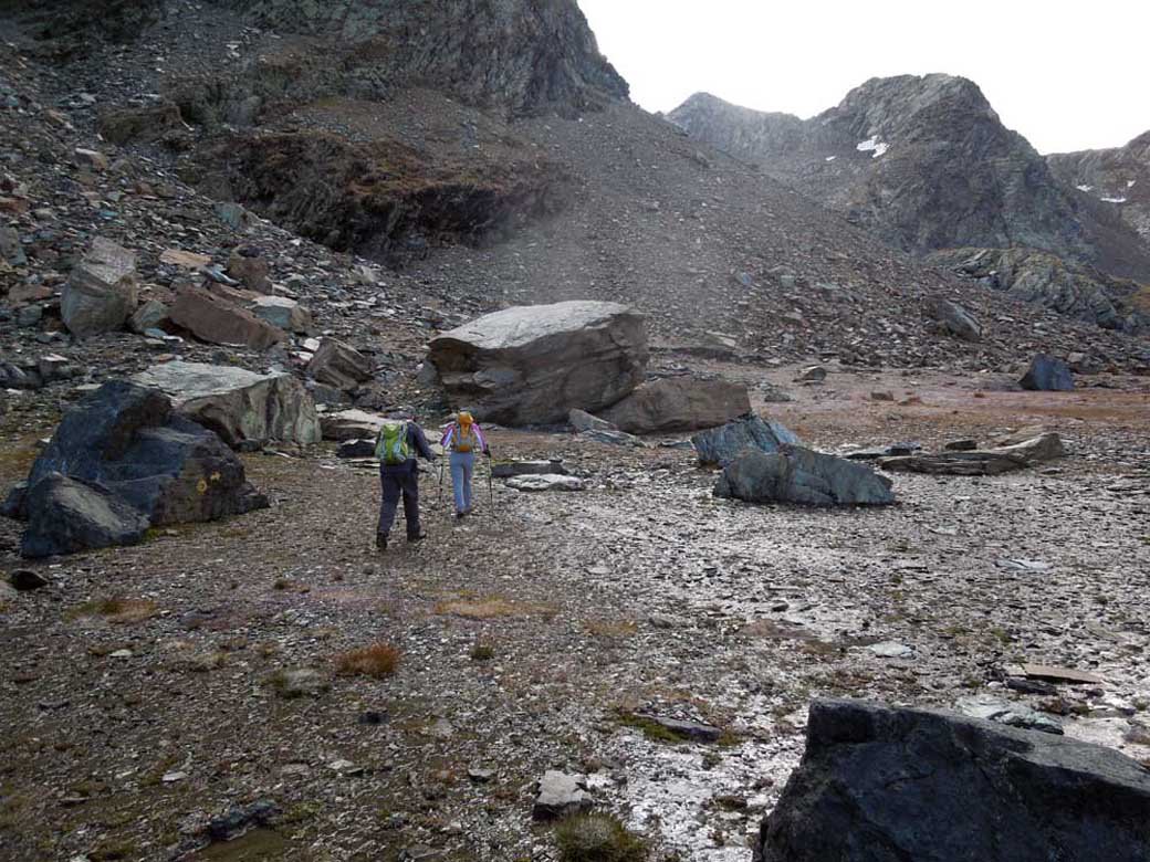 Come descritto nell’avvicinamento e nelle note ,fin sotto il passo a circa 2600 metri di quota nessun problema ,i sentieri sono ben tenuti e visibili, da questa quota bisogna andare a vista facendo molta attenzione alle frecce gialle ed agli ometti residui, si risalgono comunque diversi tratti in pietraia e dossi ripidi dirigendosi verso il passo ben visibile dal basso ,si percorrono i tratti ancora esistenti della vecchia mulattiera del Re raggiungendo la meta.
