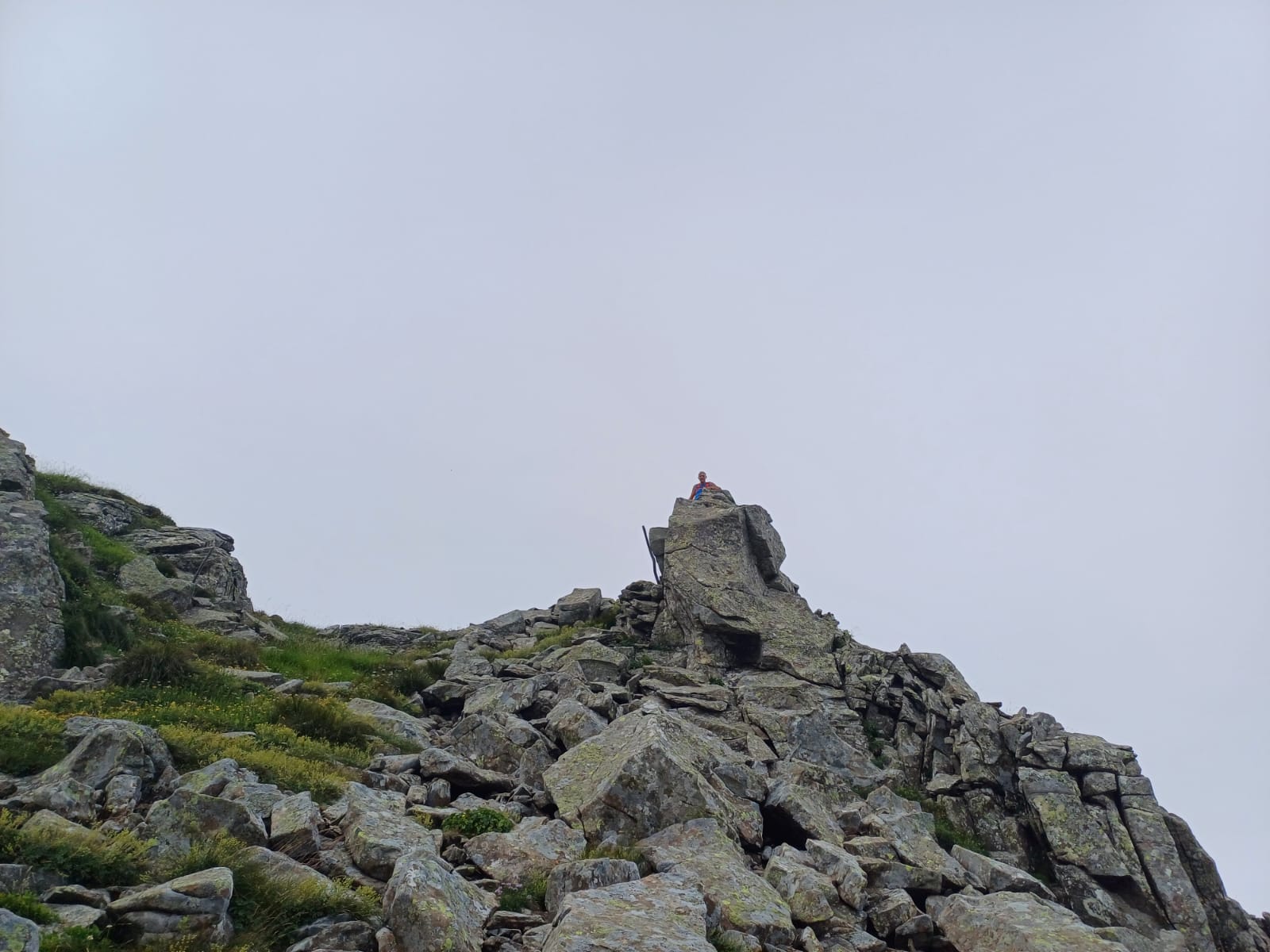 Per la via normale (cresta Est) lungo un tratto attrezzato con corda e cavetto (passi di II°) fino al Colletto Est. Dal colletto su sentiero già percorso si torna al Bivacco Rosario e al Passo del Gatto.