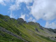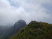 2° tiro: si segue facilmente lo spigolo fino alla sosta su due chiodi (20 m, II e III-).