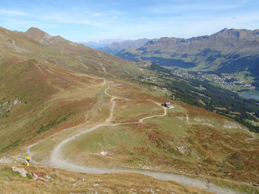 Dall’Alpe Statz, scendendo a valle e passando dalle case di Sartons e Casoja, si arriva ai due laghi di Lenzerheide, li si costeggia sul lato destro per poi arrivare in centro di Lenzerhedie. Si attraversa il centro del paese e puntando in direzione Sud si abbandona la strada principale alla seconda a destra, (se non si dispone di una traccia GPS) , meglio proseguire e lasciare la strada principale alla terza a destra, per poi un poco più avanti prendere alla sinistra lo sterrato che prosegue in parte parallelamente alla strada principale. Un poco più avanti delle baite di (Tschividains) alla quota 1411 piegare a sinistra (attraversare uno sterrato e proseguire diritti) e poi seguire le indicazioni per Crap da Tretscha. Superato un brevissimo tratto di ripido sterrato, proseguire con un lungo traverso osservando alla destra sul lato opposto della valle Muldain e Lain e arrivare di seguito al punto panoramico di Crap da Tretscha. Con una inversione di direzione e dopo ancora una breve ripida salitella, proseguire su sterrato che con ampio giro conduce al paese di Lenz. Si attraversa il paese per poi uscire sulla strada principale nelle vicinanze dell’ufficio postale. Senza uscire sulla strada, immediatamente riprendere la stradina che conduce alla chiesa, ci si passa vicino per poi imboccare il sentiero che riporta sui prati sotto le case del paese. Attenzione un poco più sotto! Alla fine della stradina, in corrispondenza di una baita posta su spiazzo erboso, imboccare sulla destra un sentiero che sembra poco ciclabile, ma è solo un breve tratto, poi si trasforma in largo e comodo sterrato che conduce senza più difficoltà di orientamento al punto di partenza.