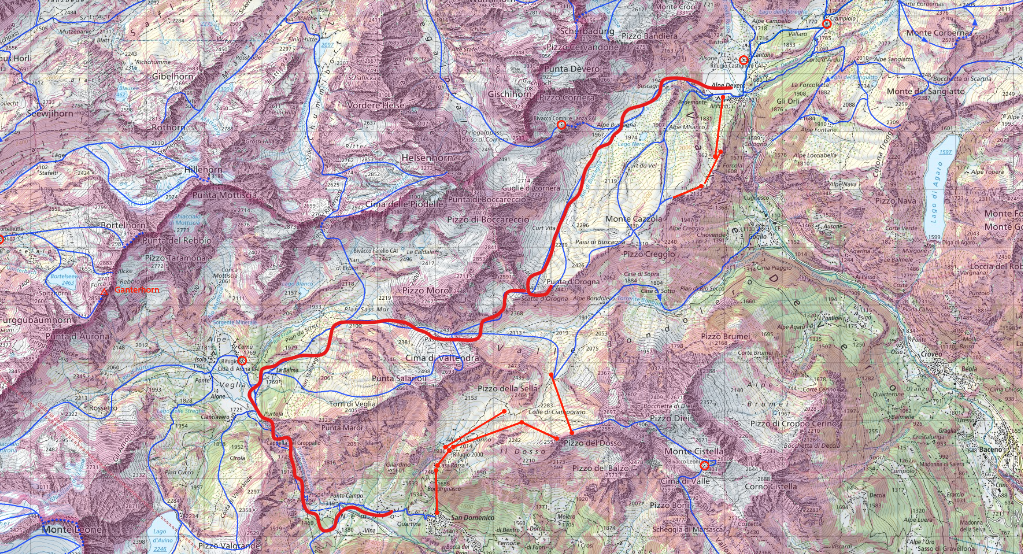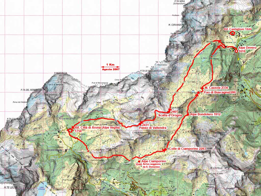 L’itinerario descritto parte dall’alpe Devero, arriva all’alpe Veglia e ritorna all’alpe Devero in due giorni. Il percorso è ben tracciato eccetto il tratto dall’Alpe Ciamporino all’alpe Bondolero (Luglio 2007), però il terreno privo di vegetazione rende facile (se non c’è nebbia!) l’individuazione dell’itinerario: