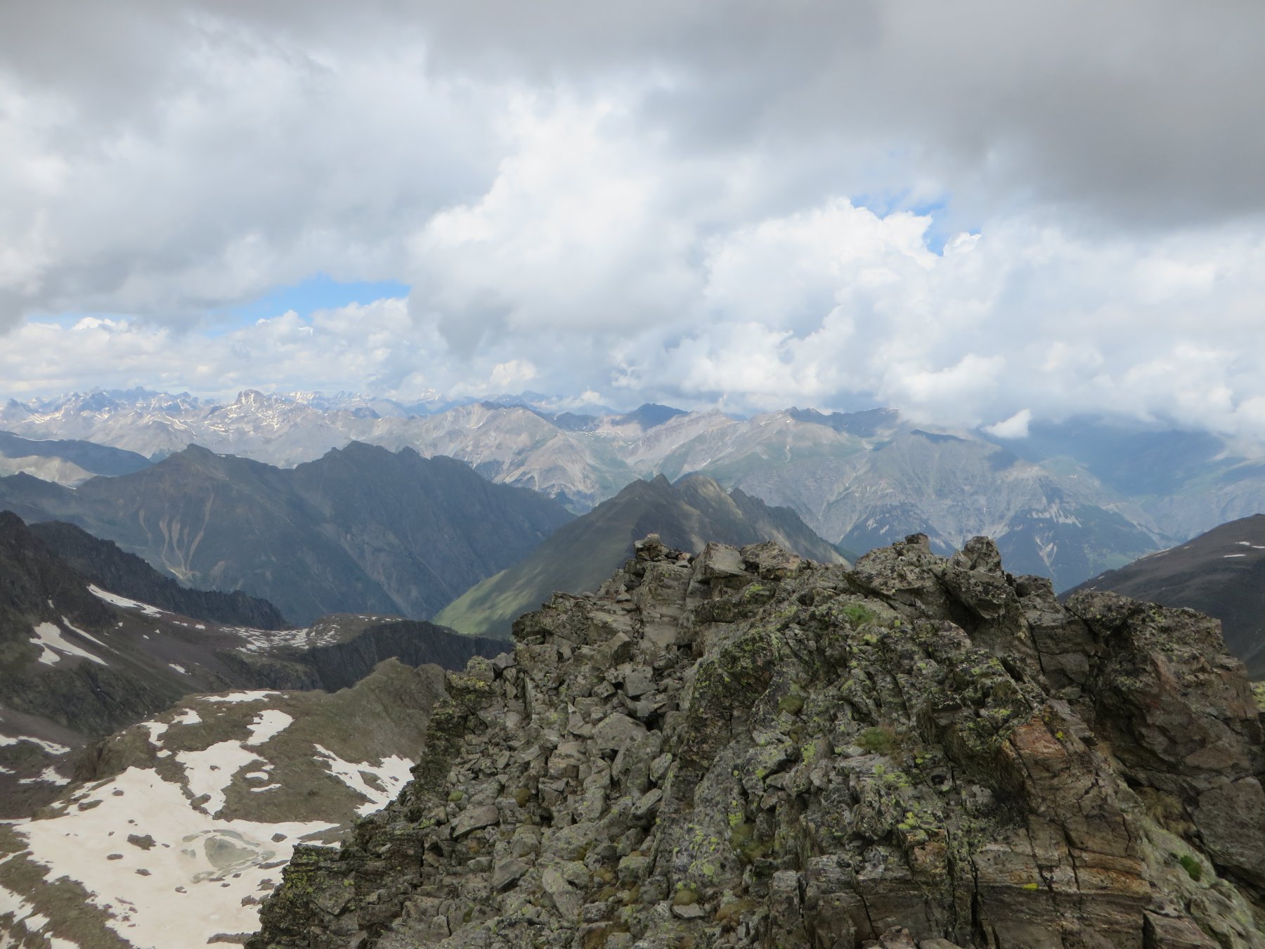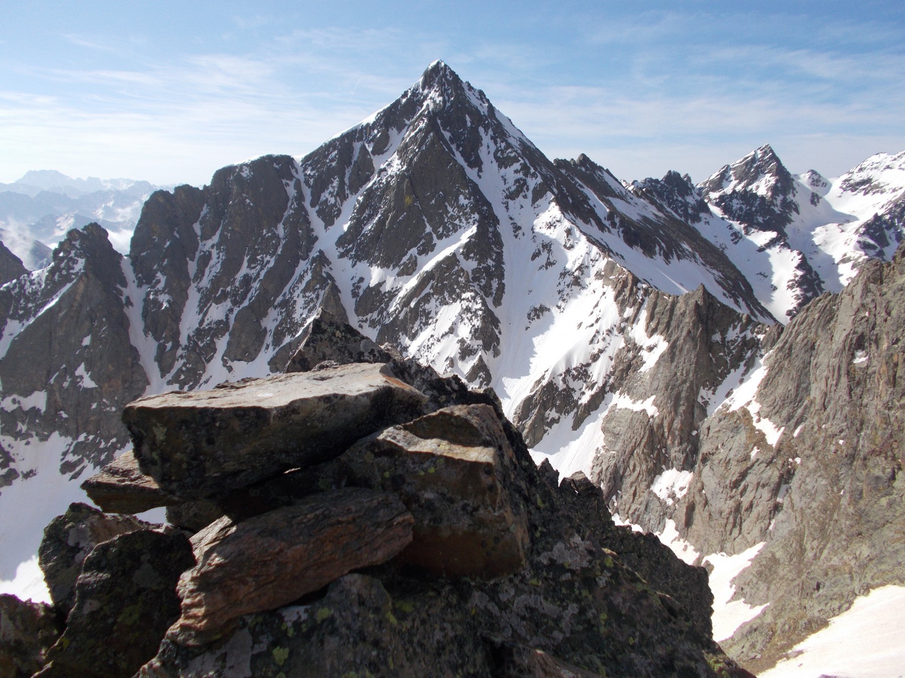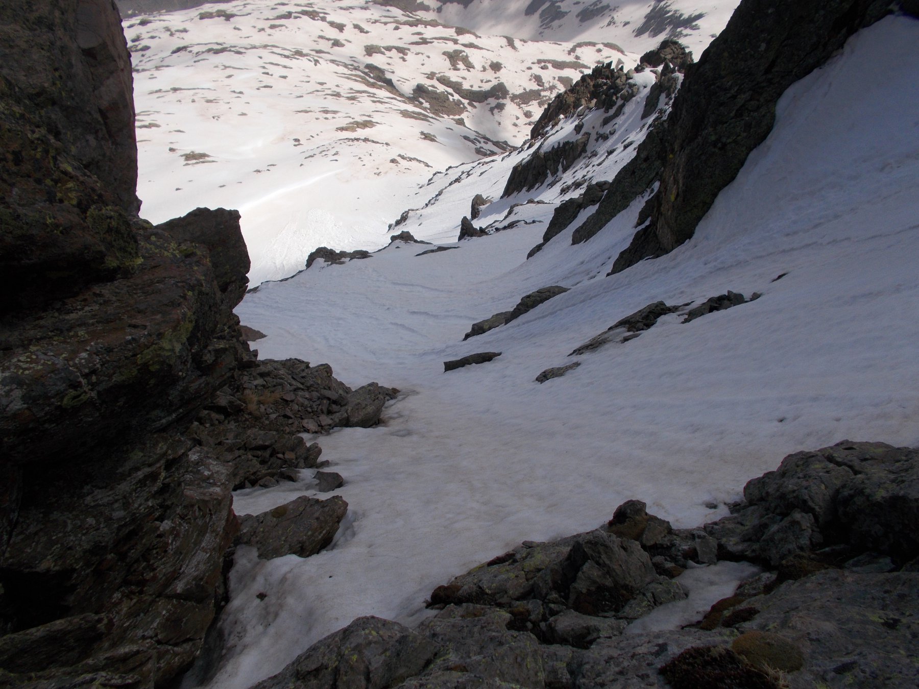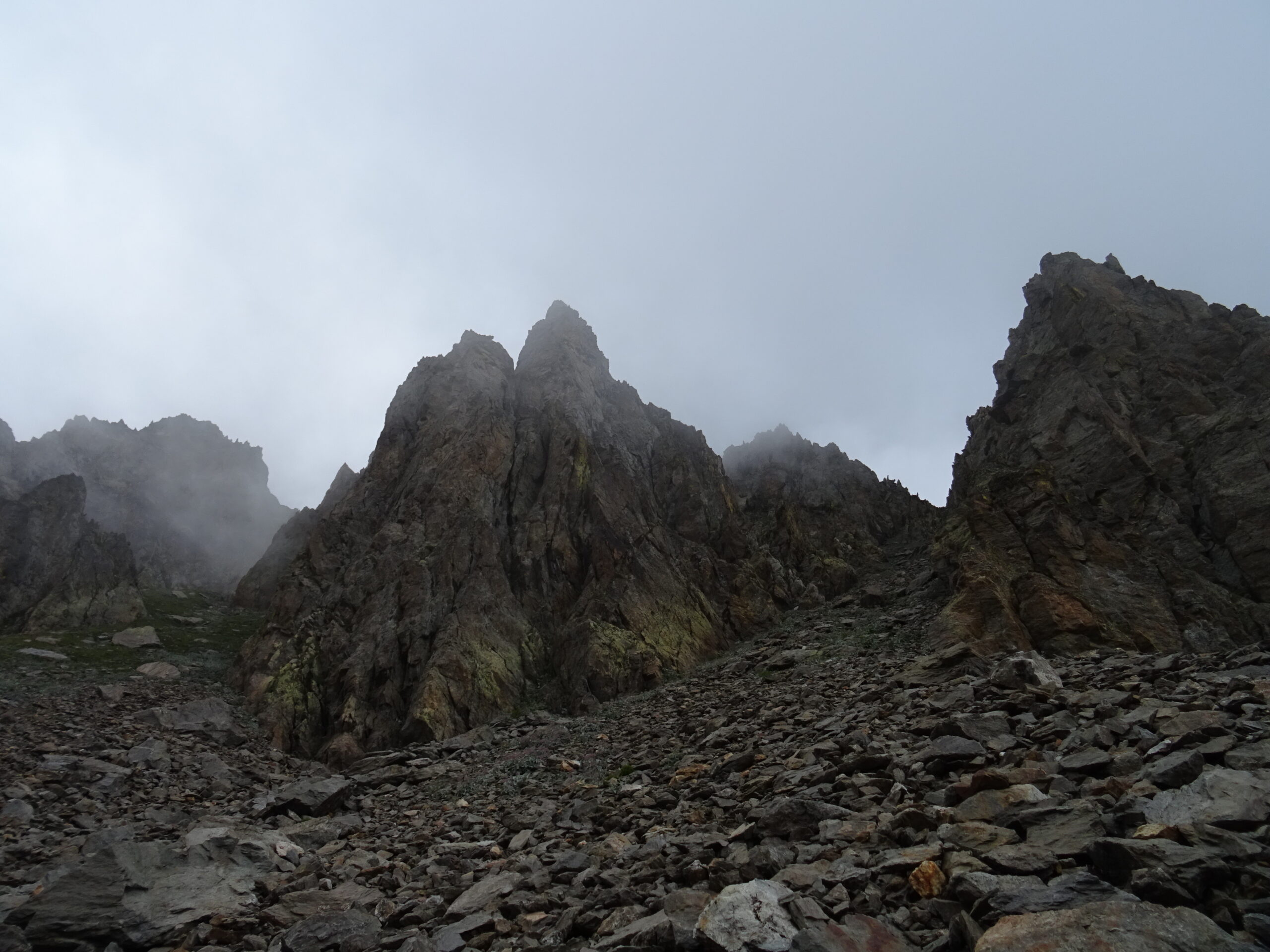 Discesa: si segue la via normale che scende per cenge detritiche sul lato NO (ometti), poi senza traversare verso sud verso il colletto fra la punte centrale e la punta Nord, si piega verso nord-est per salti di rocce e detriti mobili. Arrivati su un ripiano di rocce ed erba si piega decisamente verso est e, aggirando vari salti di roccia, si giunge sul dosso a quota 2510 circa, dove si ritrova il sentiero percorso all’andata.