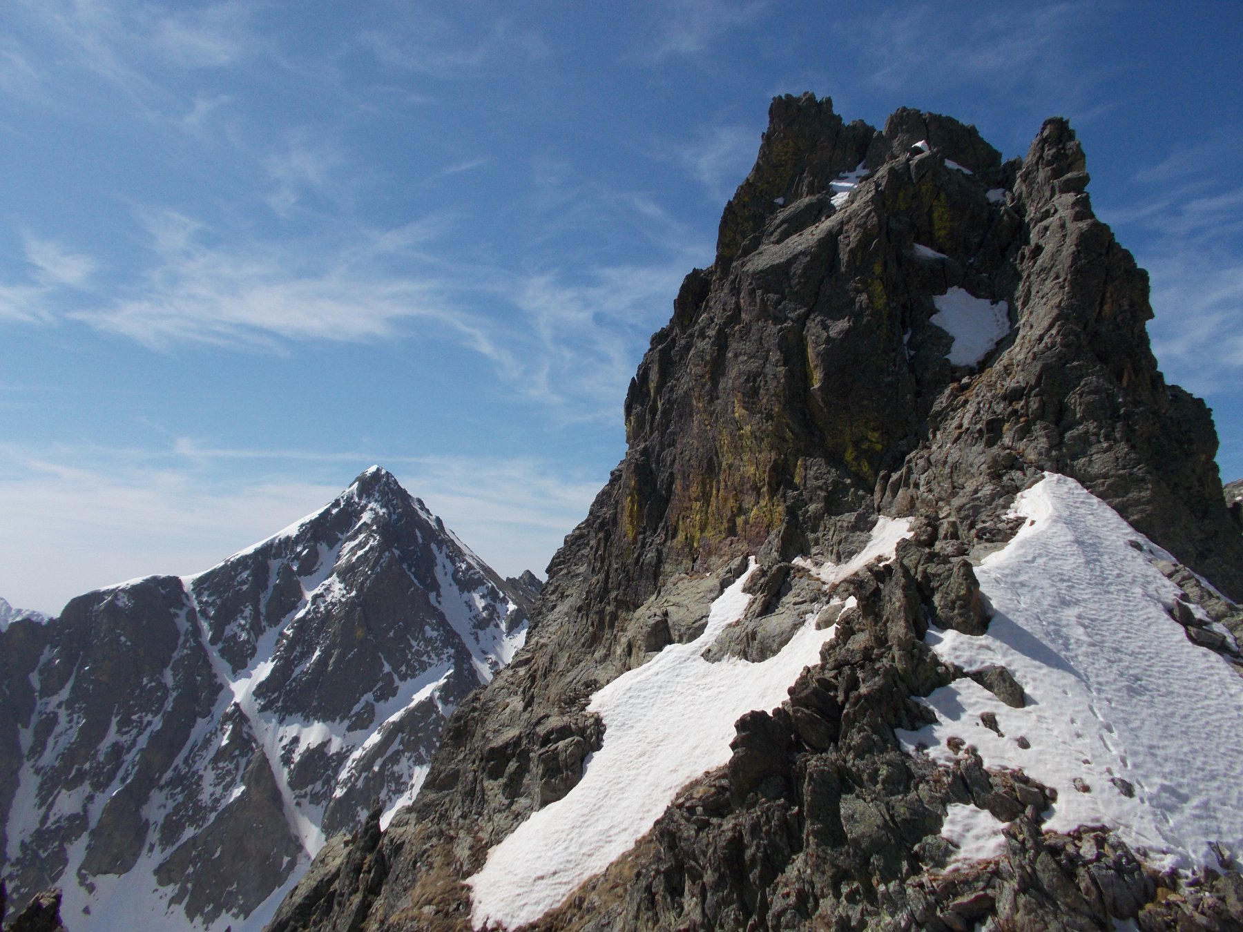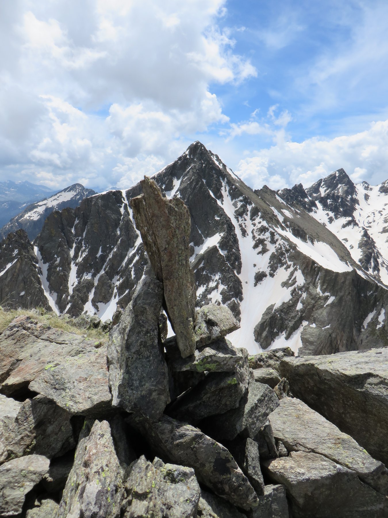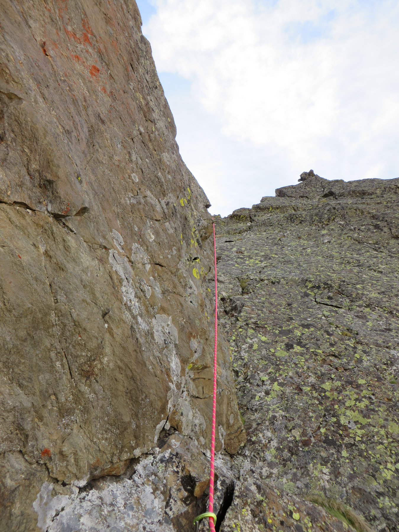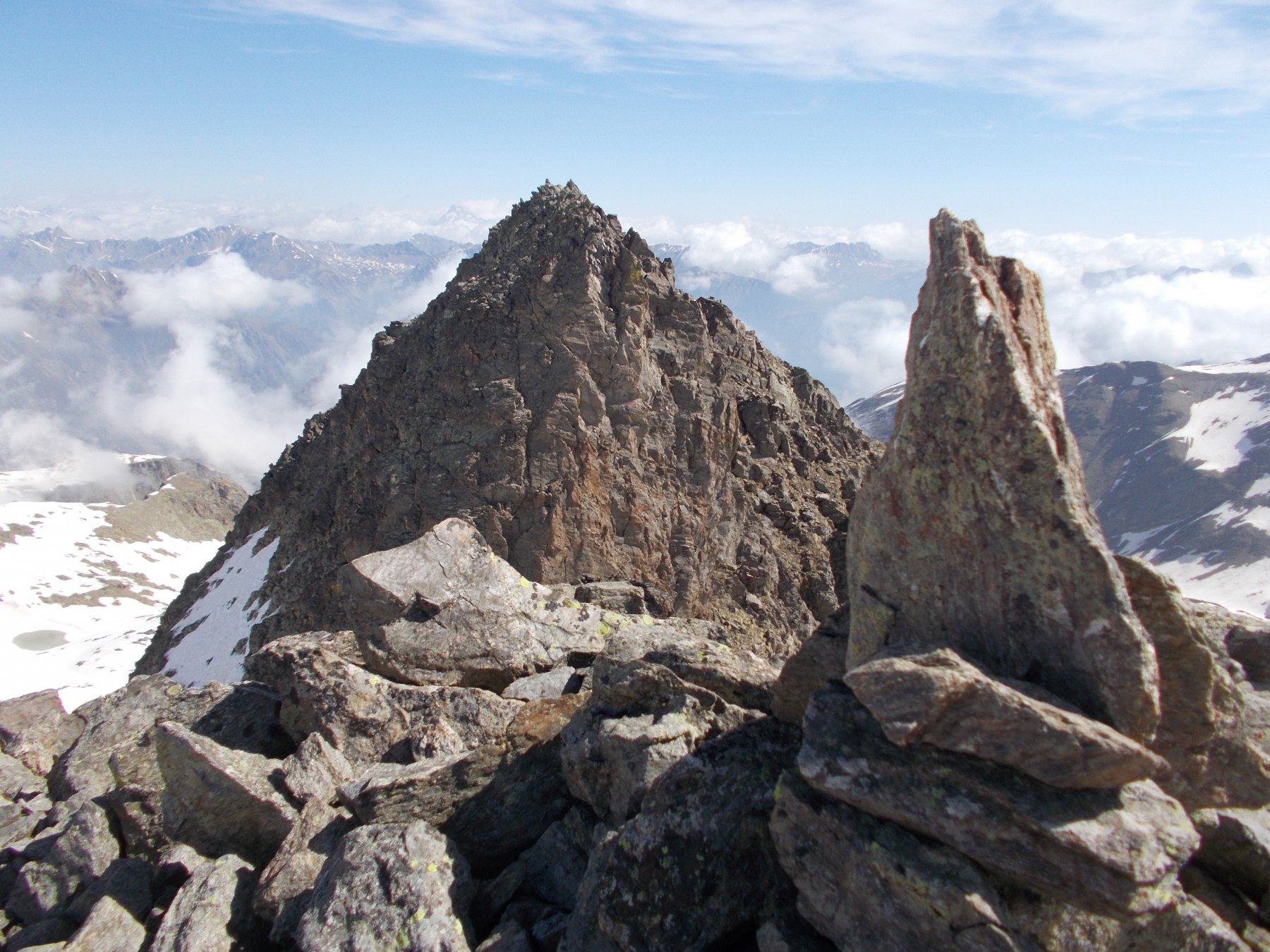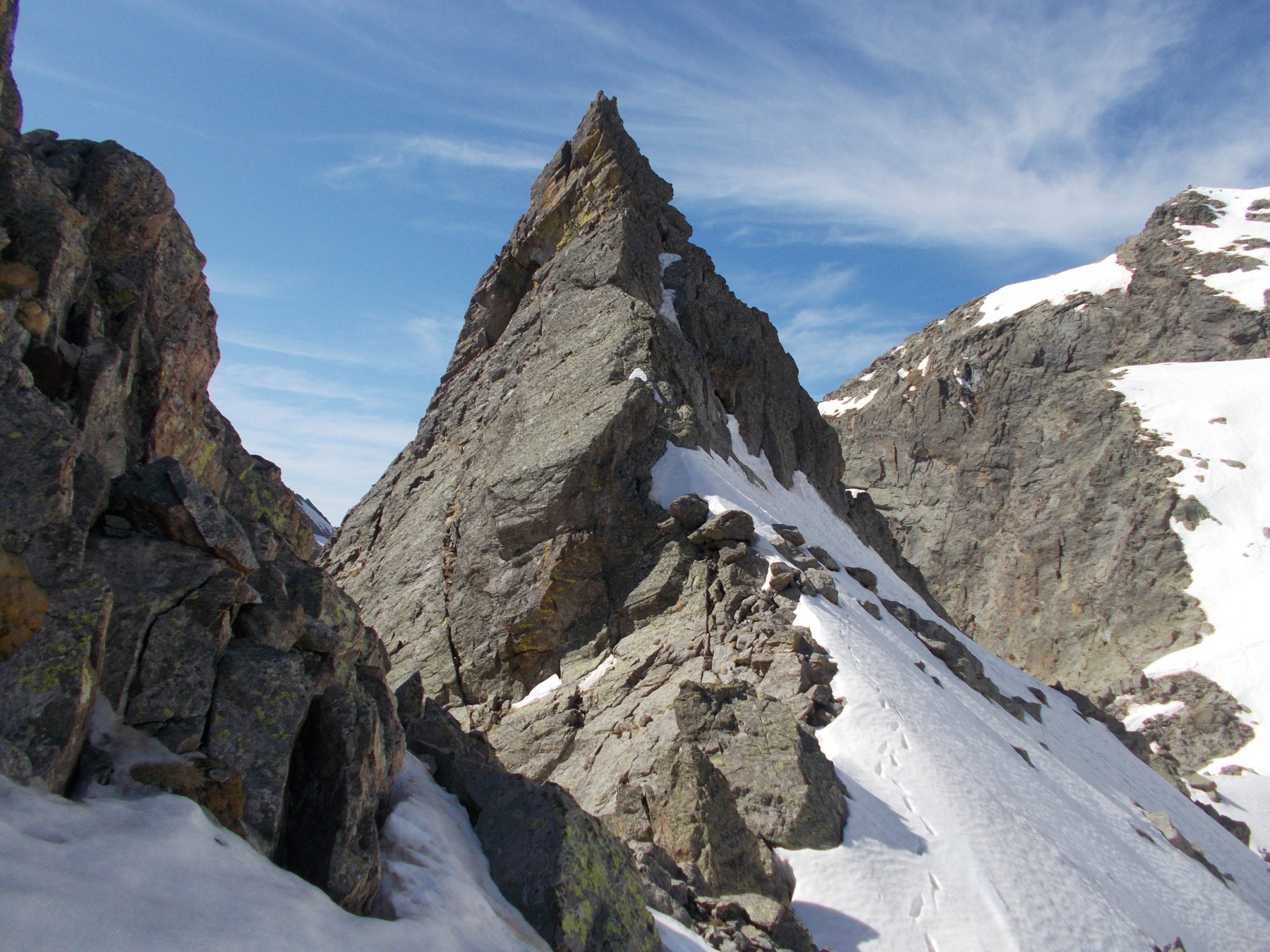 Si attacca ora la cresta sud della Punta Centrale. Con un tiro di corda sul filo di cresta (II e III), si arriva ad un piccolo intaglio alla base di un tratto quasi verticale. Si supera direttamente una serie di placche verticali (III+, molto aereo ed elegante, ma con lame instabili) fino a sbucare su un terrazzino erboso. Salendo per rocce articolate a sinistra del filo di cresta (II-III) si arriva in cima alla Punta Centrale (2926 m). Si scende ora lungo la cresta nord fin dove diventa difficile, quindi si segue un canale roccioso sul versante ovest. Appena possibile lo si abbandona e di traversa verso nord; ritornati in cresta in pochi metri si giunge al colletto fra la punta Centrale e quella Nord. Si attacca ora la Punta Nord, salendo per roccia solida ed articolata di poco sul lato occidentale della cresta (II) Superato un tratto più ripido (III) si prosegue per rocce rotte fino sulla Punta Nord (2931 m).