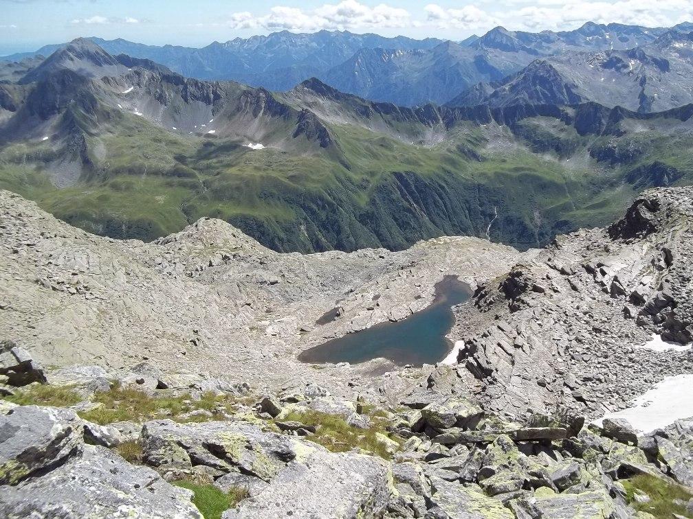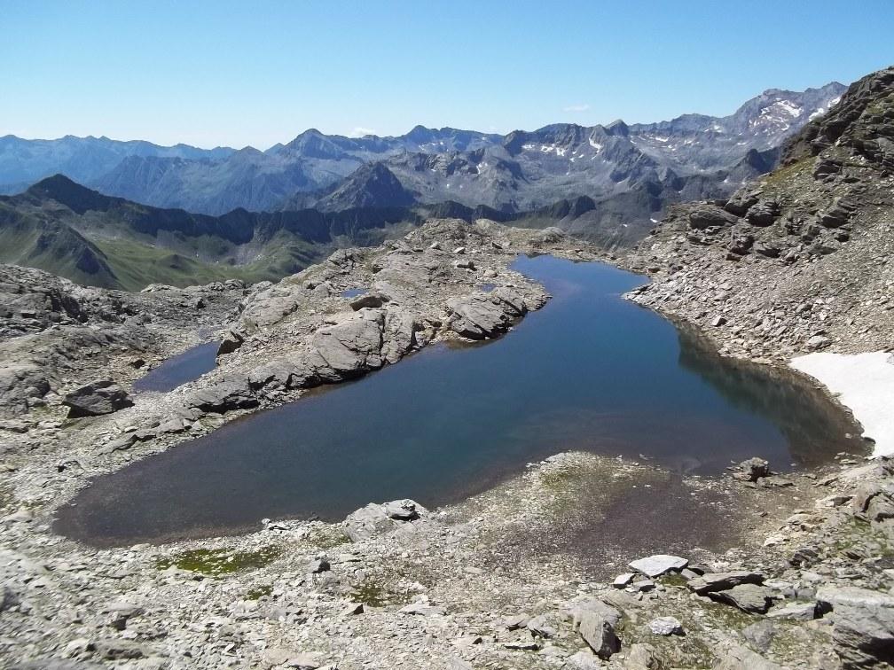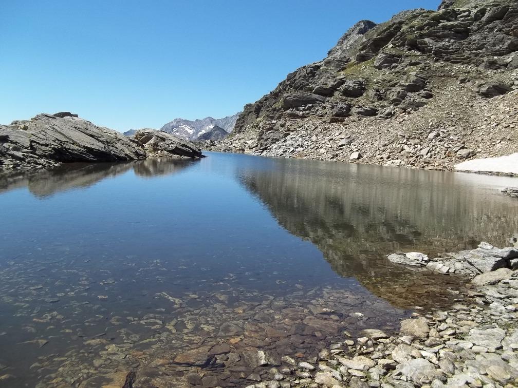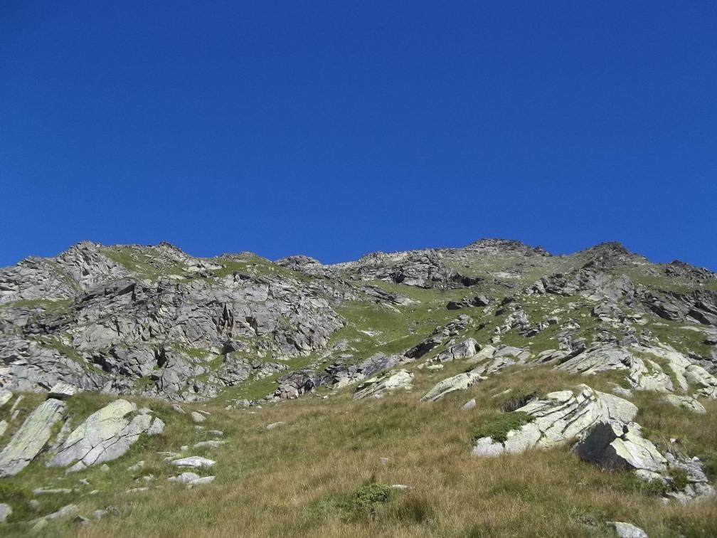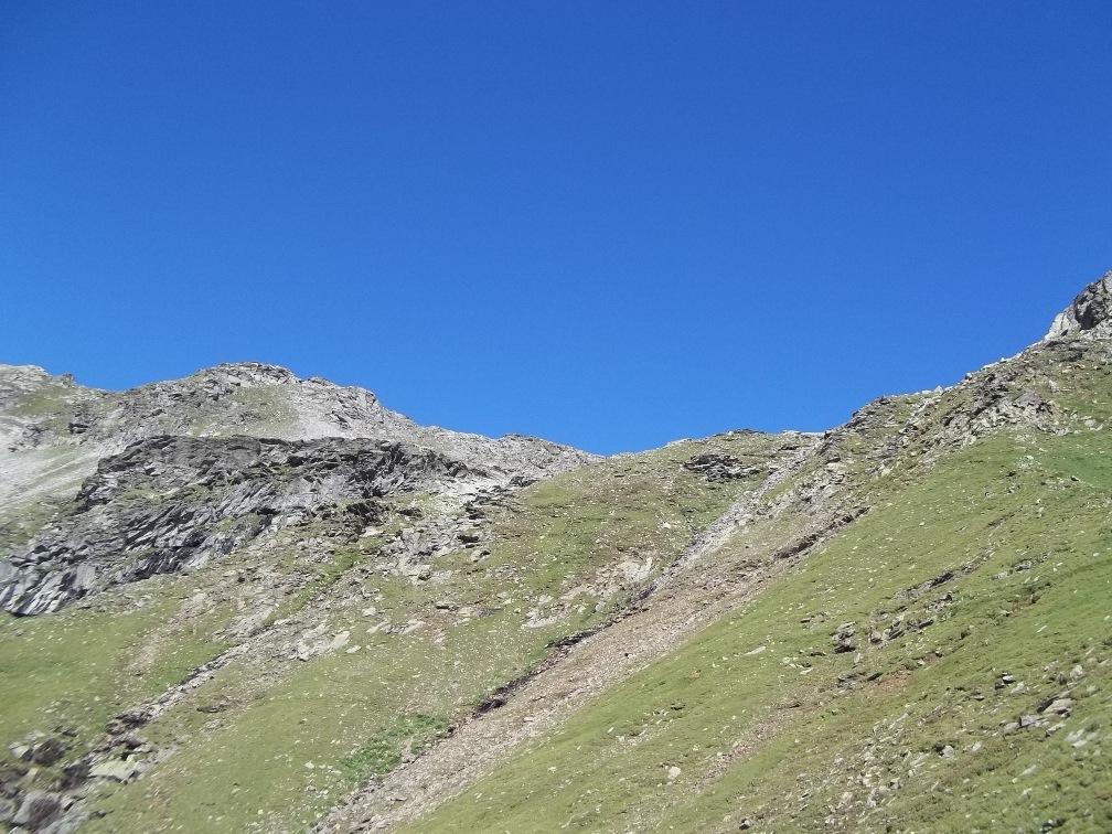 Non si attraversa mai il fiume ma ci si alza in direzione dell’ampia dorsale erbosa portandosi fin sotto il limite della parete S del Balmahorn per rientrare poi con un facile traverso sopra un secondo fascio di salti. Da qui seguendo un evidente croso si supera l’ultima rampa che delimita il pianoro della conca glaciale a quota 2700 dove si trova anche un bellissimo laghetto. Il resto del percorso segue fedelmente la cresta e non presenta oggettivi problemi.