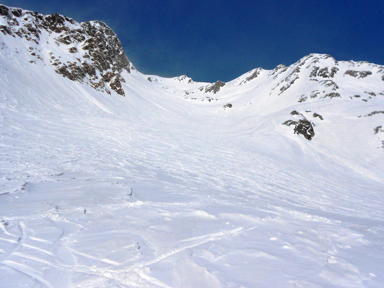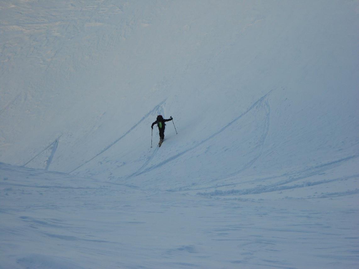 La discesa avviene inizialmente per pendii un po' ripidi, da affrontare preferibilmente con neve trasformata.