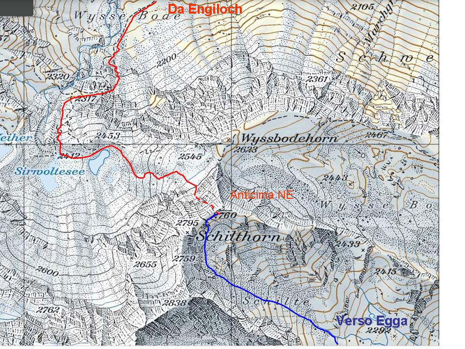 Dal parcheggio poco a monte di Engiloch (1769) si segue l’itinerario classico per il Boshorn fino ai laghi di Silwortersee (2410 ca.) dove, si piega decisamente a ovest (sx) e superando due dossi si arriva alla base dello scivolo nord ovest dello Schilthorn. Da qui (2600 ca.), individuata l’anticima NE dello Schilthorn (2760), si sale fin dove è possibile con gli sci, poi a piedi (piccozza e ramponi) per pendio via via più ripido: seguendo al meglio tratti di neve (max 50°) e qualche passaggio di misto su roccia si raggiunge la cresta pochi metri a dx della cima.