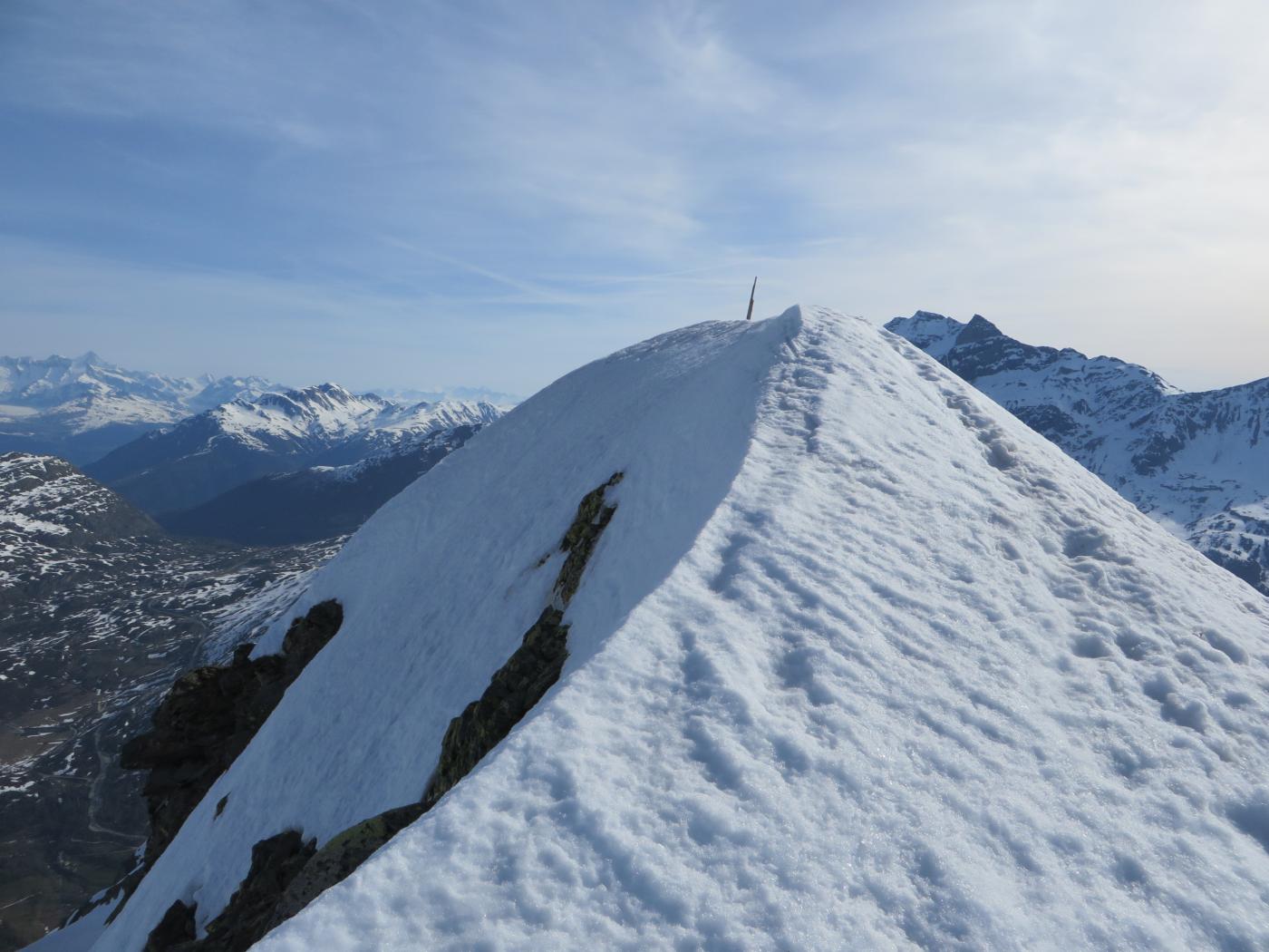 Gita mattutina pre lavoro. 14 gradi alla partenza alle h7, rigelo nullo fino in cima quindi nessun bisogno dei coltelli. Portage iniziale di 10 minuti fin subito dopo le case. 20 mt a piedi nel punto più ripido non perchè non si riuscisse con gli sci ma perchè era talmente bagnata che non ho voluto rischiare di farla venire giù. Discesa fatta alle 9 tutto sommato non male tranne in alcuni punti dove tendeva a sfondare (pensavo peggio). Sul tratto più ripido fatto a piedi in salita sono passato via veloce e non ci sono state colate. Una decina di scialp sul percorso, da solo a questa cima.