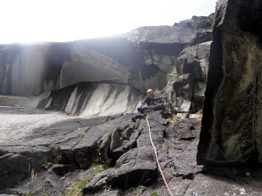 L1: si sale la fessura evidente e per gradoni erbosi fin sotto un tetto. 5b