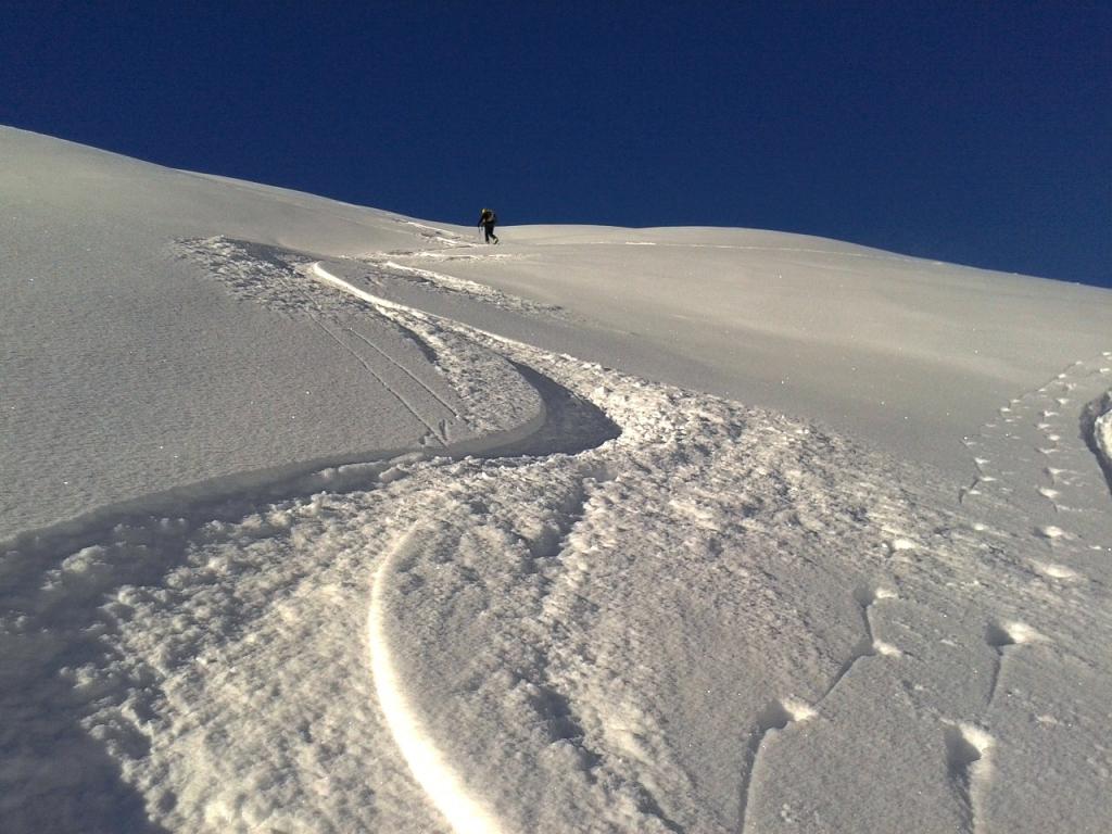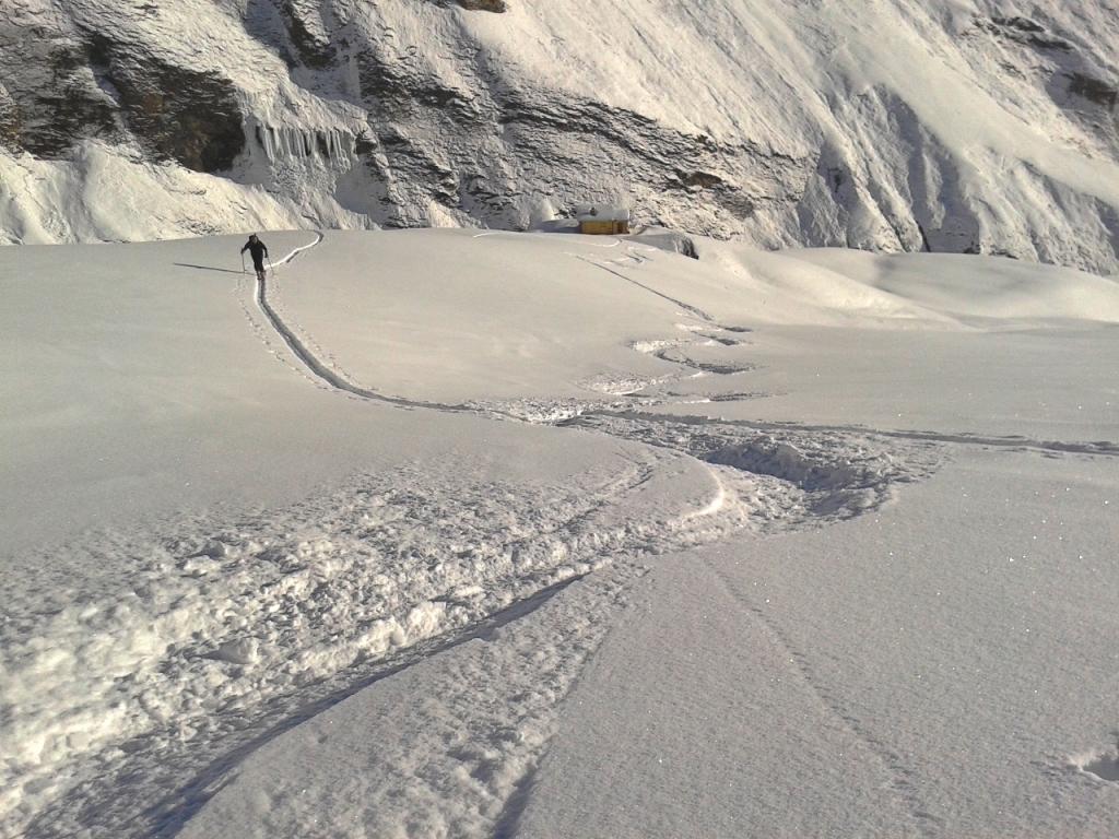 5 cm di polvere finissima alla partenza, a crescere sino a 30 in alto, su strato portante di spessore appena sufficiente, ottima discesa. Salita bella. -12° alla partenza a Splugen. Innevamento scarso in zona. Al rientro il primo prato sopra all’abitato presentava già diverse aree in erba.