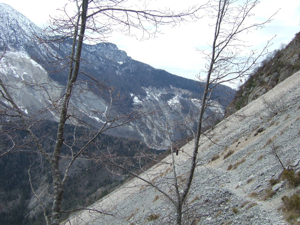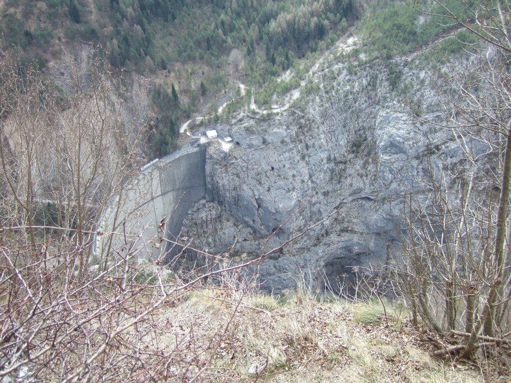 Dalla diga del Vajont (parcheggio a pagamento), si attraversa la statale e si seguono le evidenti indicazioni del sentiero 380. Con comodi tornanti nel bosco ci si alza fino a incrociare il tracciato del Troi di S. Antonio proveniente dalla valle del Piave. La mulattiera ora larga e scalinata passa davanti a un grande “covolo” (riparo naturale di roccia) e arriva tra vasti prati terrazzati e un tempo coltivati e sfalciati, al caratteristico borgo di Casso mt 1000 circa. La vista si apre sull’ immane frana precipitata dal Monte Toc il 9 novembre 1963. Attraversato il paese per le stradine acciotolate e nuove case ristrutturate, alcune in modo assai dubbio…, si raggiunge la strada asfaltata di accesso al paese. La si percorre per circa 200 metri fino a trovare a sx l’inizio del Troi dal Sciarbon che si alza di quota per una bella cengia di roccia rossastra, tipica della zona. Si continua con vari saliscendi, passando per alcune vecchie case prima nel bosco poi con tratti su ripidi ghiaioni. La frana del Vajont, nell”altra parte della valle, ci accompagna lungo il percorso e ci si rende conto della enormità del distacco. Con un cambio di direzione e un ultimo ripido tratto nel bosco, ci si porta sopra le case più alte di Erto. Si inizia la discesa evitando di seguire l’indicazione Forcai che porta alla parte nuova del paese. Il sentiero continua nel bosco di noccioli con qualche veduta verso la Val Zemola, il monte Porgeit e il Duranno fino a trovare una traccia, usata ma poco visibile, che scende rapidamente verso una casa ormai ridotta a ruderi e la vicina cappella di San Liberale all’imbocco della Val Zemola. Si segue l’asfalto per poche decine di metri e lasciando a dx la strada principale, si imbocca una deviazione verso alcune case. Si passa tra queste e subito si trova a dx una bella mulattiera che scende con comode svolte fino alla strada asfaltata. Poche decine di metri e superando il guard rail si prende una bel sentiero a sx che ci porta in pochi minuti alla frazione Val da Pont e alla statale nei pressi della cappella di San Romedio. Superato il ponte e l’ impressionante forra sottostante, si segue la statale per circa 300 metri fino a trovare il segnavia che ci porta con una breve salita alla frazione di San Martino. Qui non ci sono altri segnavia (forse cancellati o tolti durante le varie ristrutturazioni di case). Si deve salire per bella mulattiera a sx fino alla casa più alta del paese a ridosso del monte Porgeit. La casa, abbandonata e circondata da cumuli di materiali vari, è ben visibile. Si passa davanti e si trova un sentiero a tratti poco evidente che si alza nel bosco di noccioli. Attenzione a non deviare a sx per le varie tracce che scendono dal monte, ma mantenere sempre la dirzione diritta. Dopo circa 15′ si trovano i segnavia Cai e qualche ometto. SI sale a lungo costeggiando il monte fino a quota mt 965 dove si trova una vecchia fornace. Ora inizia la discesa ripida inizialmente, poi più dolce che ci porta fino a Pra de Tegn nei pressi dell’ agriturismo. Qui troviamo finalmente i cartelli segnavia mancanti in tutto il percorso.