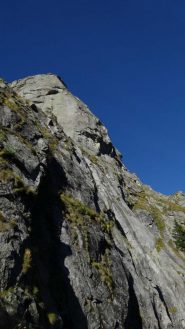 Arrivati ai prati dell'alpeggio si individua sulla destra una evidente sella erbosa (la più bassa)e si traversa in leggera salita per raggiungerla.Dalla sella scendere il canale per raggiungere l'attacco sotto un evidente tetto a sette ma soprattutto sotto la zone più compatta del pilastro(2/2.30h).