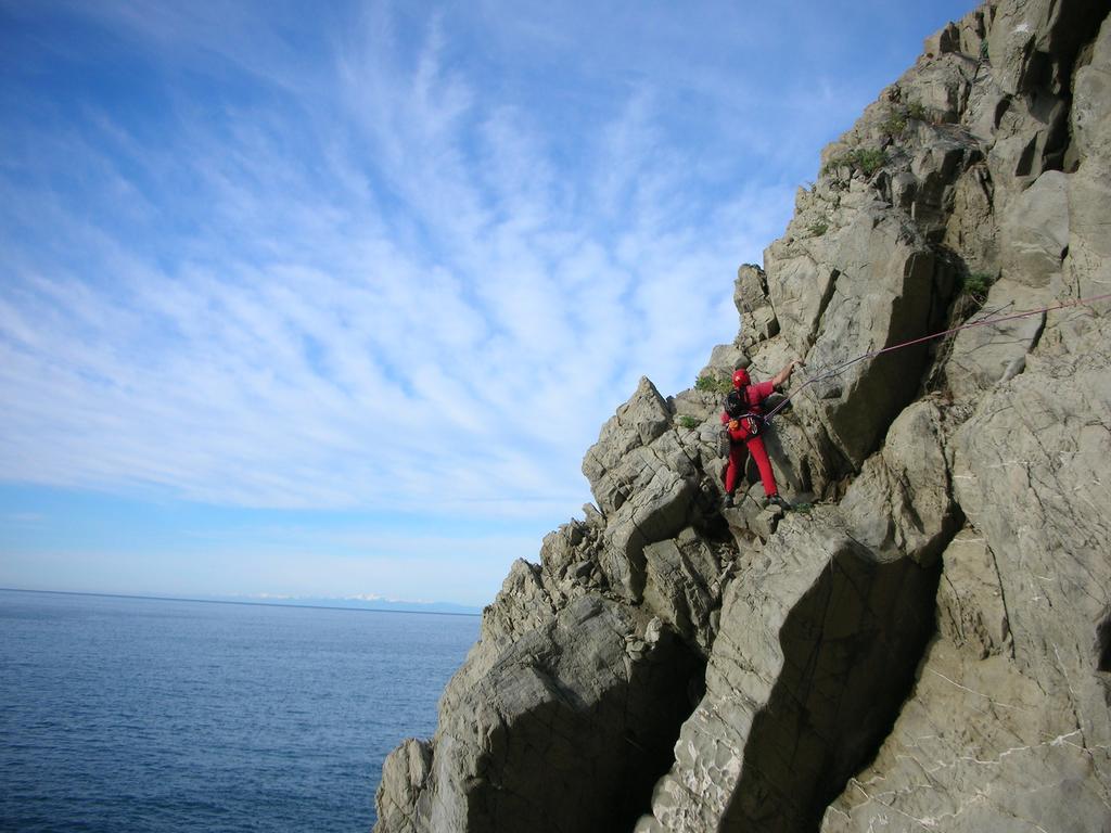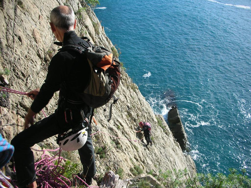 Ritorno: dall’uscita per un cordone e tracce raggiungere il sentiero proveniente dal traverso il Salto nel Blu (cartello indicatore); salire ripidamente seguendo i bolli blue (alcuni tratti attrezzati) fino ad incontrare il bivio del sentiero FIE dove deviando a destra si scende a Moneglia (1h circa).