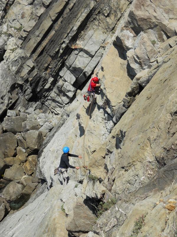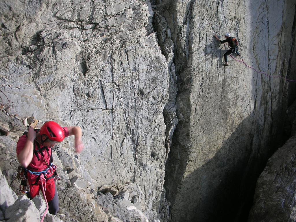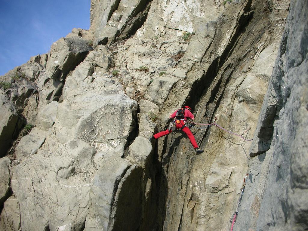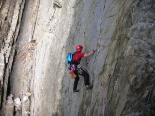 L9- 4+ Traversare in leggera salita doppiare lo spigolo (sosta possibile) superare la successiva placca salendo fino all’evidente sosta finale.