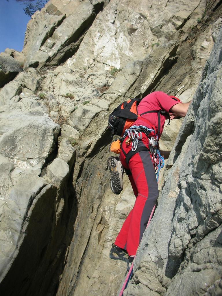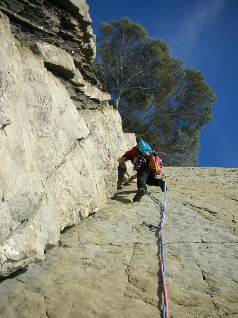 L4- 6 a+ Placca delicata fino ad una cengia (sosta possibile)poi per cengia e facili roccette in leggera salita continuare fino ad una sosta visibile su uno spigoletto.