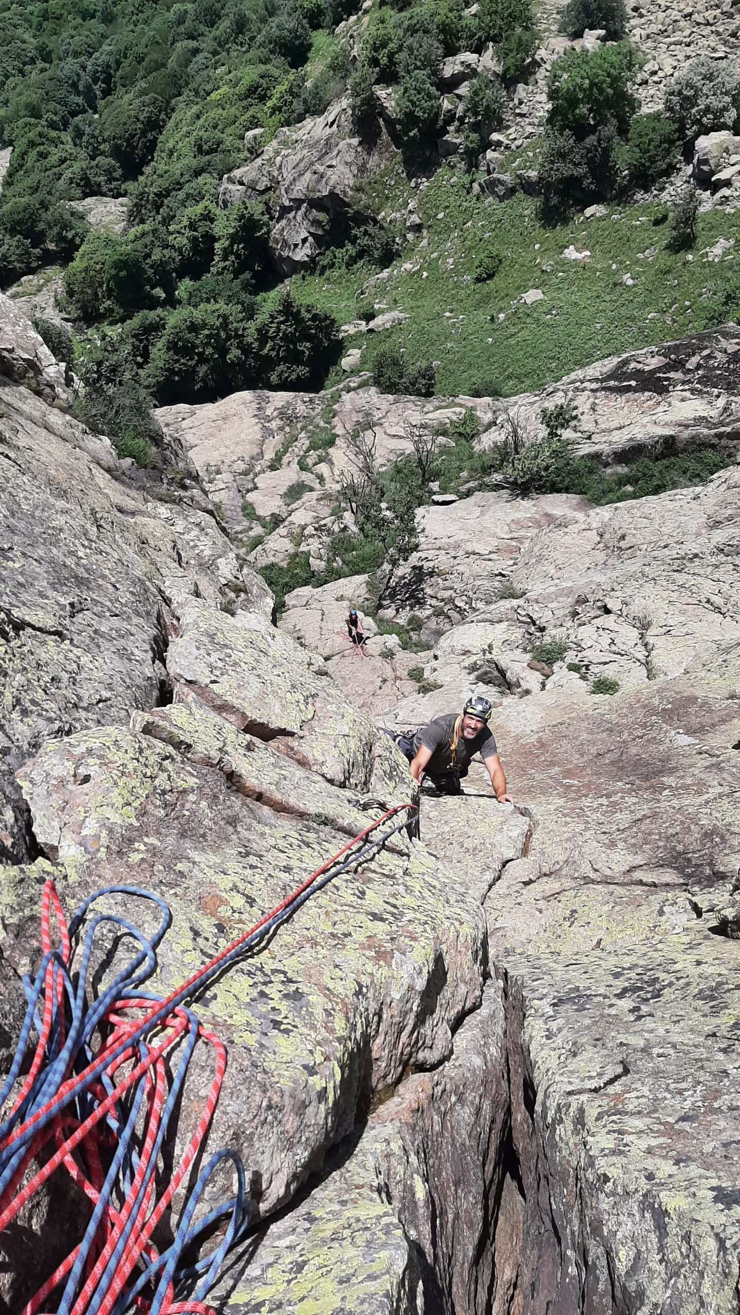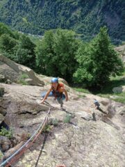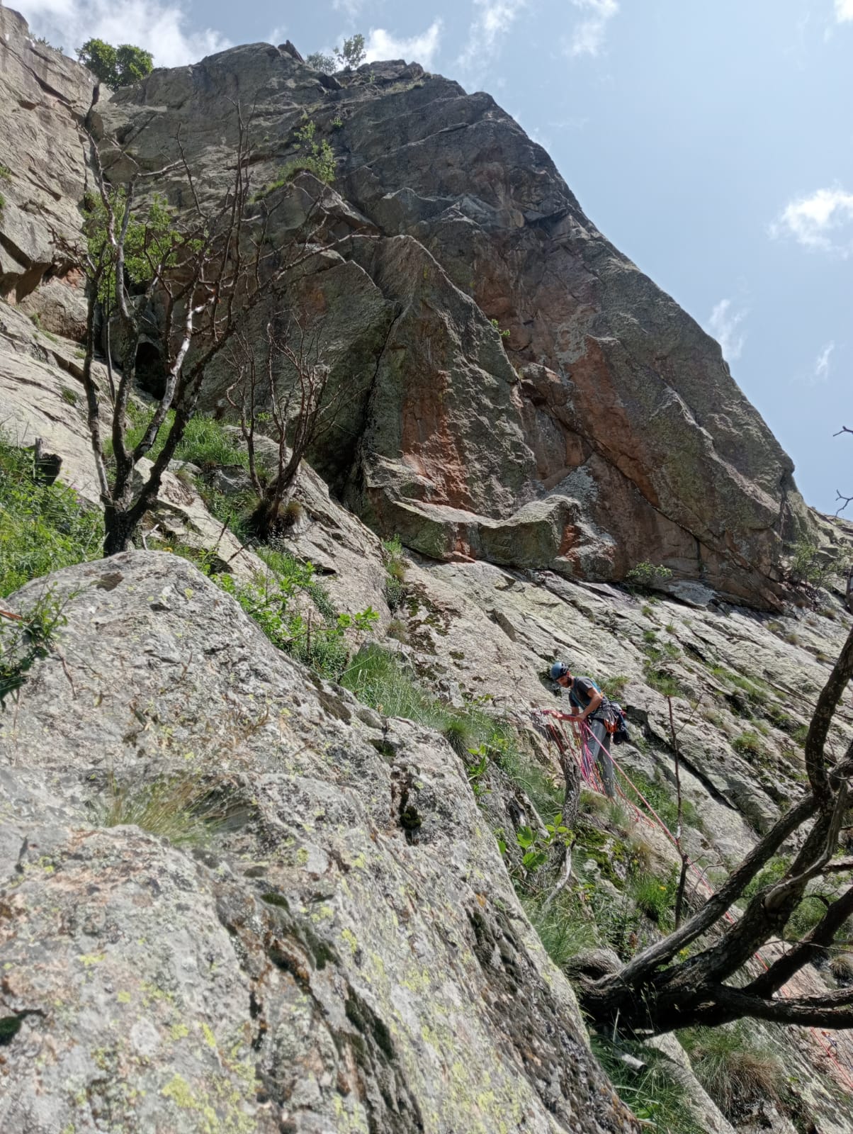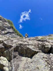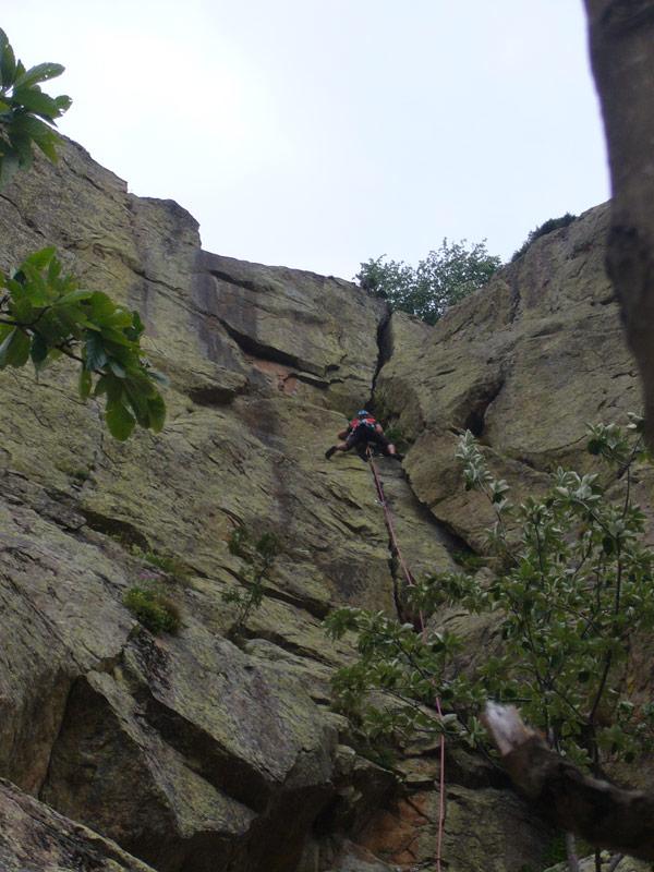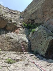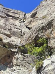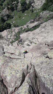 L2: Piccolo strapiombo di forza (passo 5c6a) poi facili placche lichenate (35m) sosta su terrazzo.
