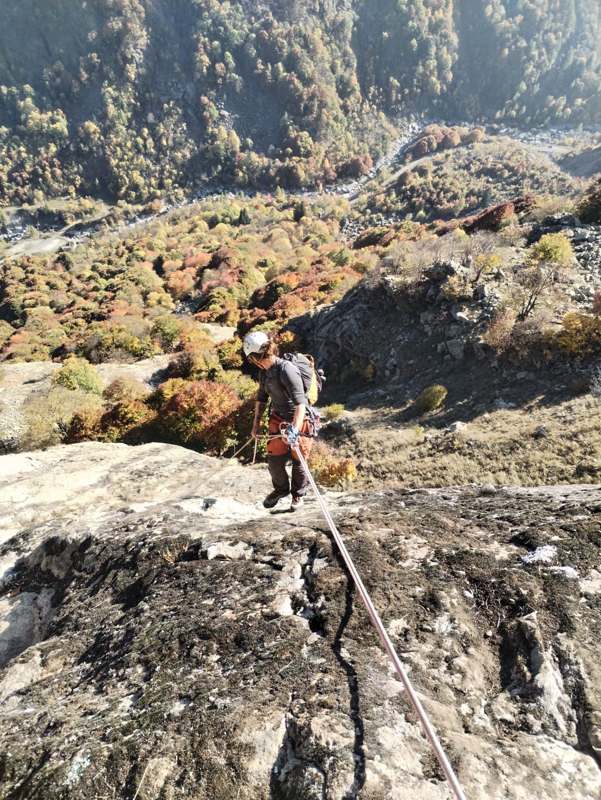 Discesa: Dalla cima spostarsi 10m a sx e reperire le calate su un grande blocco (calate di Luna Calante – vedi relazione-) che con tre doppie da 60m porta alla base della parete.