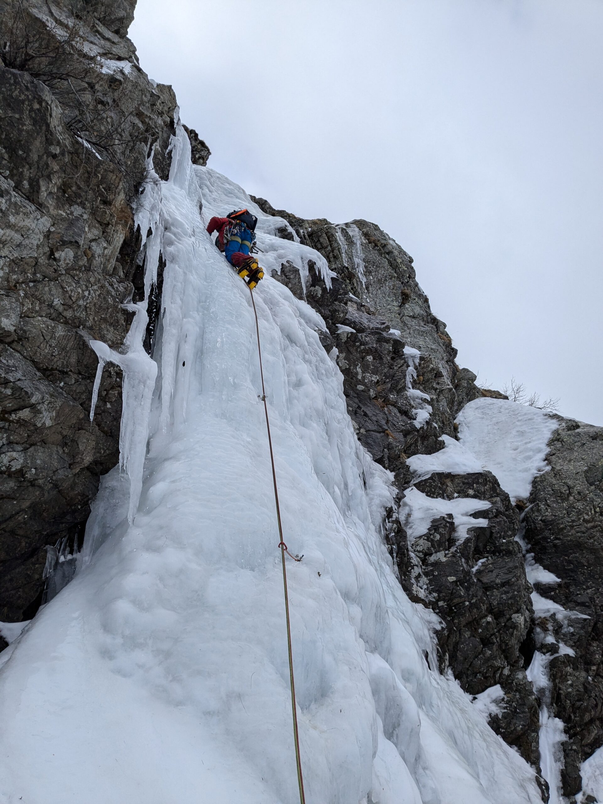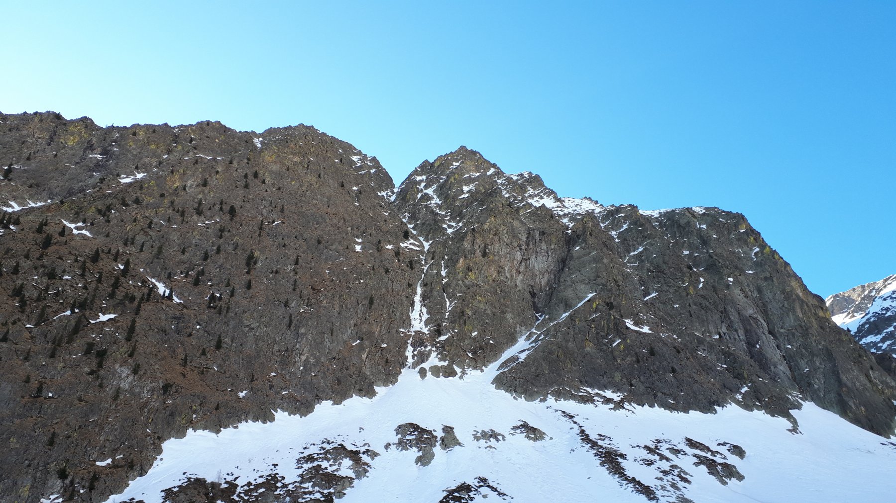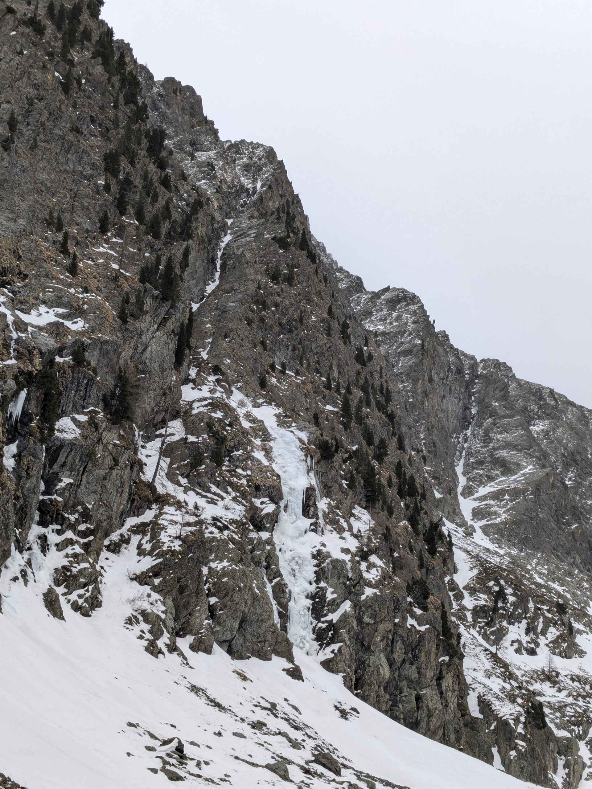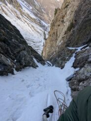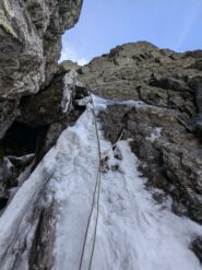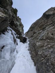 Il canale termina sotto due salti di roccia e in buone condizioni e possibile trovare ghiaccio a sufficienza per proseguire la salita.