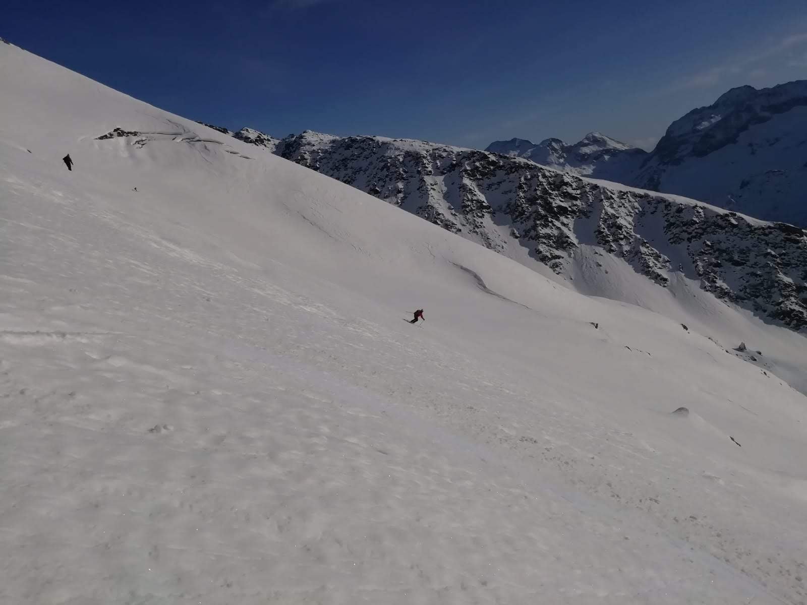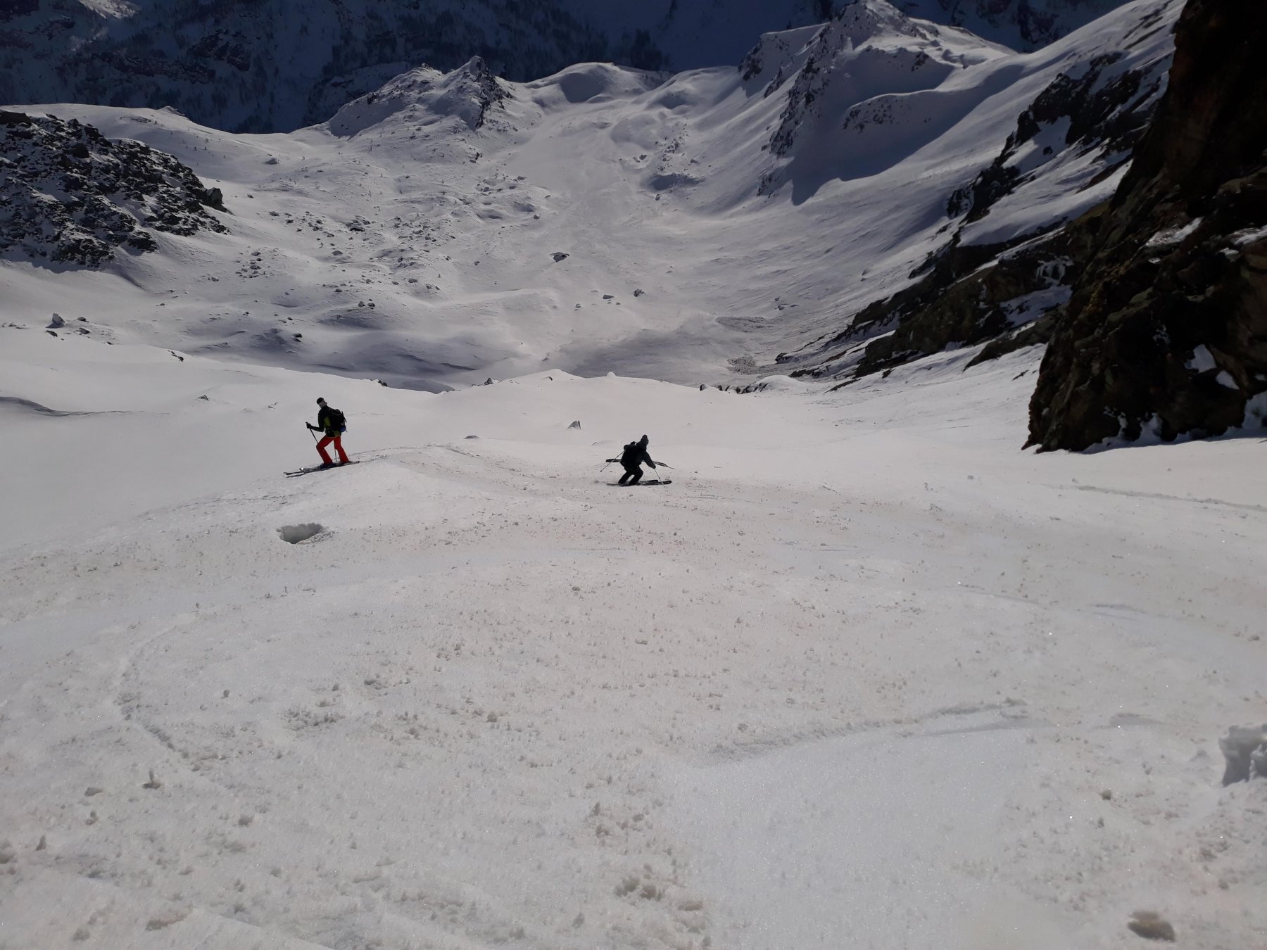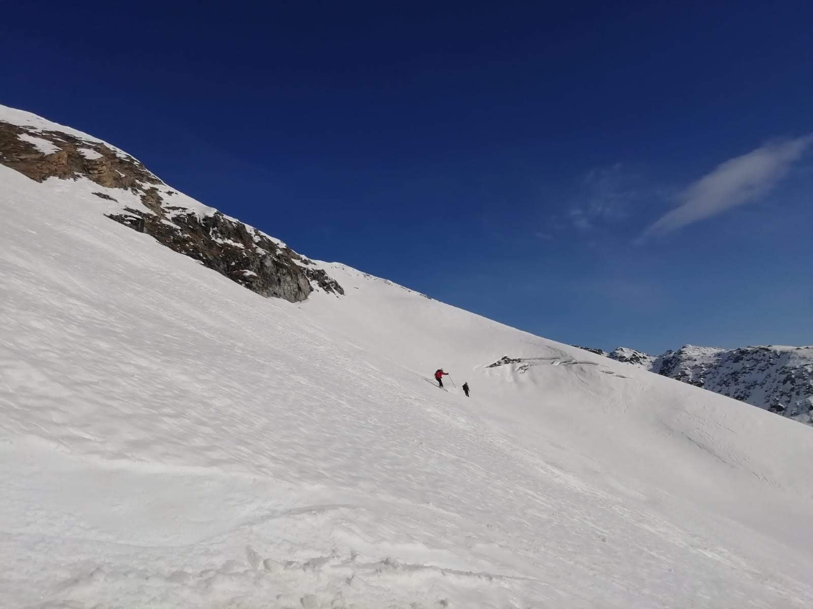 In discesa si può ripercorrere l’itinerario di salita oppure traversare a sinistra sopra alle bastionate fino a confluire nel valloncello sotto all’evidente sella del Ghicet di Sea, nel punto in cui inizia la salita a P.ta Franci. Per allungare la gita e la qualità della sciata si consiglia di salire all’anticima della Rossa di Sea percorrendo il valloncello a destra del Ghicet. Dalla punta è poi possibile scendere, se innevata, dalla Gran Comba. In questo modo il dislivello diventa di 2055m.