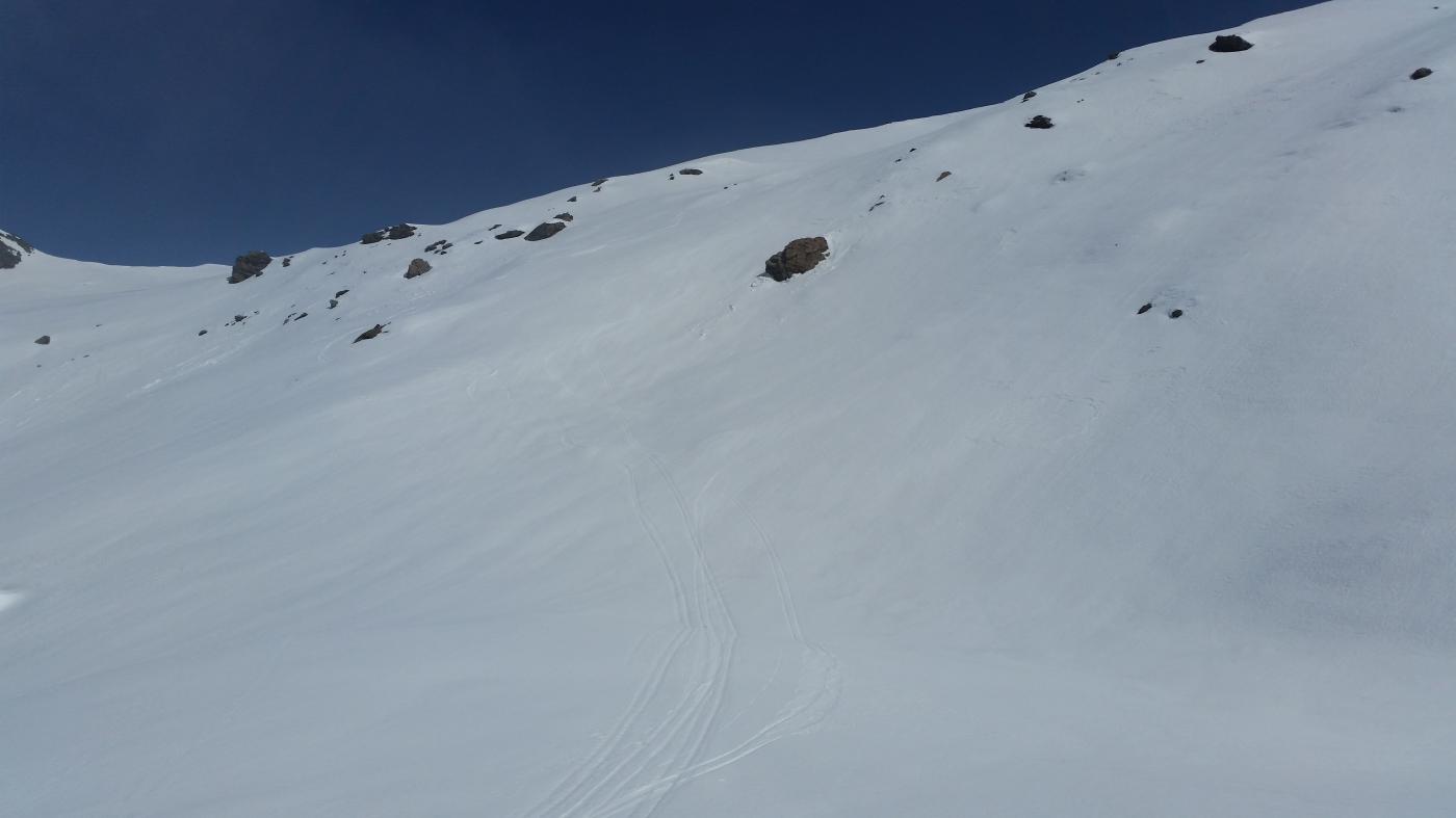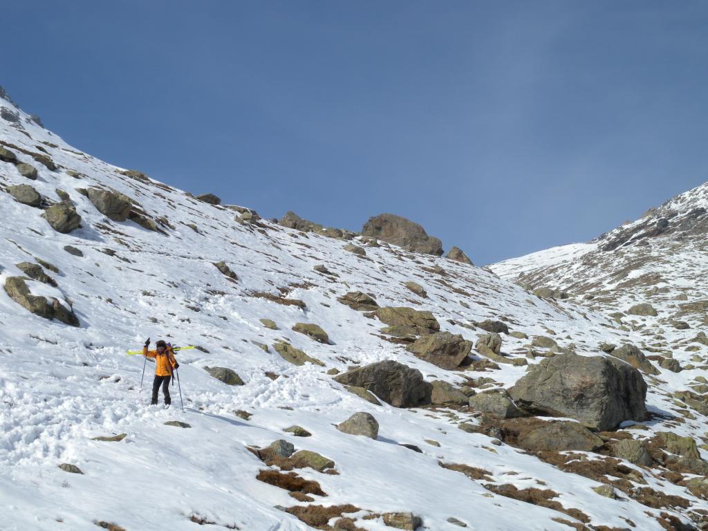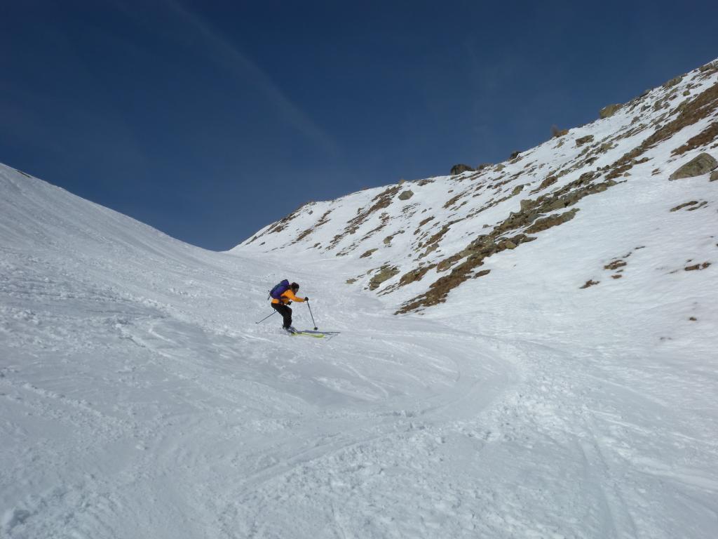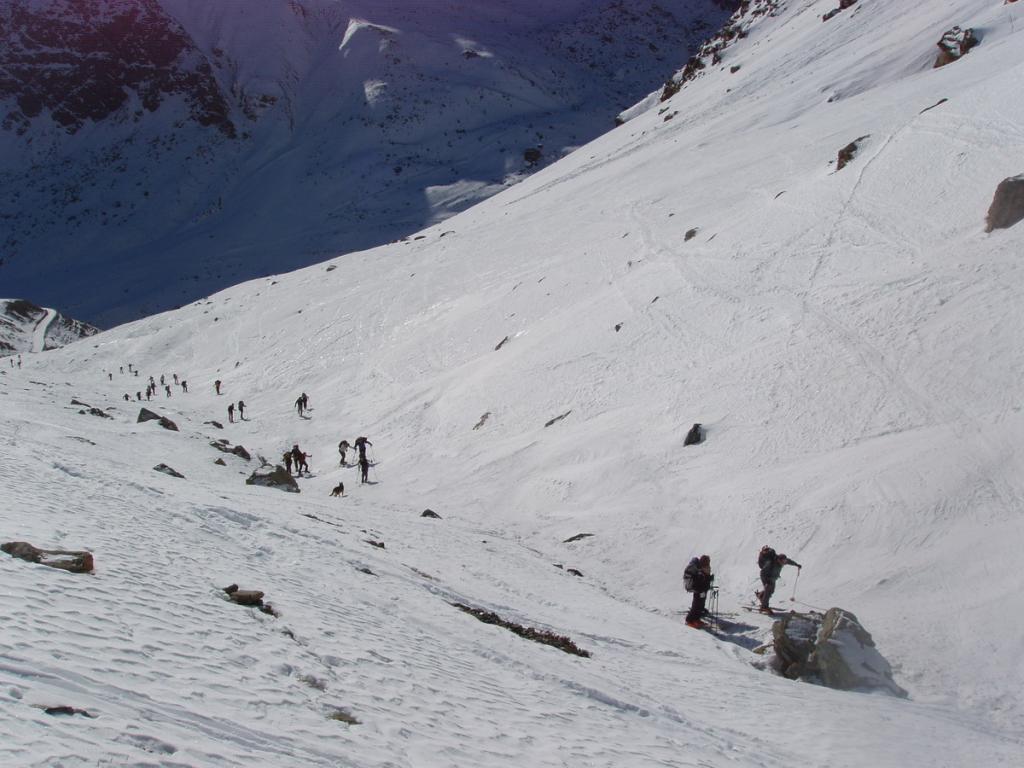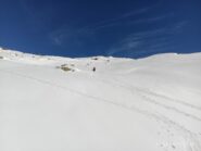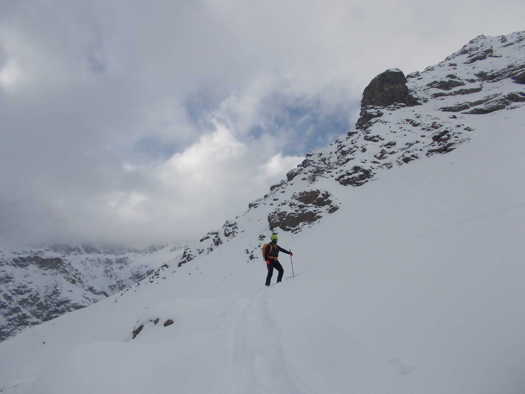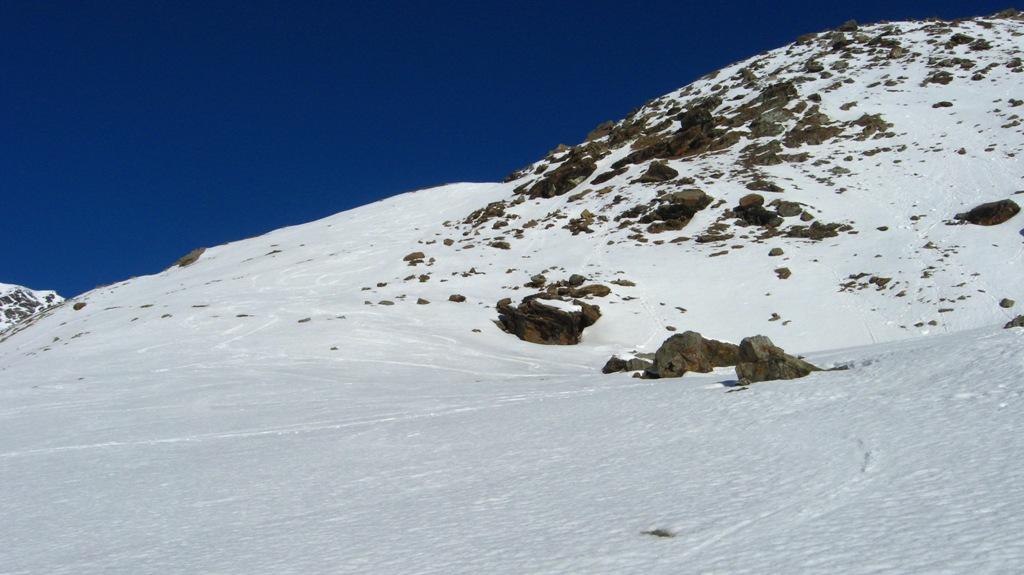 Dopo alcuni tornanti la si abbandona per risalire a dx un canalone prima ampio e poi via via un po piu’ stretto ( attenzione alle slavine che puntuali scendono sul versante sx di salita).