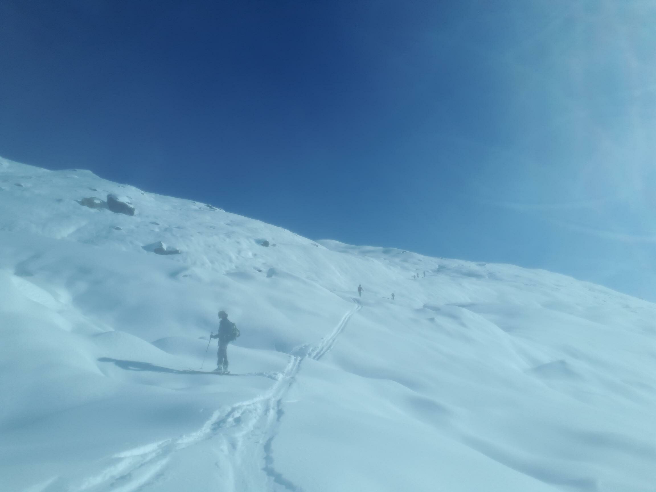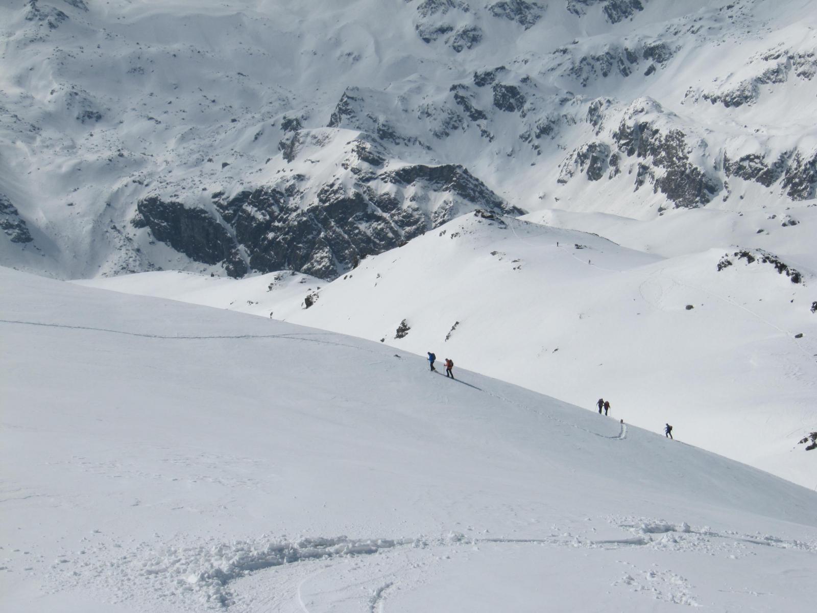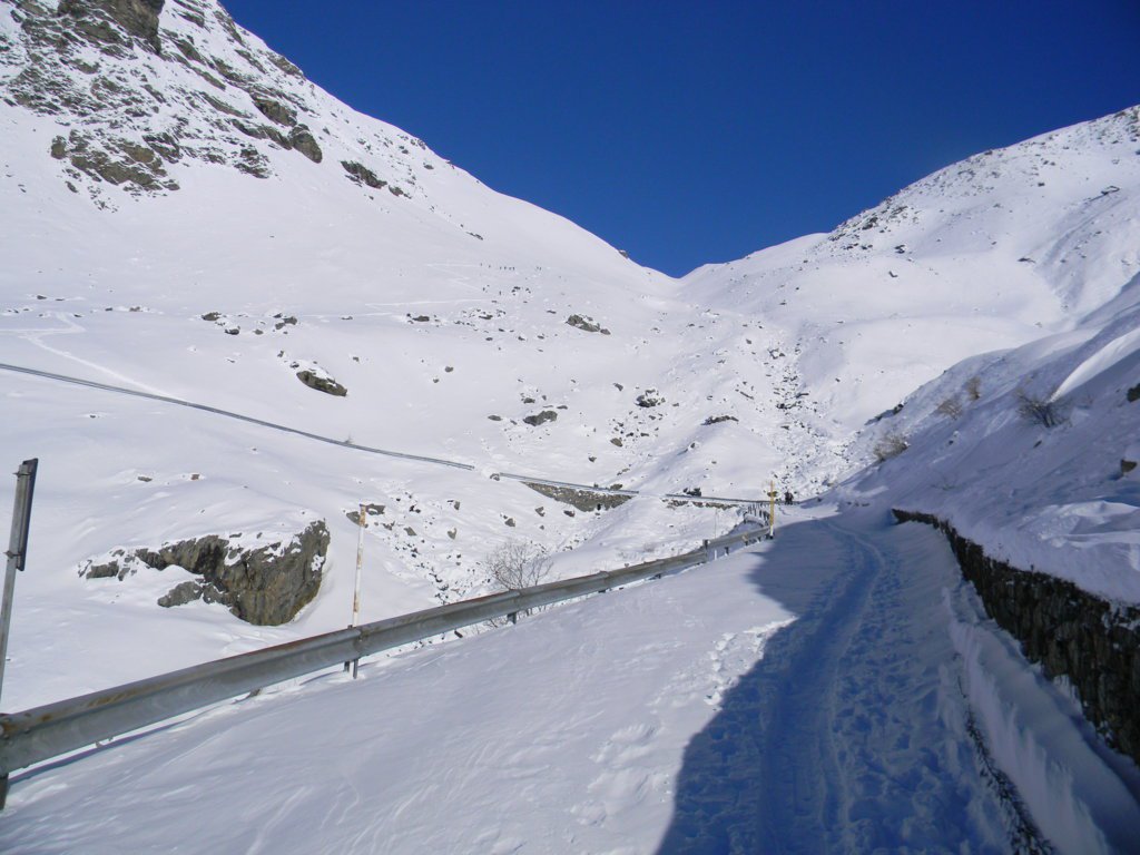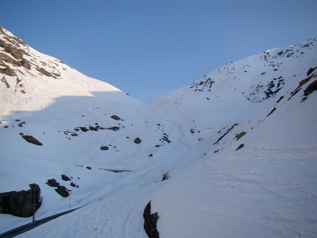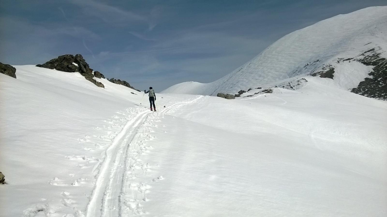 Dopo alcuni tornanti la si abbandona per risalire a dx un canalone prima ampio e poi via via un po piu’ stretto ( attenzione alle slavine che puntuali scendono sul versante sx di salita).