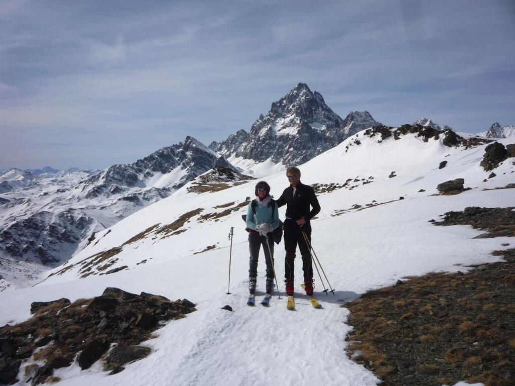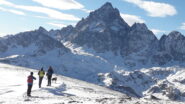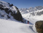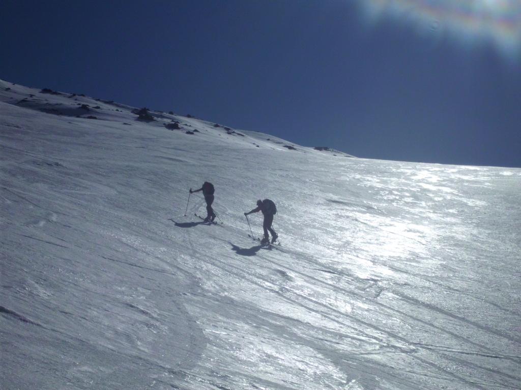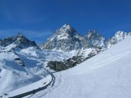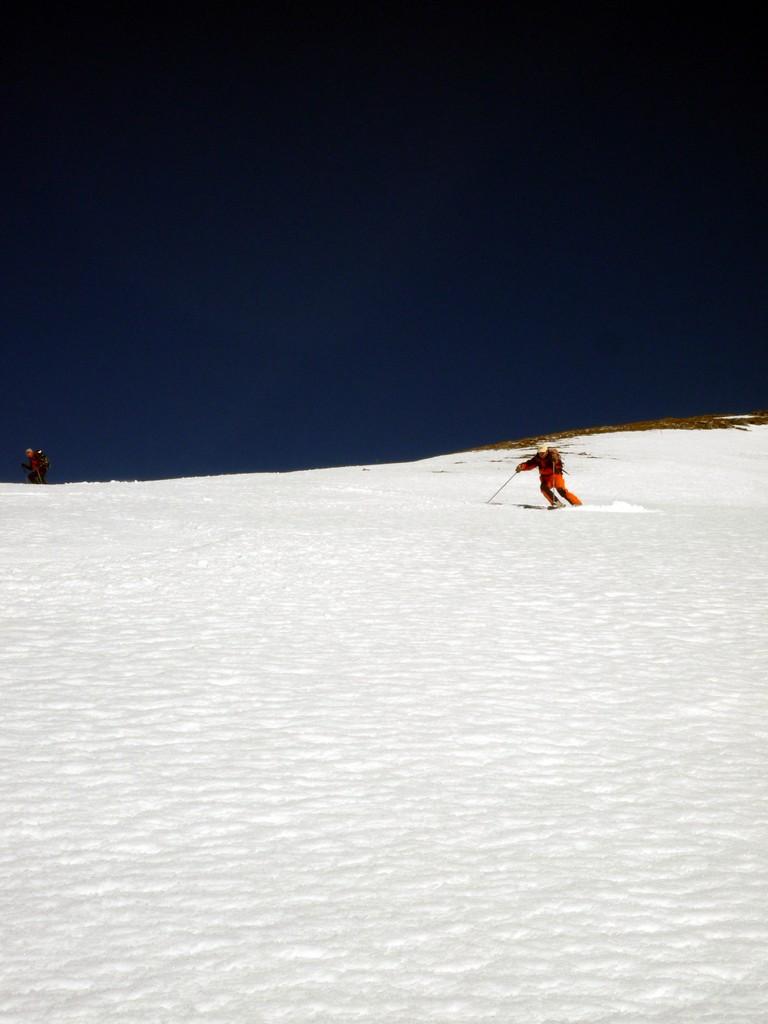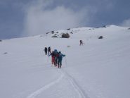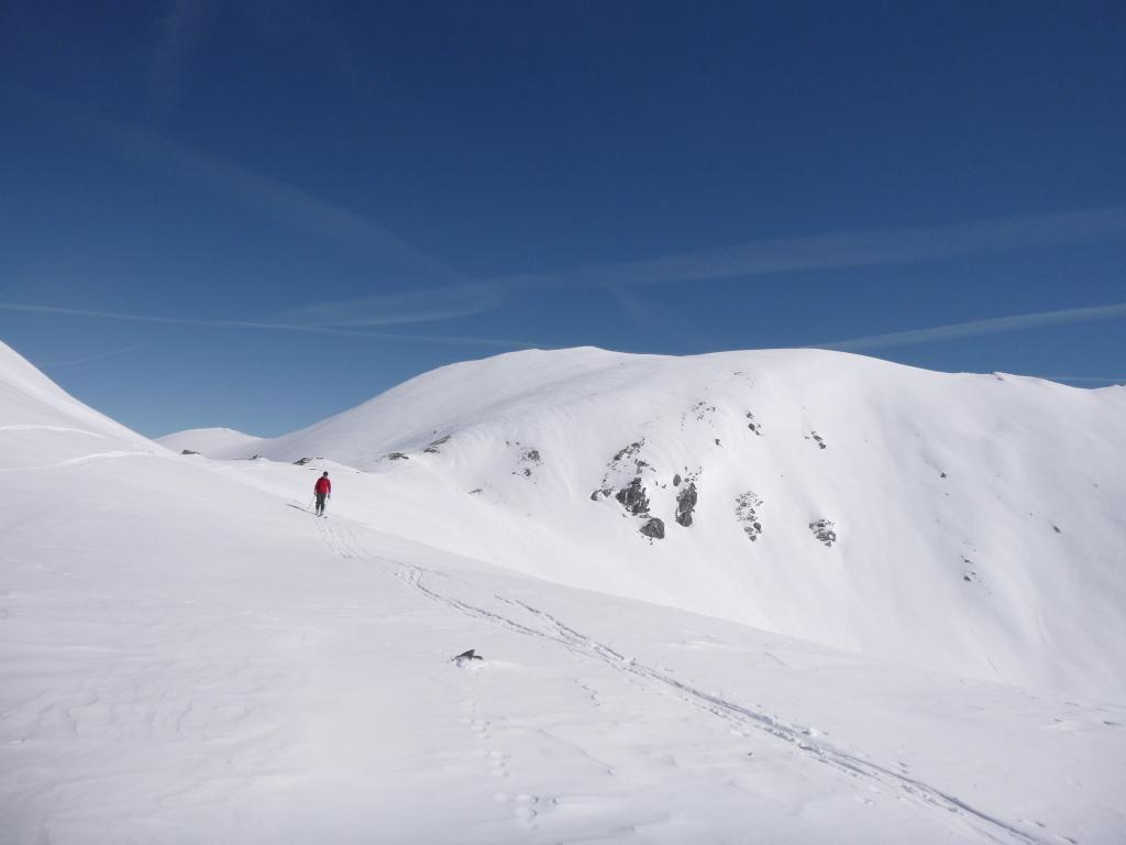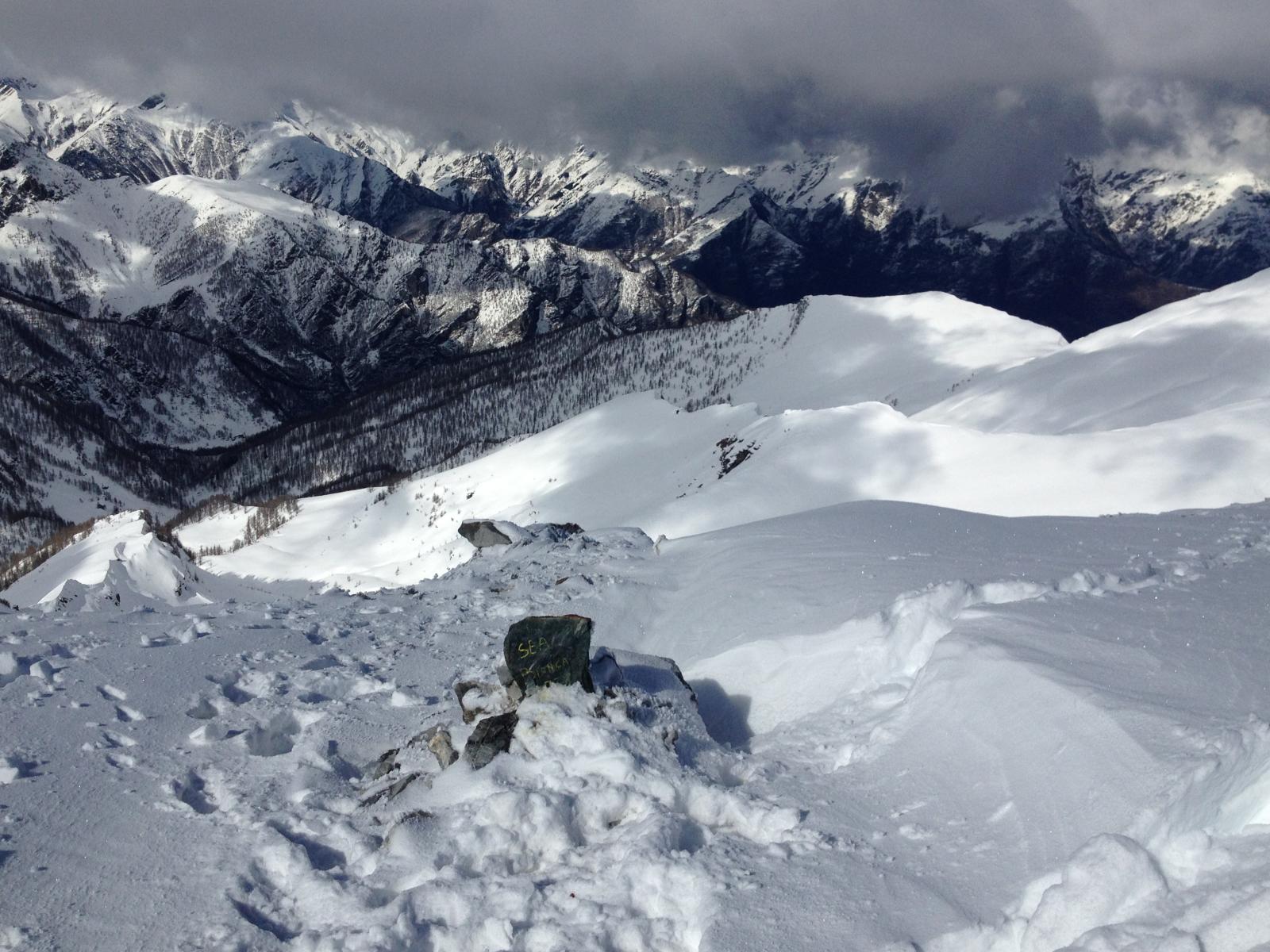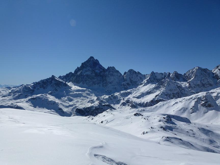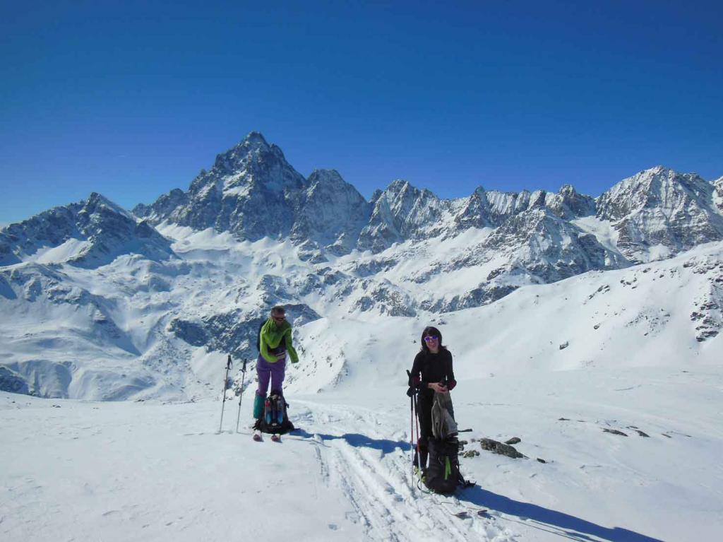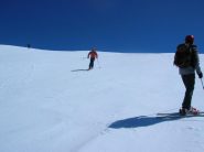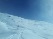 Si volge decisamente a dx fino a raggiungere una dorsale da cui piegando a sx sulla cresta si raggiunge un piccolo collettino e di qui con un ultimo breve ma piu’ ripido pendio la cima con magnifica vista sull’imponente Monviso.
