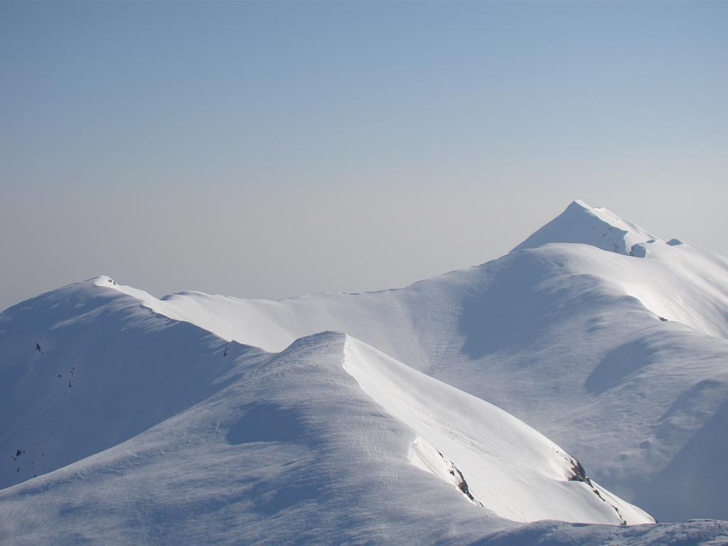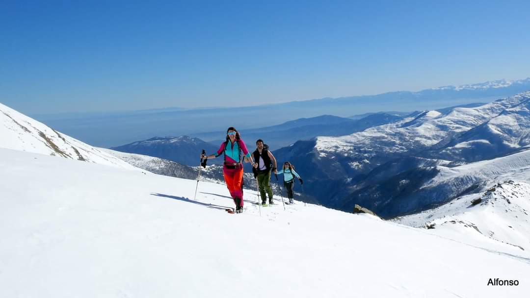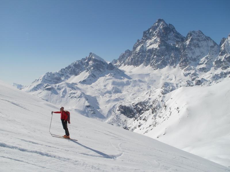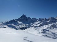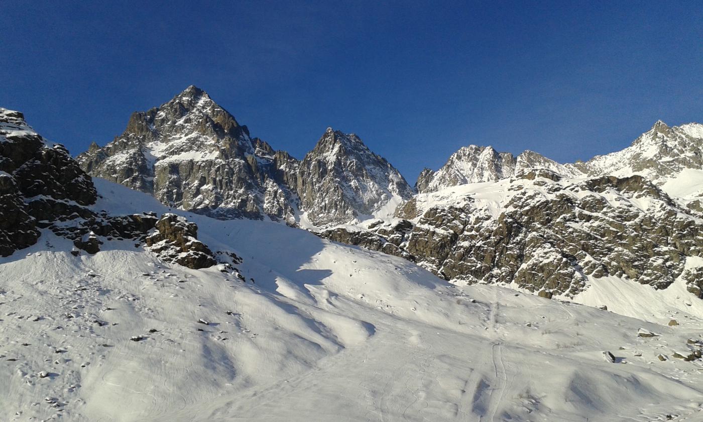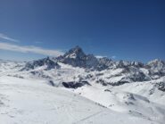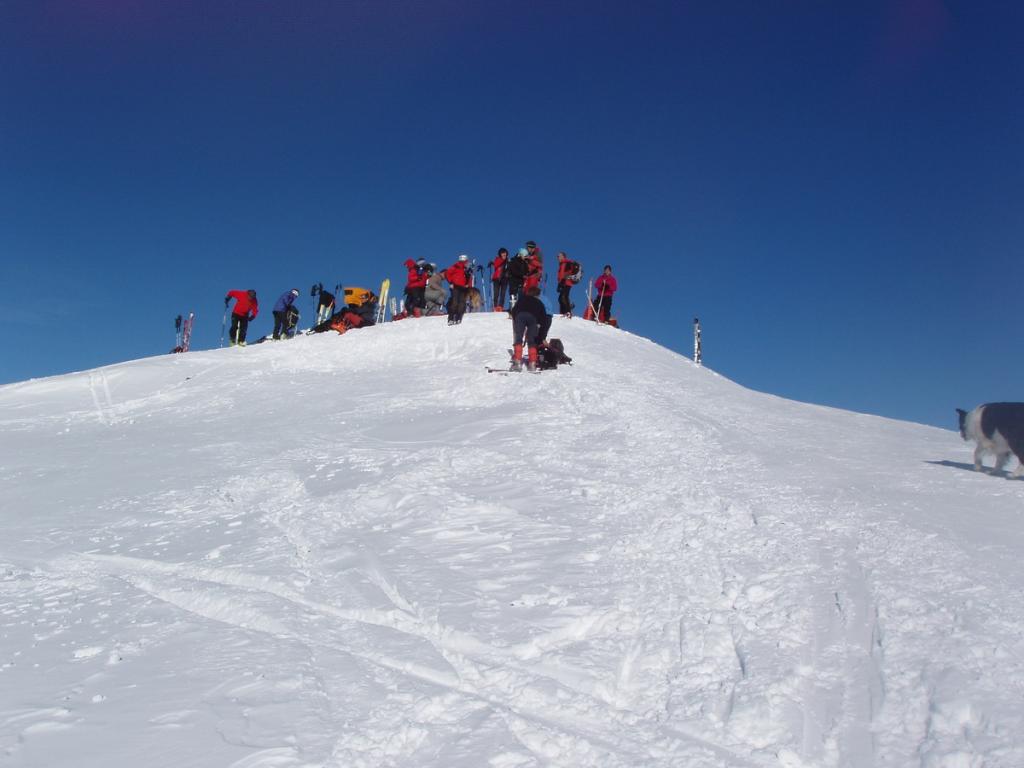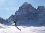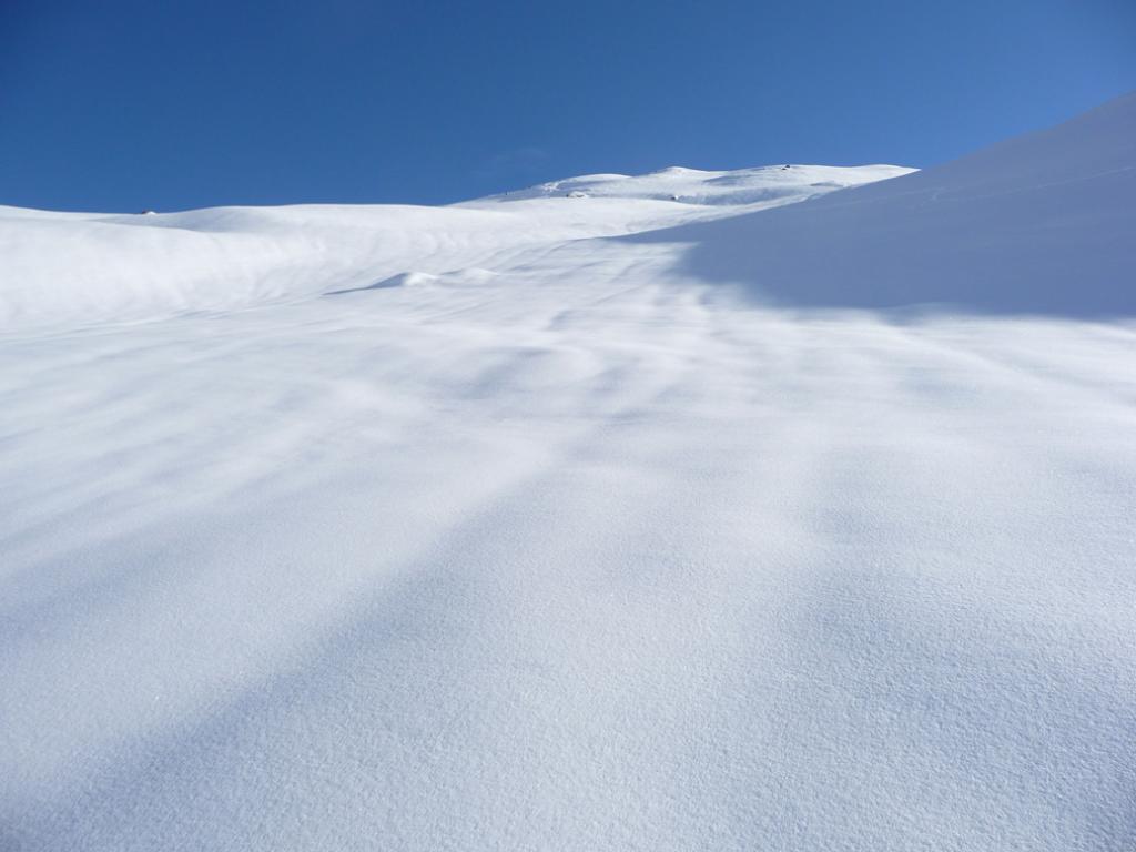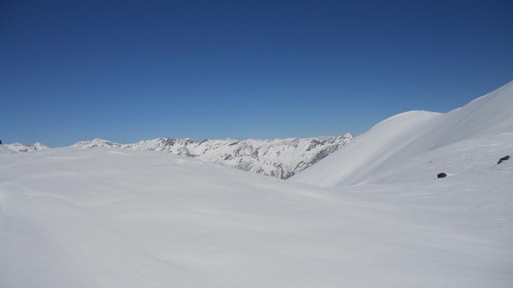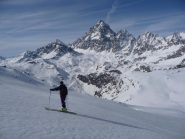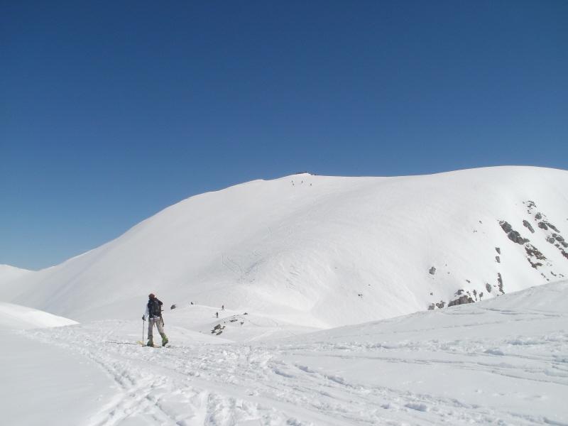 Si volge decisamente a dx fino a raggiungere una dorsale da cui piegando a sx sulla cresta si raggiunge un piccolo collettino e di qui con un ultimo breve ma piu’ ripido pendio la cima con magnifica vista sull’imponente Monviso.