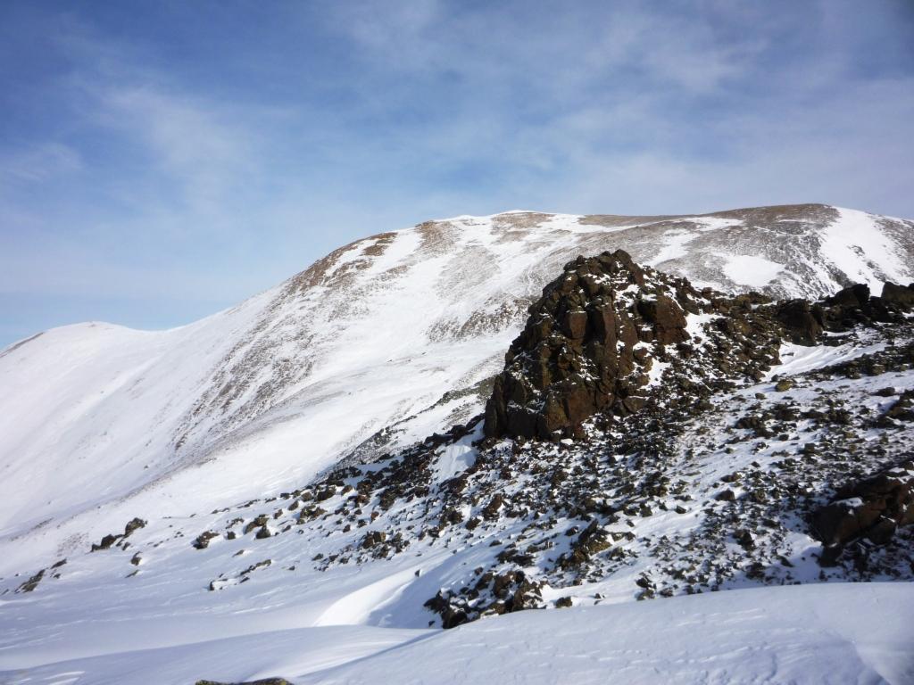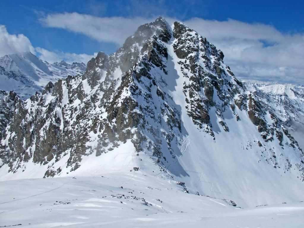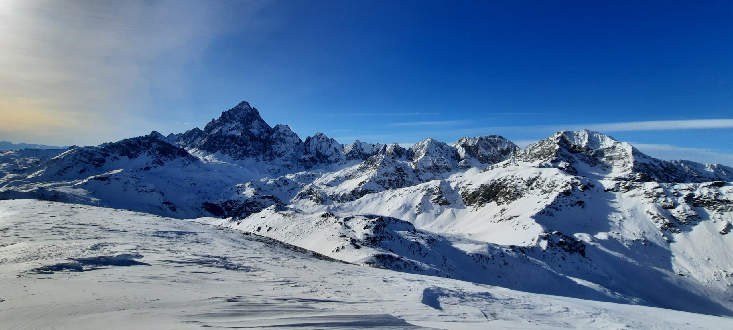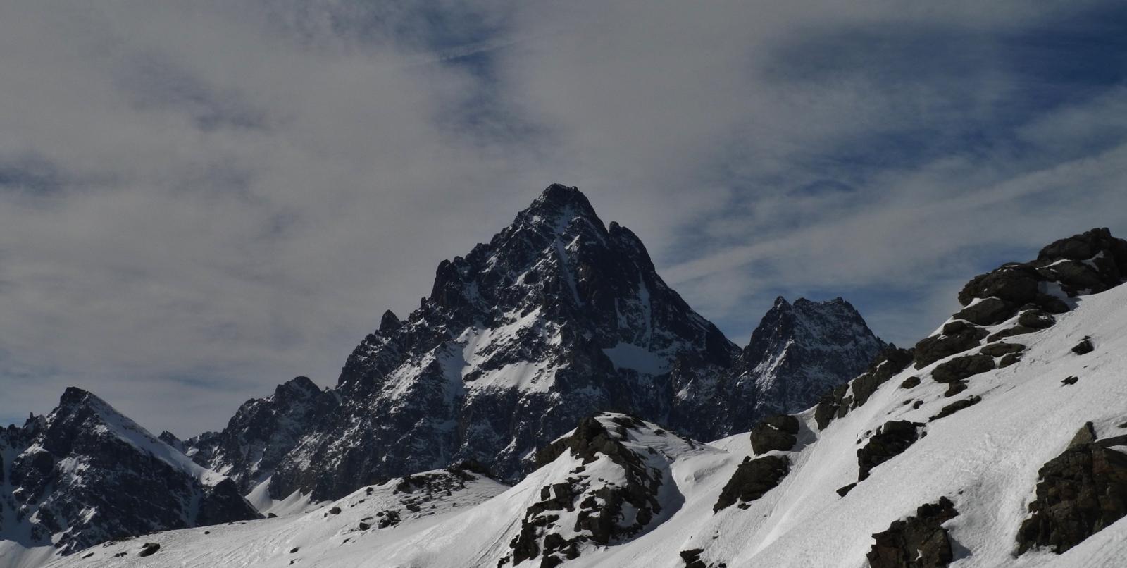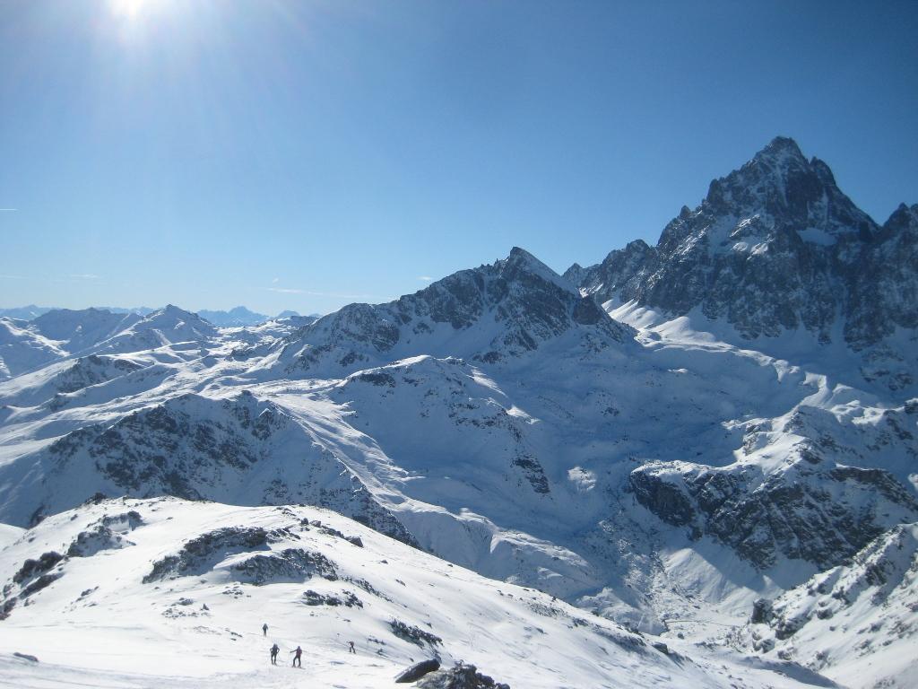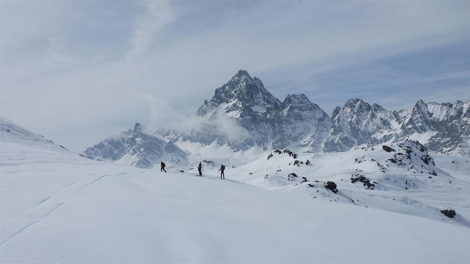 Si volge decisamente a dx fino a raggiungere una dorsale da cui piegando a sx sulla cresta si raggiunge un piccolo collettino e di qui con un ultimo breve ma piu’ ripido pendio la cima con magnifica vista sull’imponente Monviso.