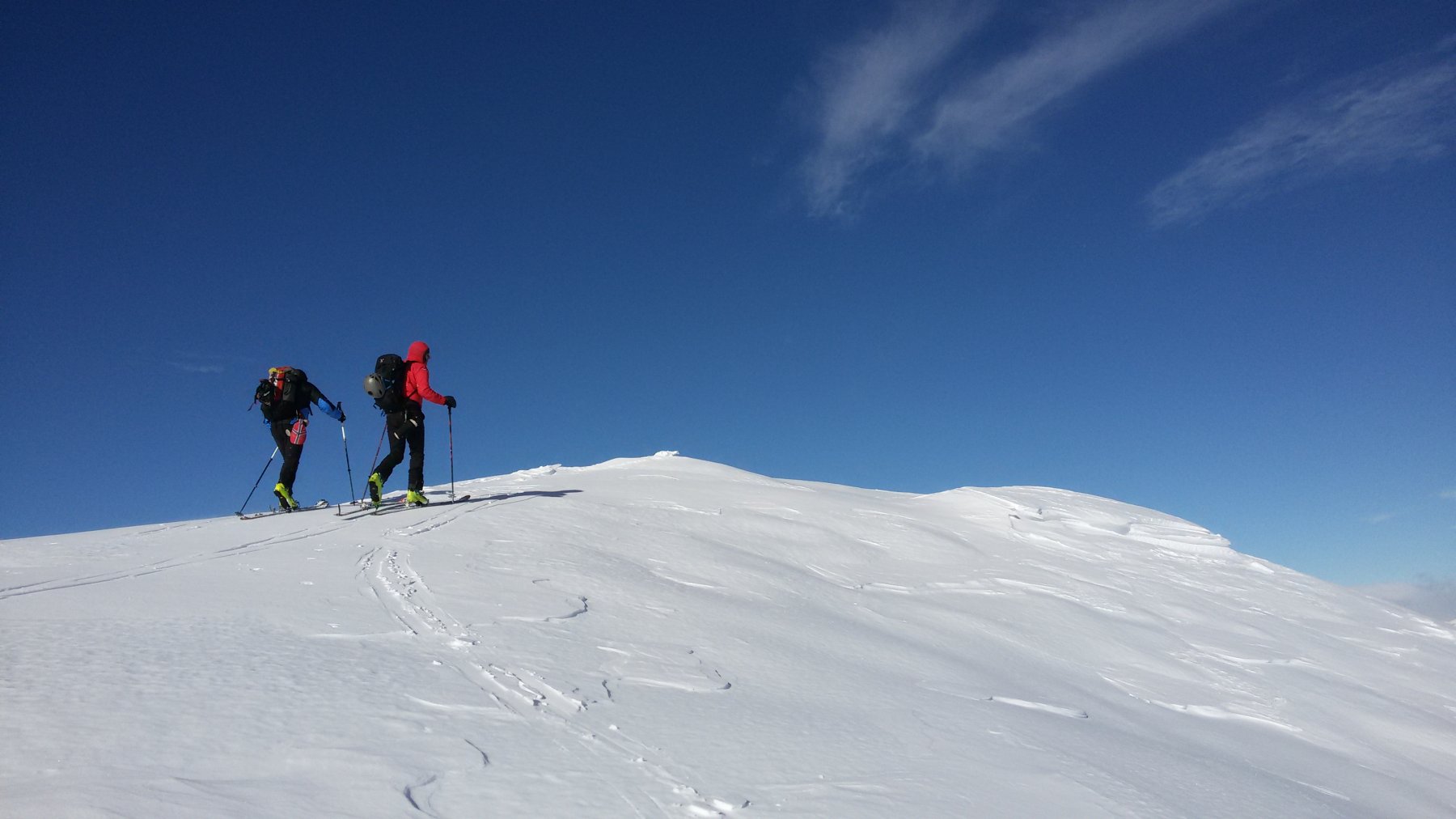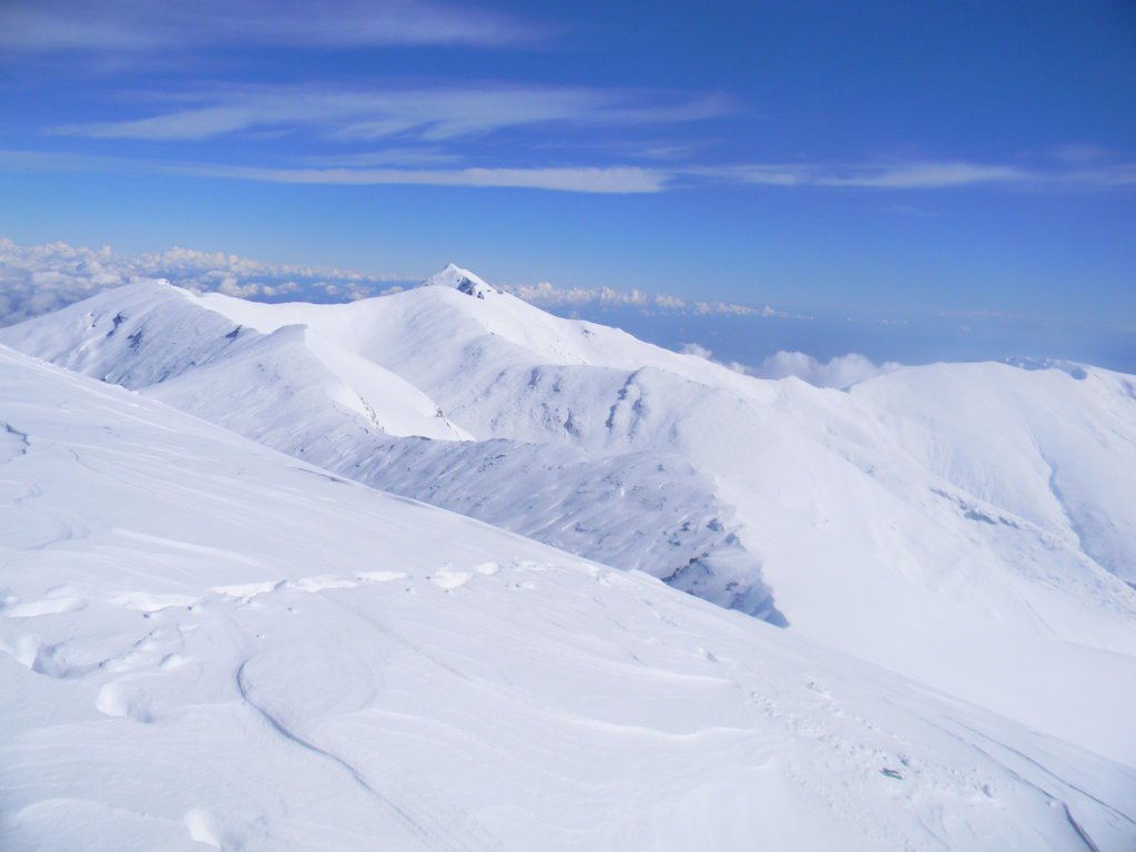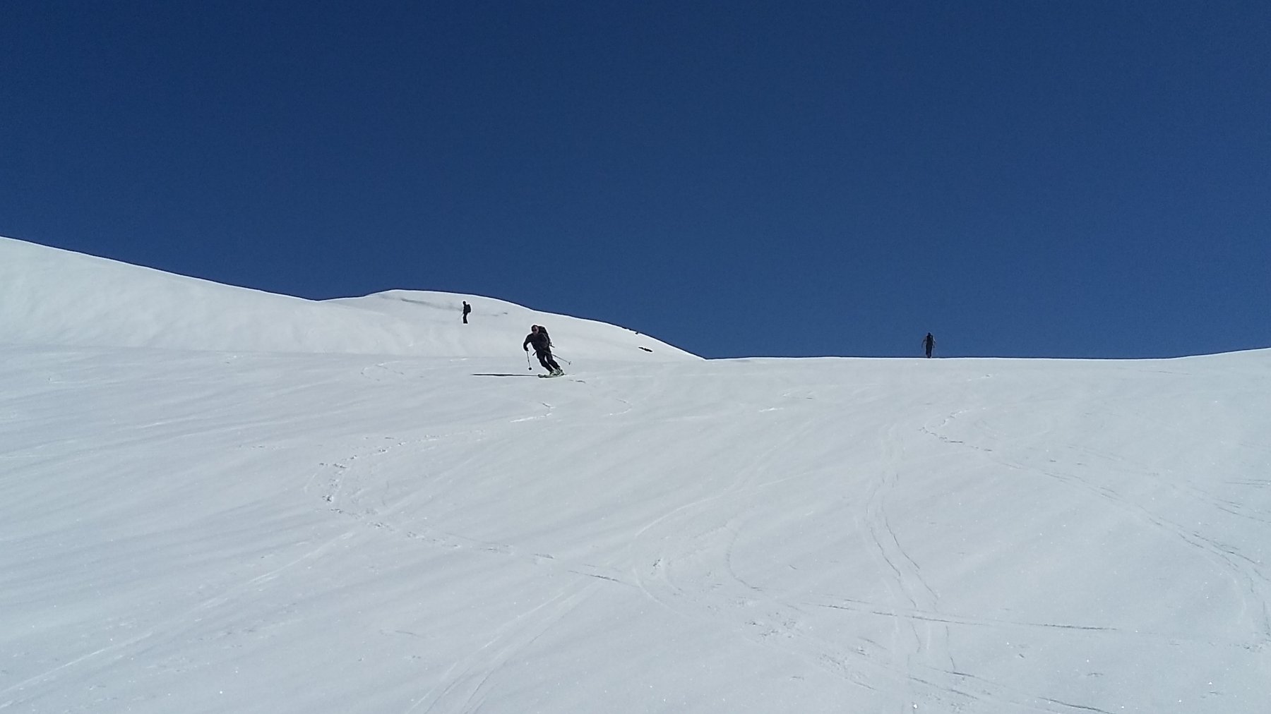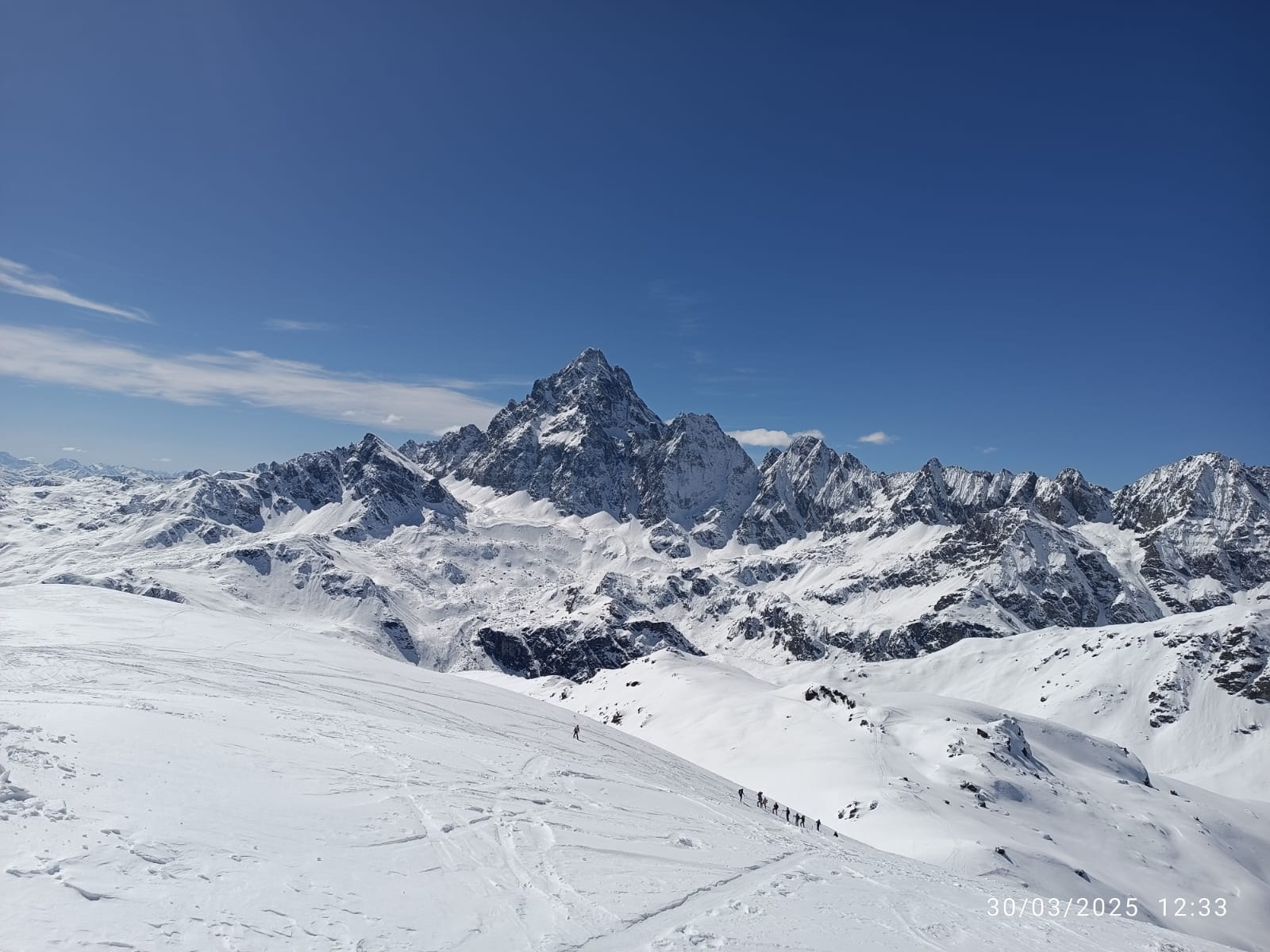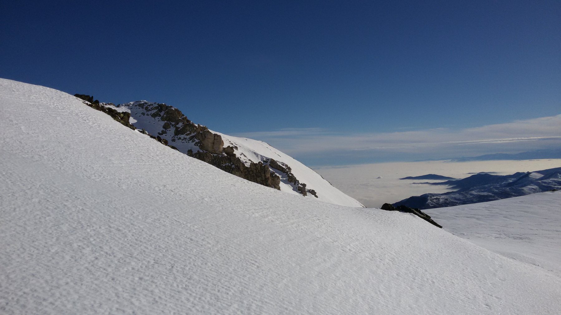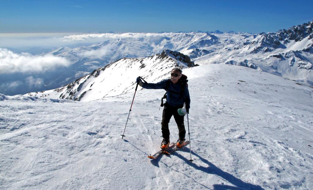 Si volge decisamente a dx fino a raggiungere una dorsale da cui piegando a sx sulla cresta si raggiunge un piccolo collettino e di qui con un ultimo breve ma piu’ ripido pendio la cima con magnifica vista sull’imponente Monviso.