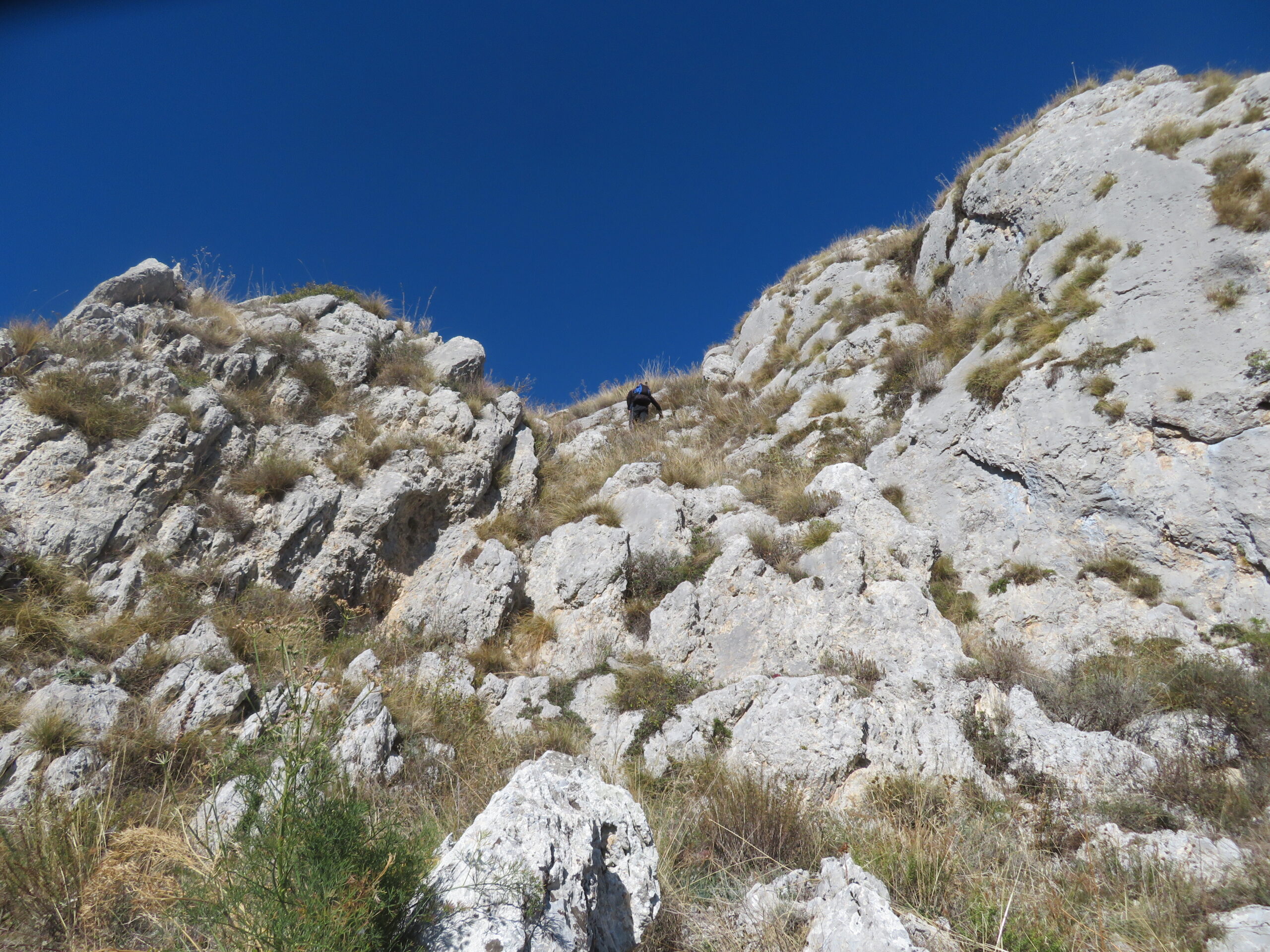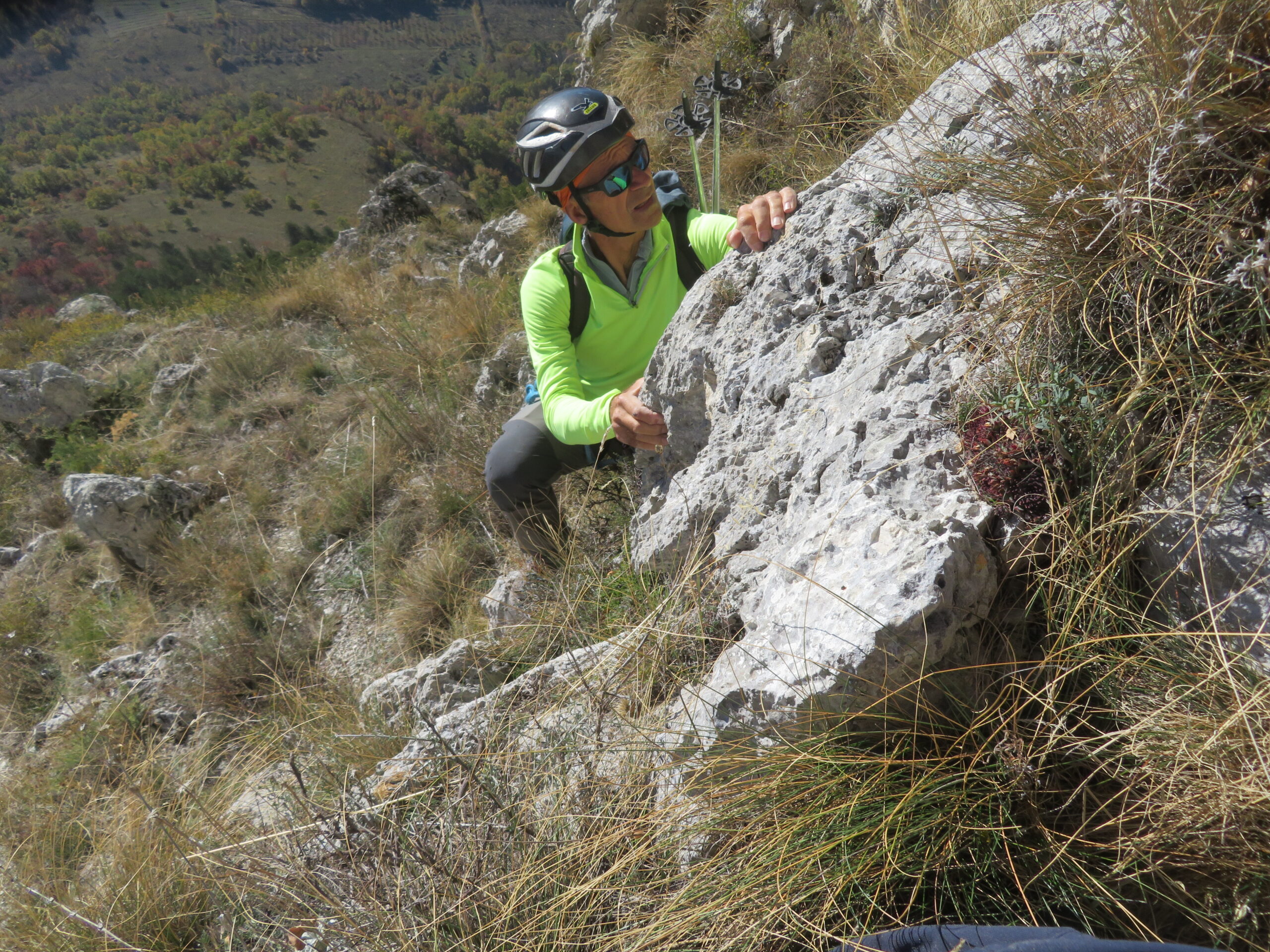 Monte Secino per Cresta Sud-Ovest: dal Parking gole di Celano si segue il sentiero per le gole per 20-30m Appena si apre a dx un prato lo si attraversa. Si sale in obliquo verso dx in direzione di una costruzione diruta. Si passa sotto un muro a secco. Si continua in obliquo verso dx prendendo quota. Si raggiunge un altro muro a secco. Si sale lungo la massima pendenza per canali (I-II) con roccia, erba, piante radici. Finalmente si raggiunge la dorsale. Qui si trovano tracce di sentiero. Si segue lungamente la traccia di sentiero, alternata a passaggetti su roccia facili. Alla fine si arriva alla base di una grande falesia, crestone roccioso. Si seguono le tracce che lambiscono a dx alla base la falesia. Dopo l’ultimo boschetto, si arriva ad un largo canale a trifoglio. Trascurare il ramo di dx, molto erboso e quello centrale con un camino impegnativo alla base. Si sale il canale di sx (dx orografica) con passaggetti di II-II+. Superata la falesia si continua per roccette fino alla larga cresta. Si segue la cresta facile fino ad un’ampia insellatura con monolito roccioso. Continuare per prati lungo la massima pendenza fino alla vetta, posta verso dx (lungo palo in vetta).