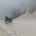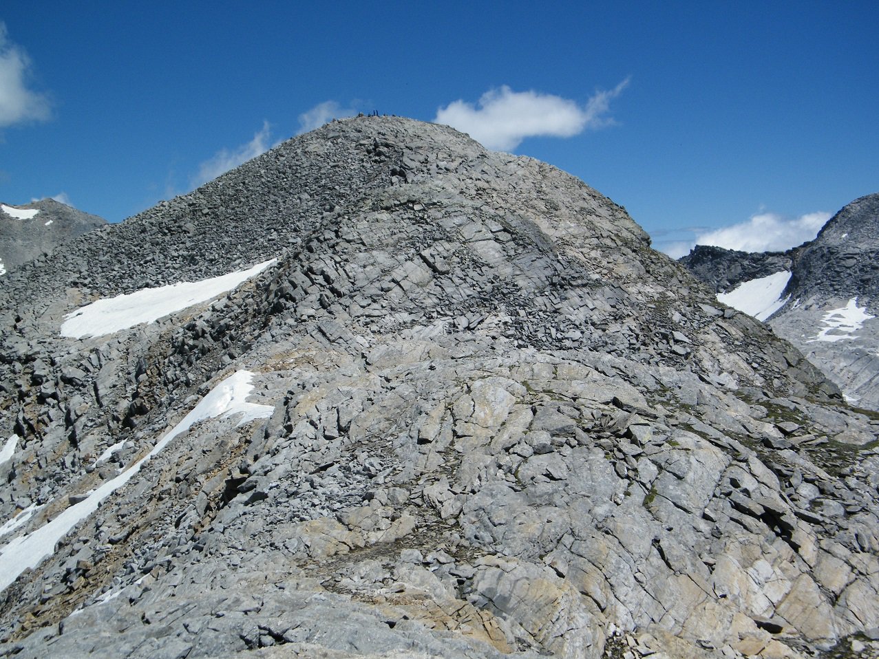 Dalla Bocchetta seguire integralmente il filo di cresta con qualche passaggio aereo su buona roccia, alternato a canalini in neve o pietrame, superando l’anticima (brevissima discesa) e poi fino in vetta.