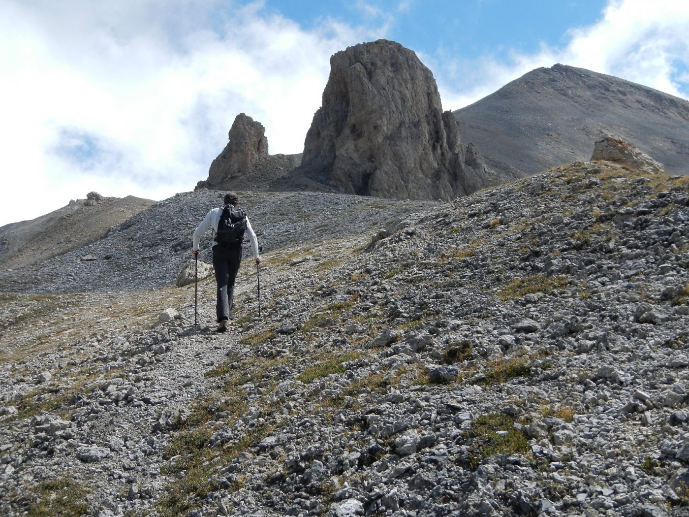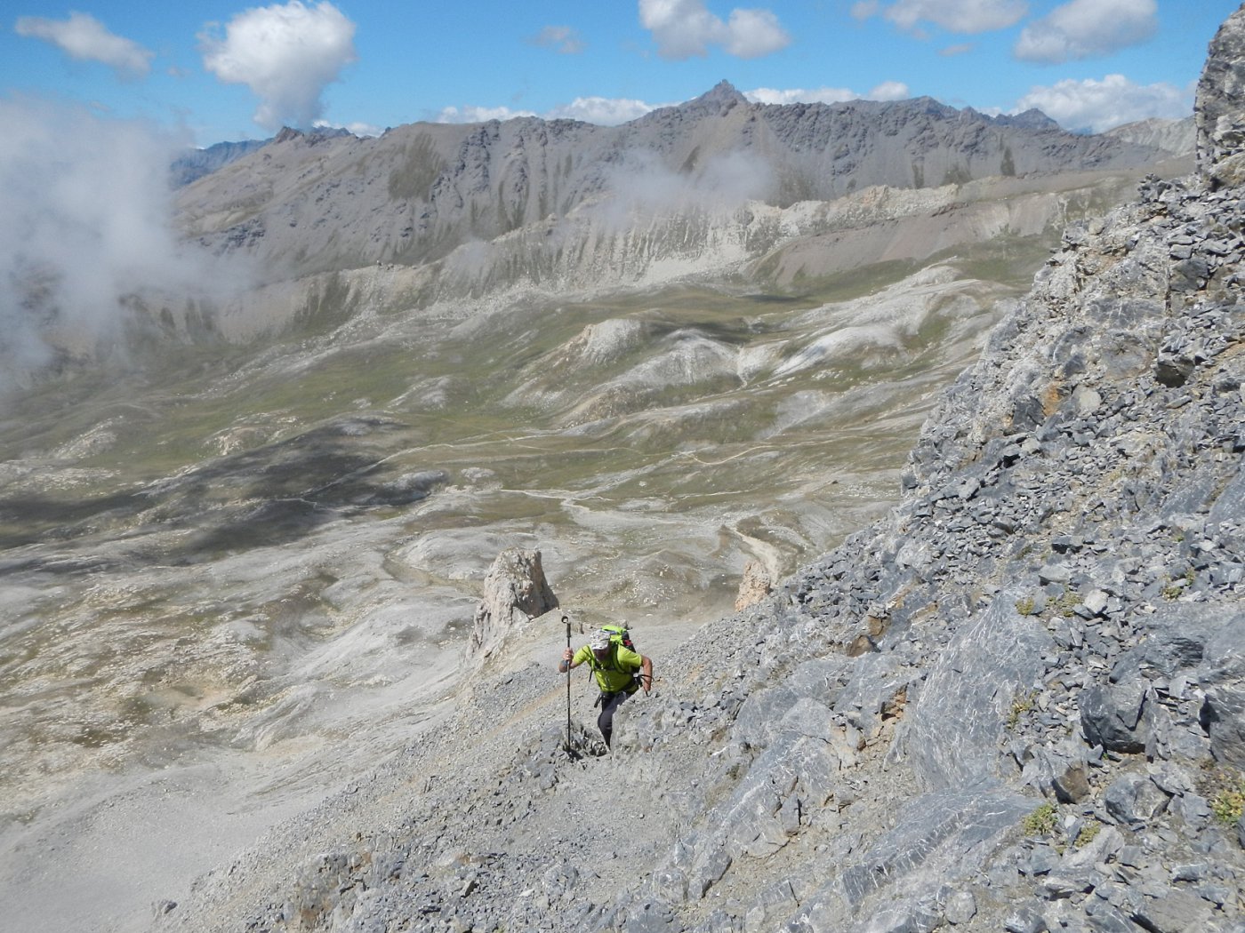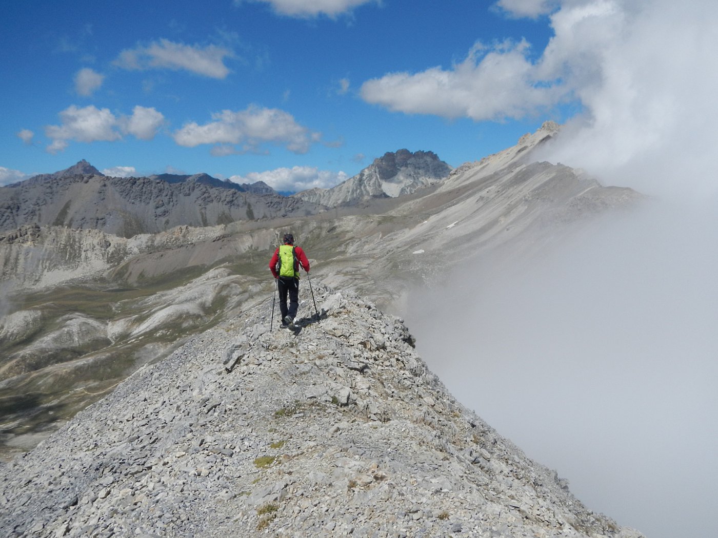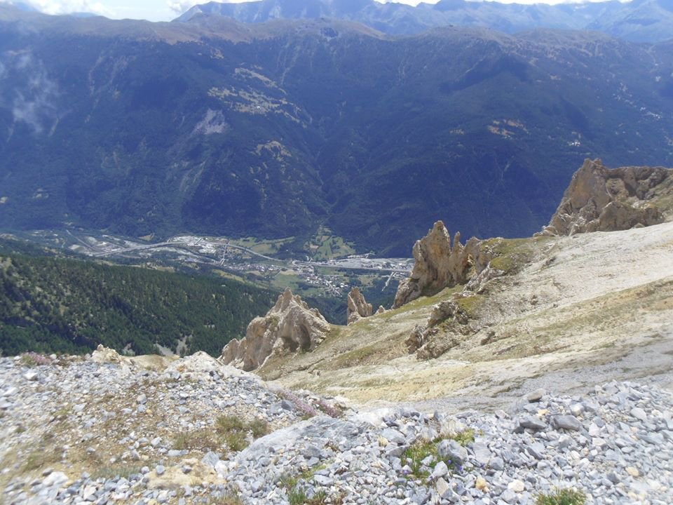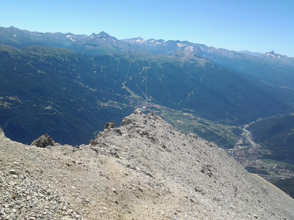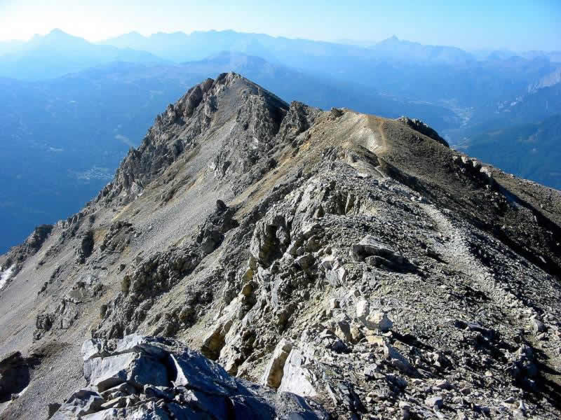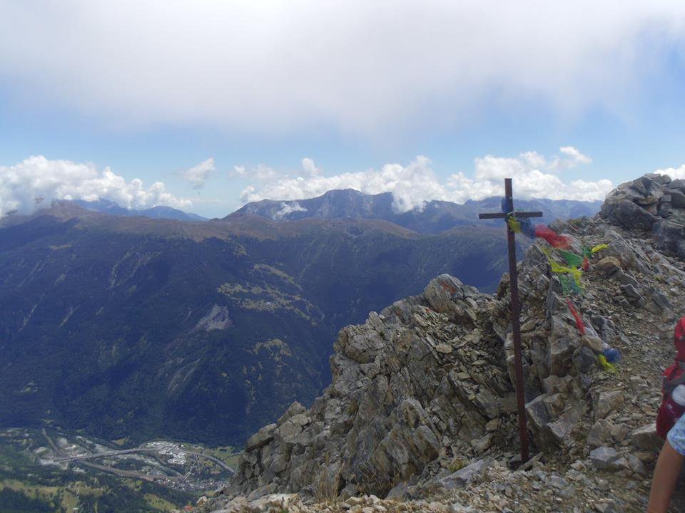 Di li’ si percorre la cresta N del Seguret con qualche saliscendi iniziale e poi con un ultimo strappo su detriti faticosi si raggiunge la vetta (2926 m). Una traccia continua a percorrere in leggera discesa la cresta fino a portarsi ad una croce (2890 m circa) con bella vista sulla valle e in particolare su Oulx, situata quasi 2000 m piu’ in basso.