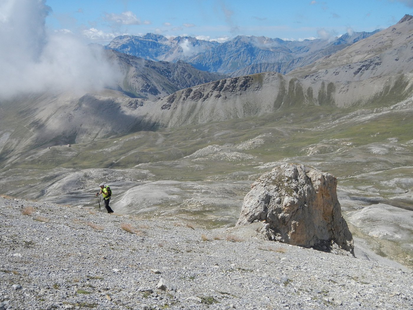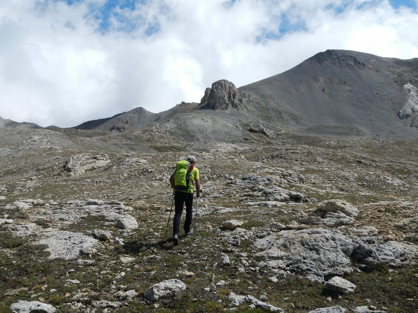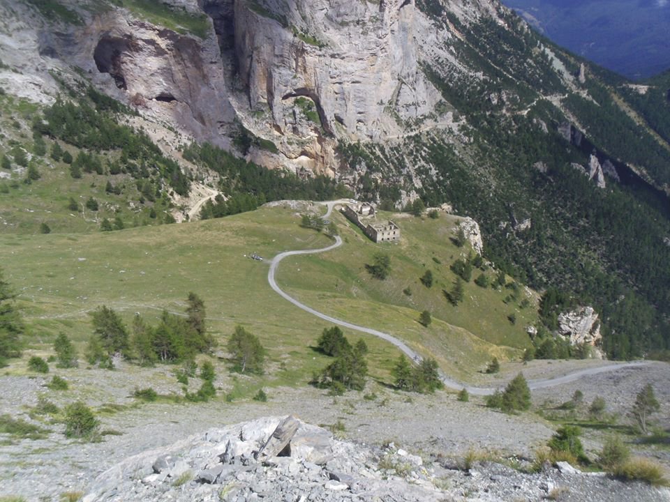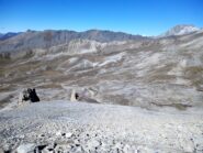 La si segue verso destra per circa 500 m fino a prendere una traccia (2250 m circa) che si stacca verso sinistra e risale il pendio erboso in direzione di un rudere ben visibile in lontananza. Raggiunto il rudere (casermetta, circa 2500 m) si attraversa con un grande arco il bellissimo pianoro soprastante fino a portarsi, con un ultimo tratto su detrito al colle dell’ Argentera (2796 m).