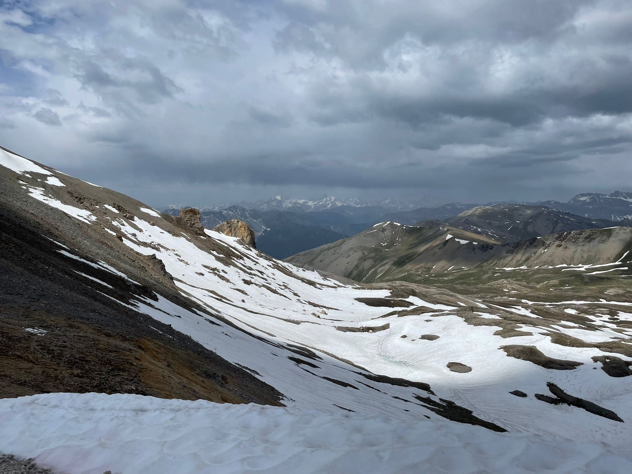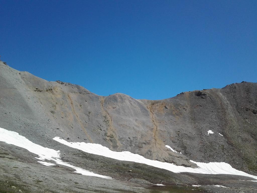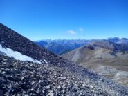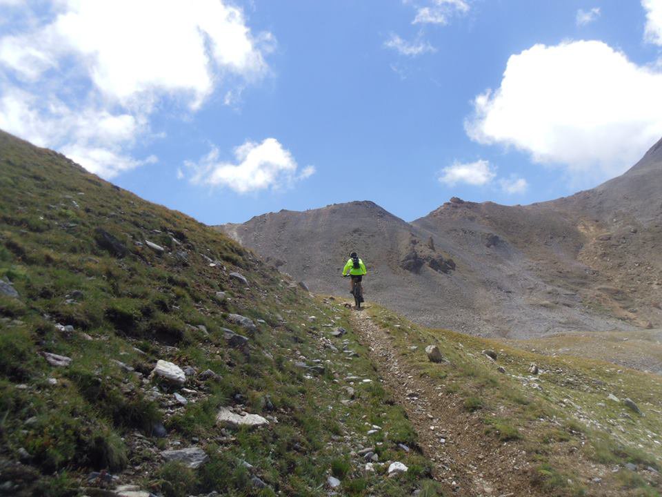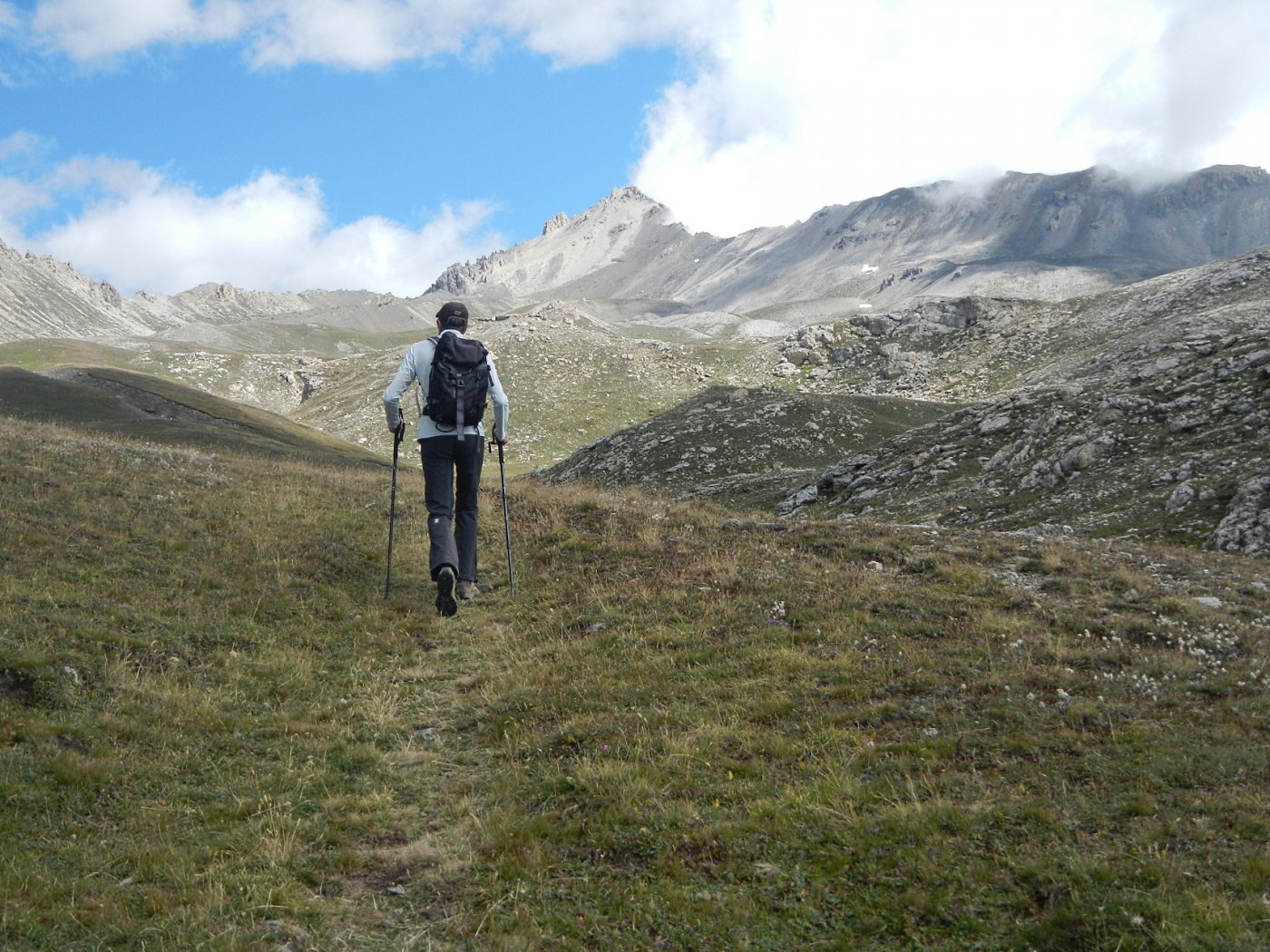 La si segue verso destra per circa 500 m fino a prendere una traccia (2250 m circa) che si stacca verso sinistra e risale il pendio erboso in direzione di un rudere ben visibile in lontananza. Raggiunto il rudere (casermetta, circa 2500 m) si attraversa con un grande arco il bellissimo pianoro soprastante fino a portarsi, con un ultimo tratto su detrito al colle dell’ Argentera (2796 m).
