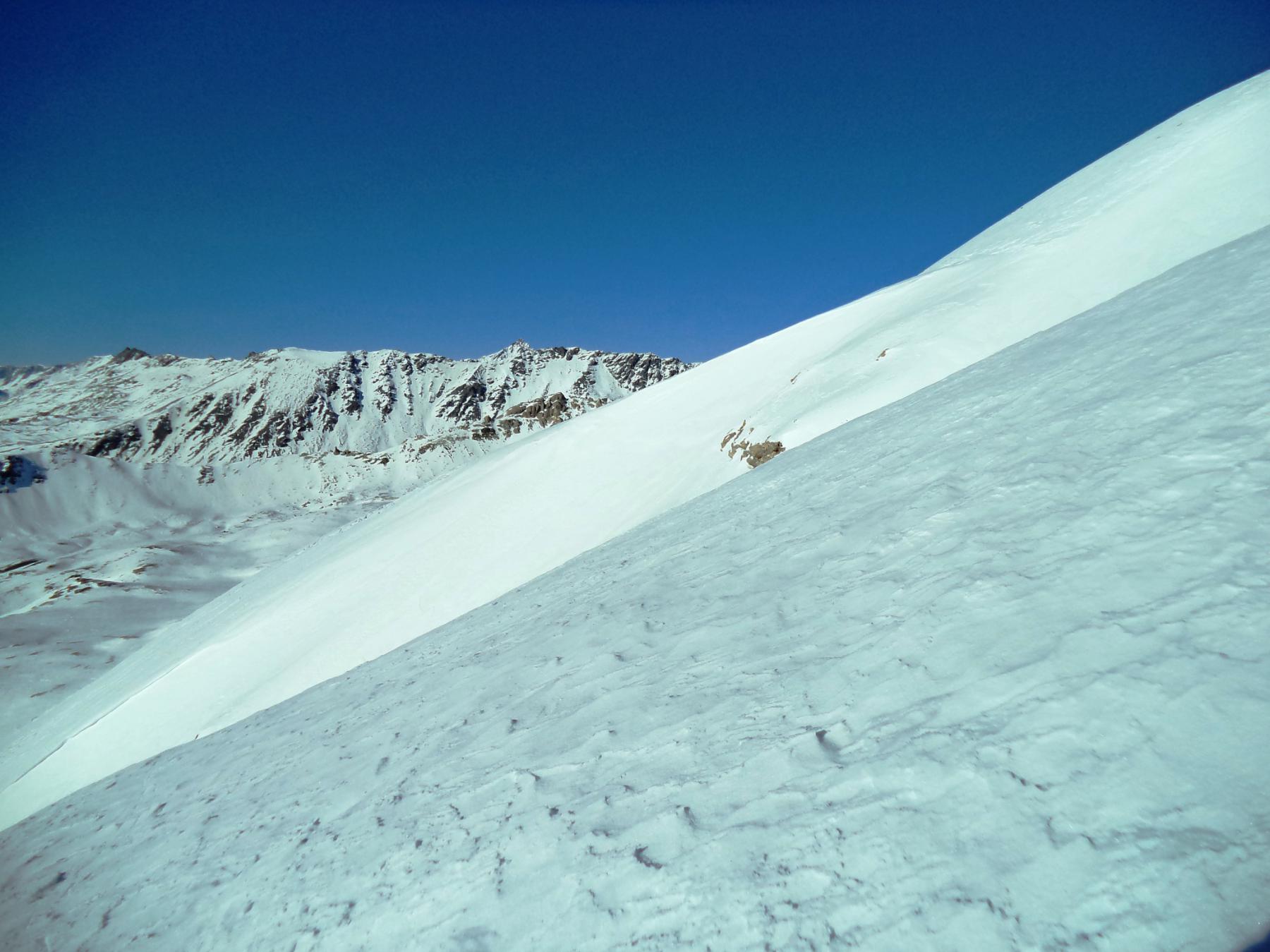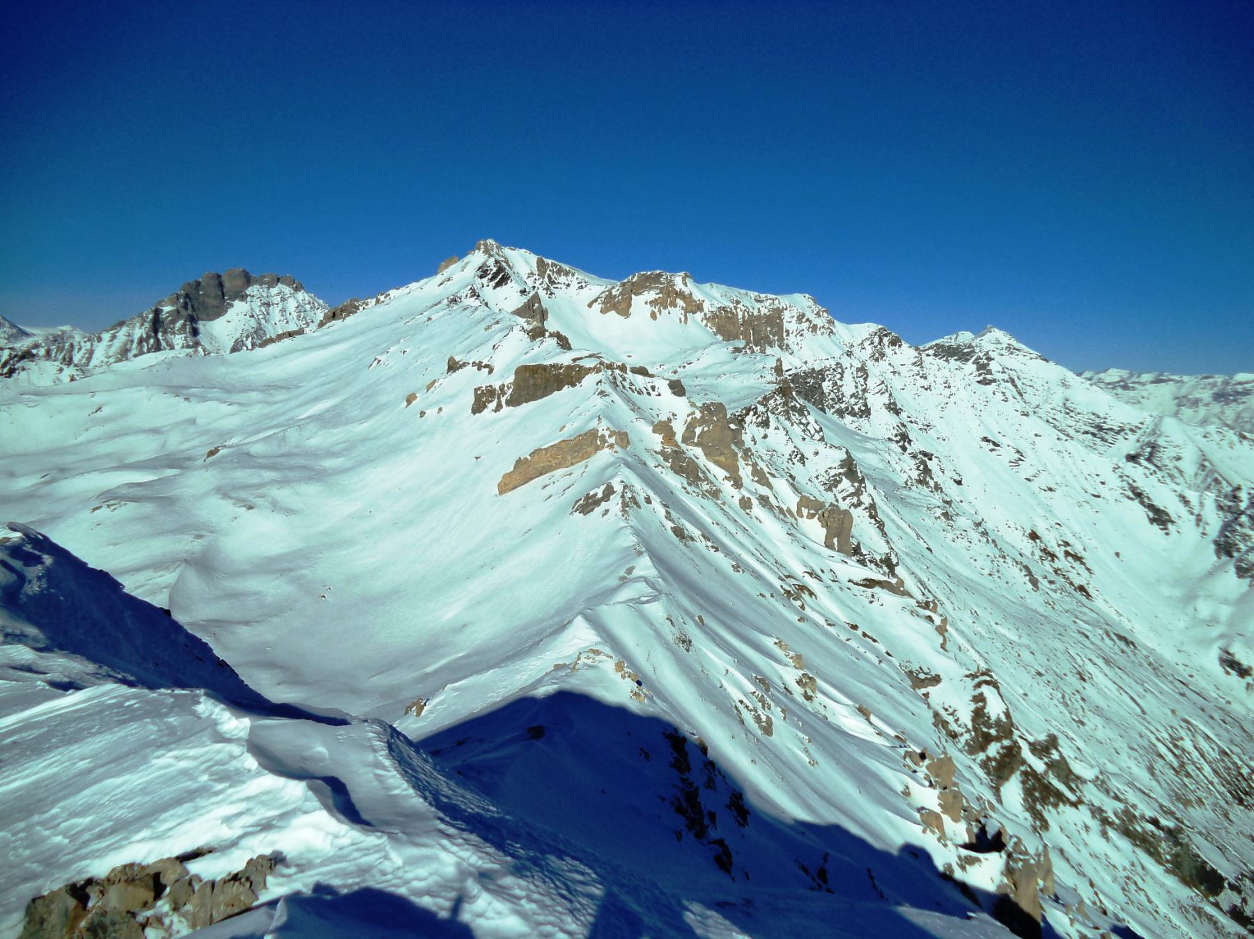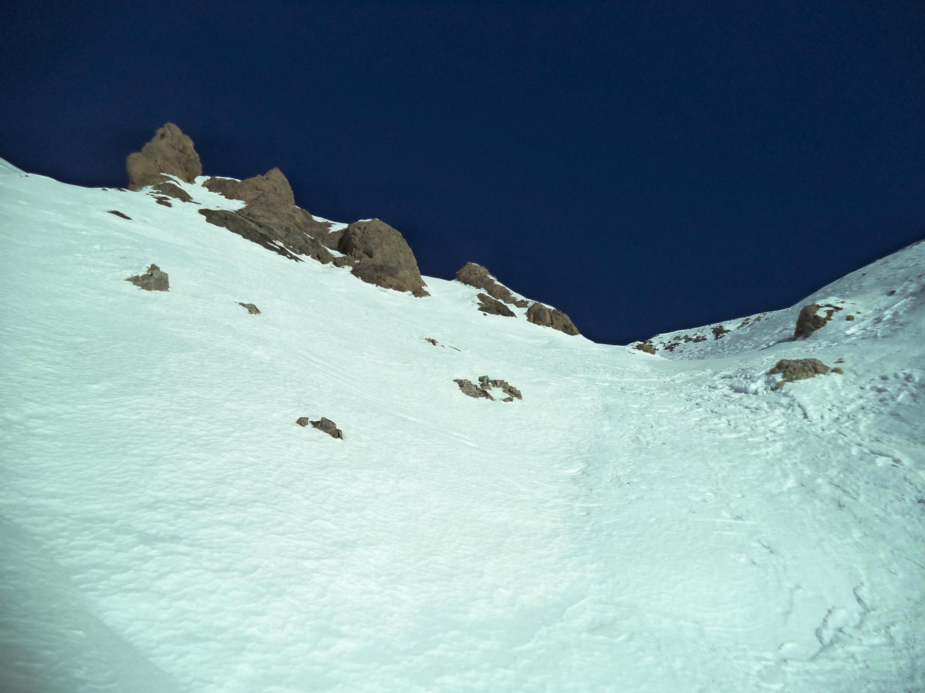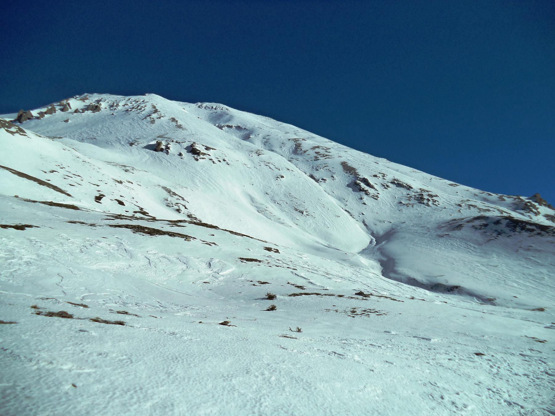 Subito dopo l’uscita della galleria dei Saraceni imboccare sulla sinistra idrografica il valloncello del primo rio, quindi per ampi pendii risalire per circa 200 m fino a raggiungere un’altro rio delimitato da pareti verticali. Attraversarlo appena possibile e con ampio semicerchio puntare in direzione della prima ripida dorsale che scende dalla vetta in direzione ovest. Risalirla per quanto possibile sci ai piedi o a spalla in caso di neve ghiacciata fino a raggiungere l’anticima del monte in corrispondenza della dorsale di discesa.