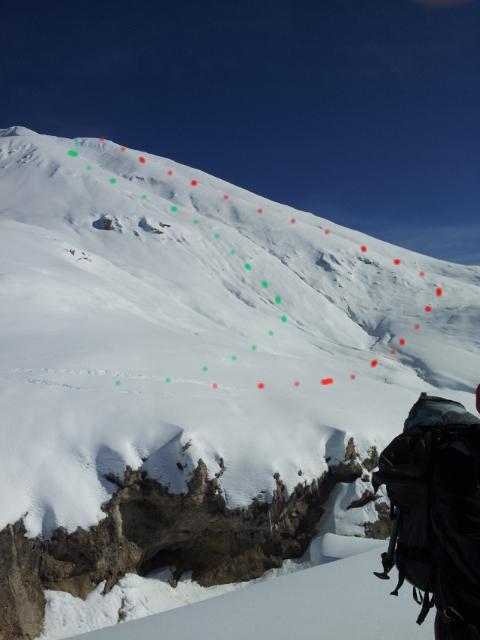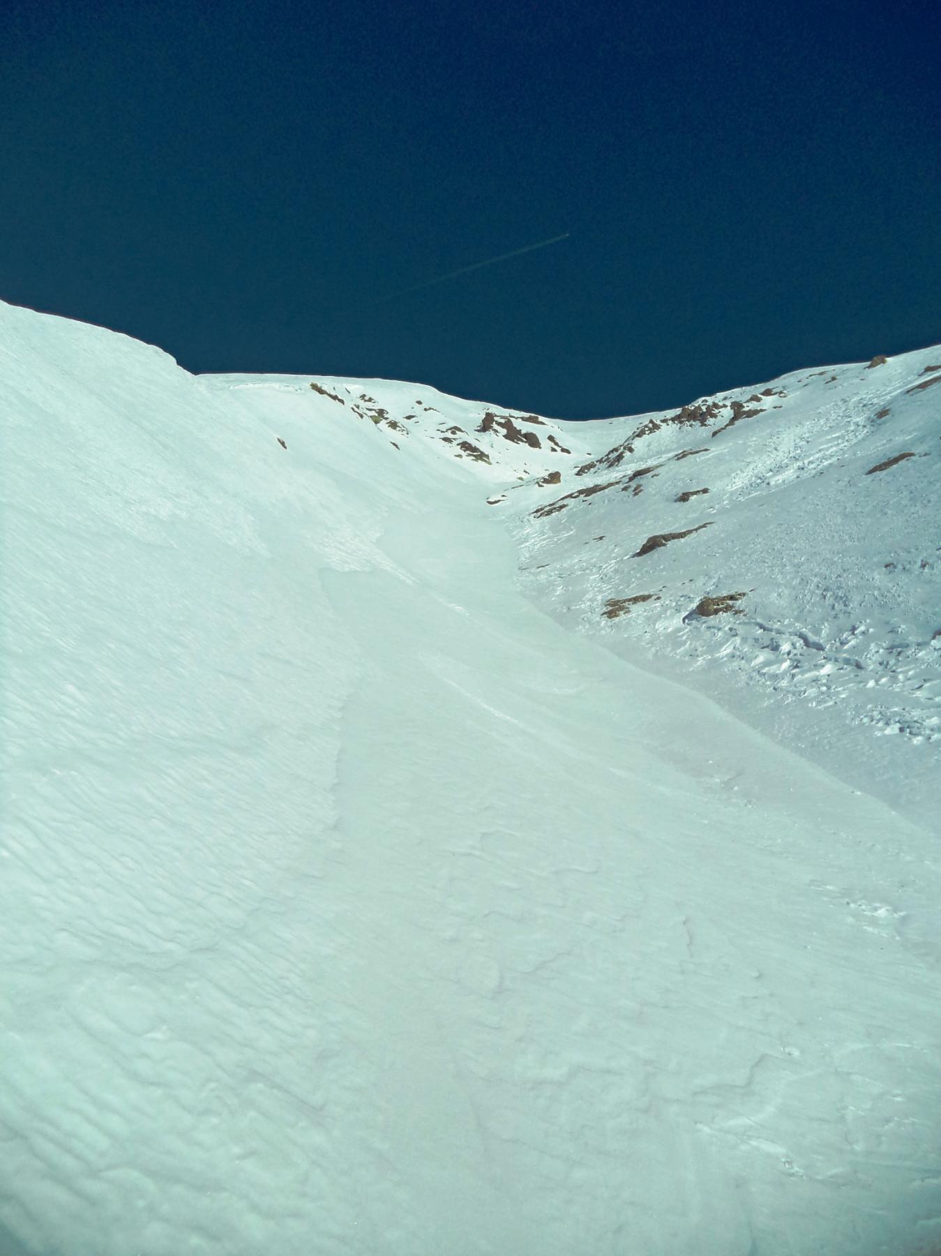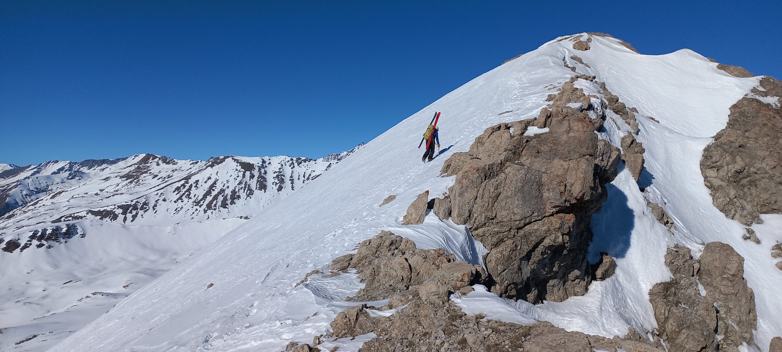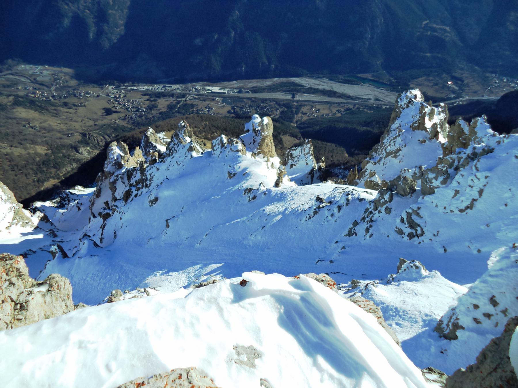 Subito dopo l’uscita della galleria dei Saraceni imboccare sulla sinistra idrografica il valloncello del primo rio, quindi per ampi pendii risalire per circa 200 m fino a raggiungere un’altro rio delimitato da pareti verticali. Attraversarlo appena possibile e con ampio semicerchio puntare in direzione della prima ripida dorsale che scende dalla vetta in direzione ovest. Risalirla per quanto possibile sci ai piedi o a spalla in caso di neve ghiacciata fino a raggiungere l’anticima del monte in corrispondenza della dorsale di discesa.