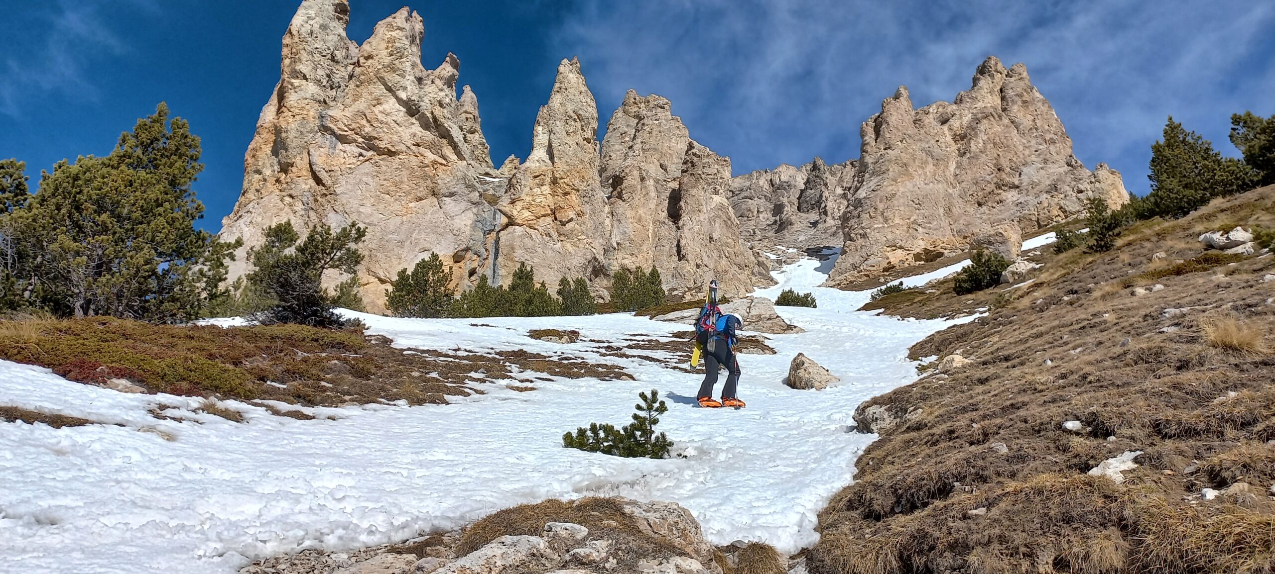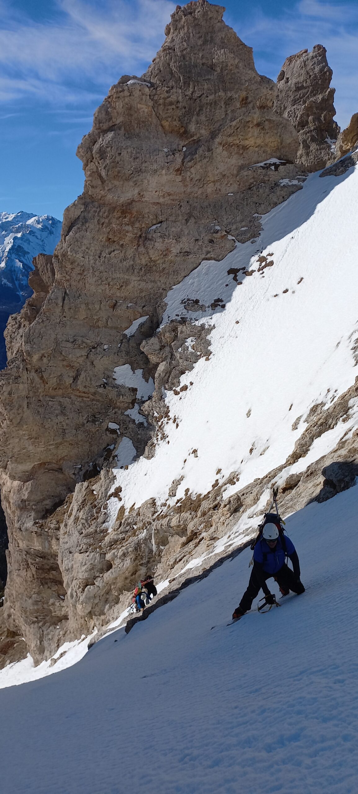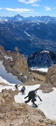 Scendere la ripida dorsale ricordandosi di non perdere troppo quota per riallacciarsi all’itinerario di salita.