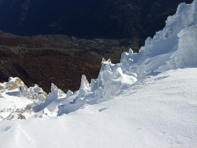 La discesa della ripida dorsale che parte dalla vetta nelle condizioni trovate oggi con neve dura ventata sono abbastanza impegnative.